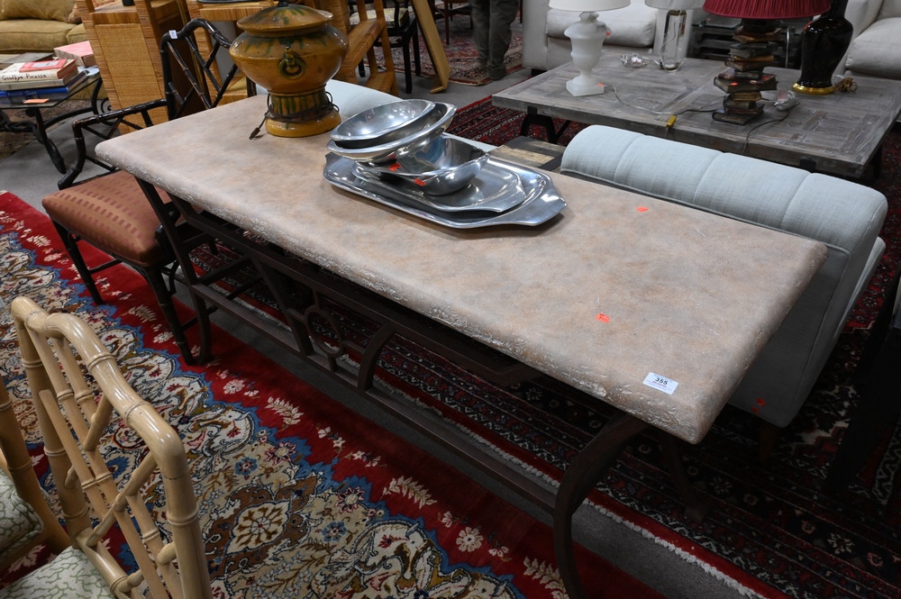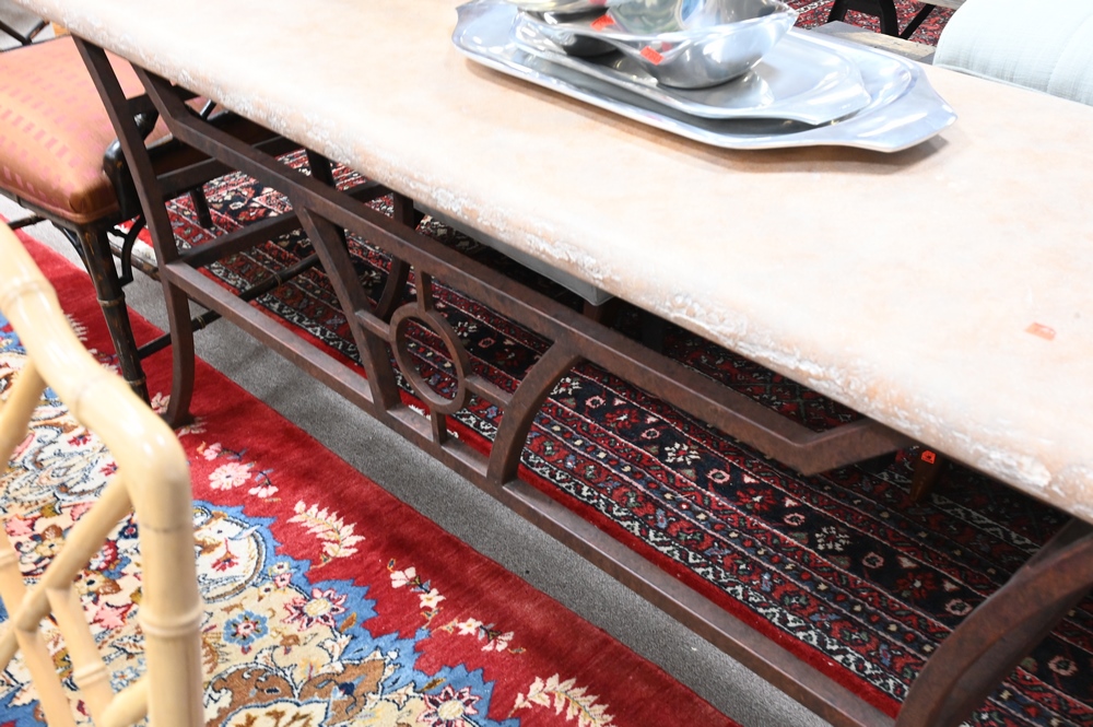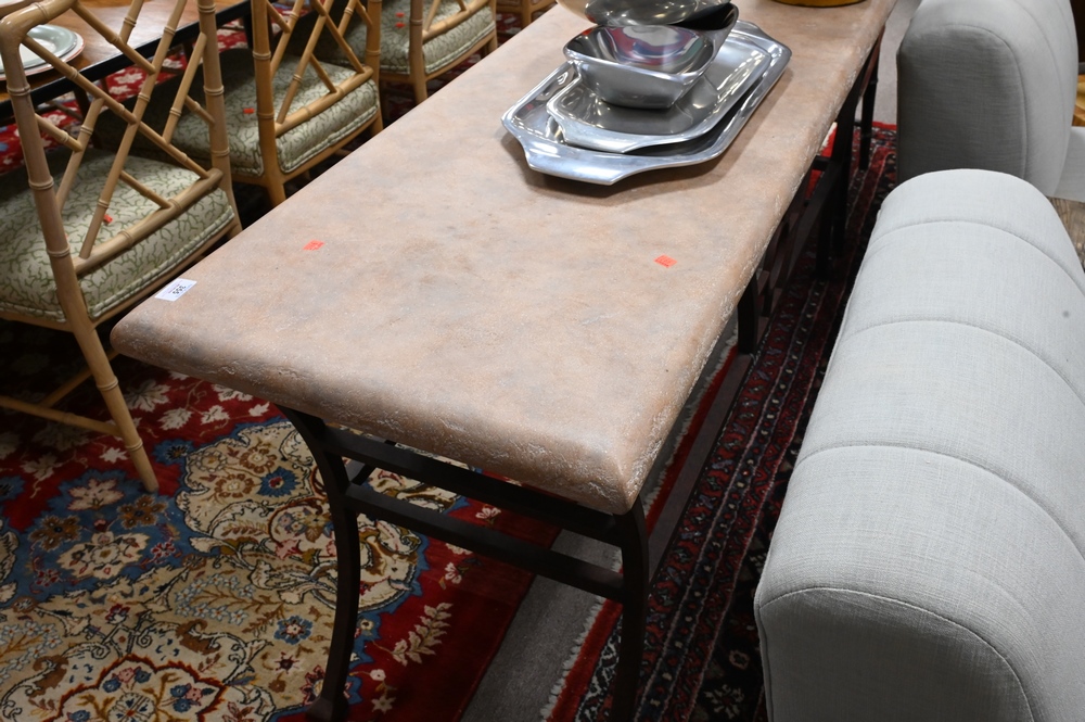 Lot 355: Contemporary Hall Table, with iron base, height 29 inches, top 22″ x 66″.
