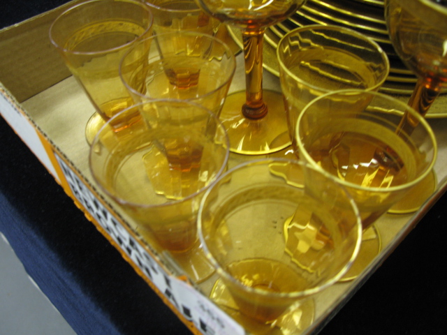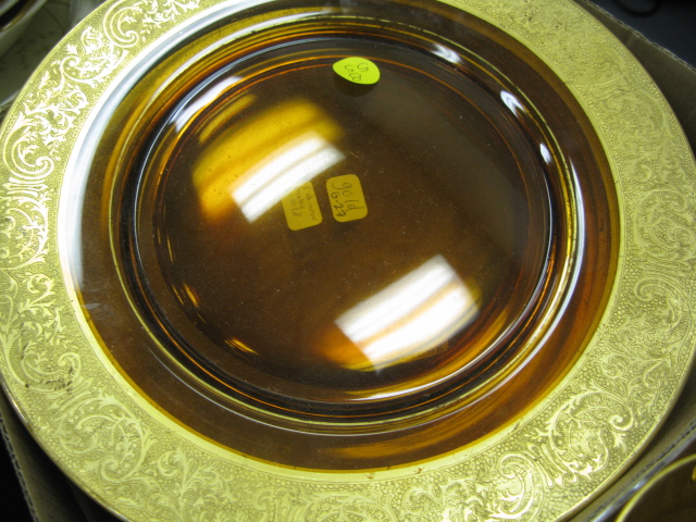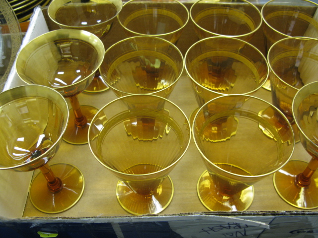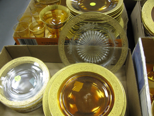 Four box lots of amber glass, including stems, various size plates, all with gold trim and some clear glass plates with gold trim.