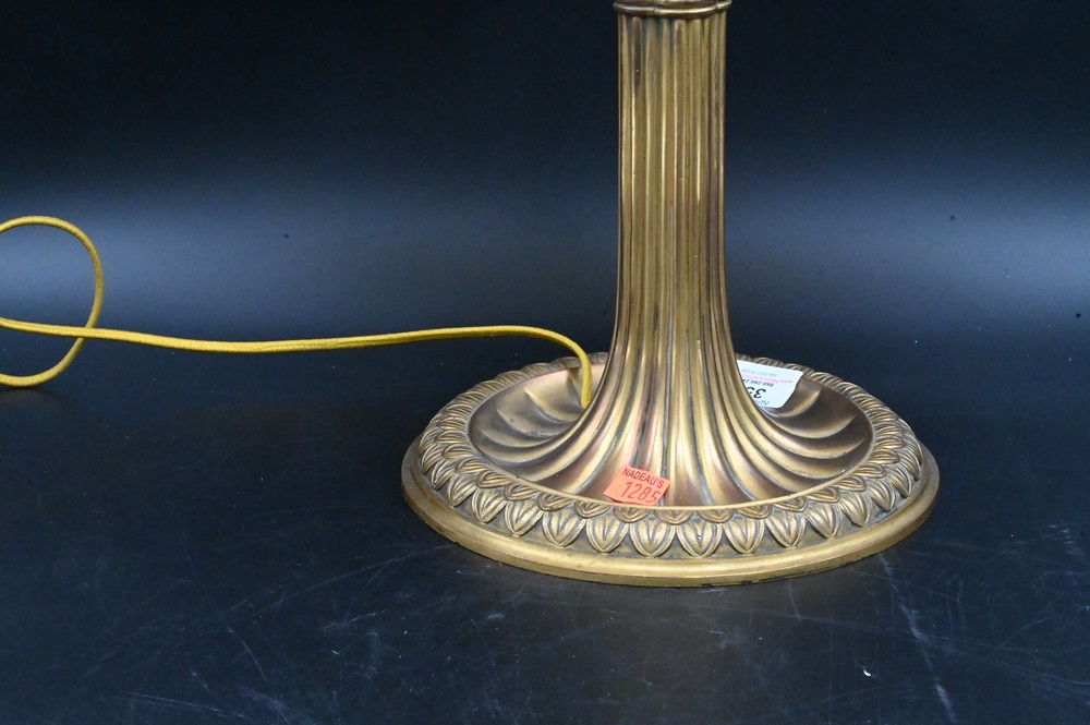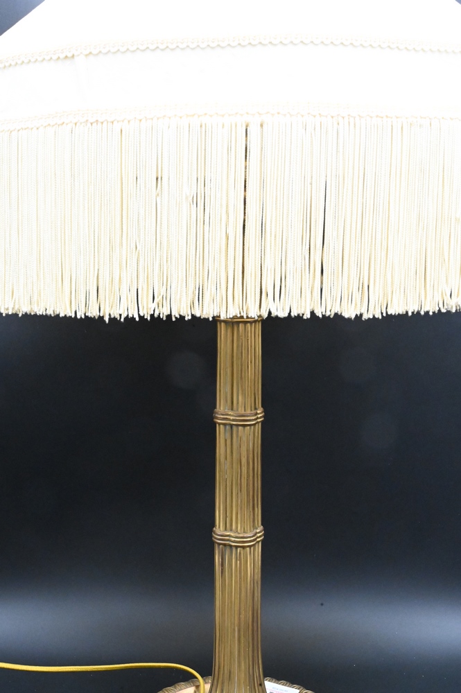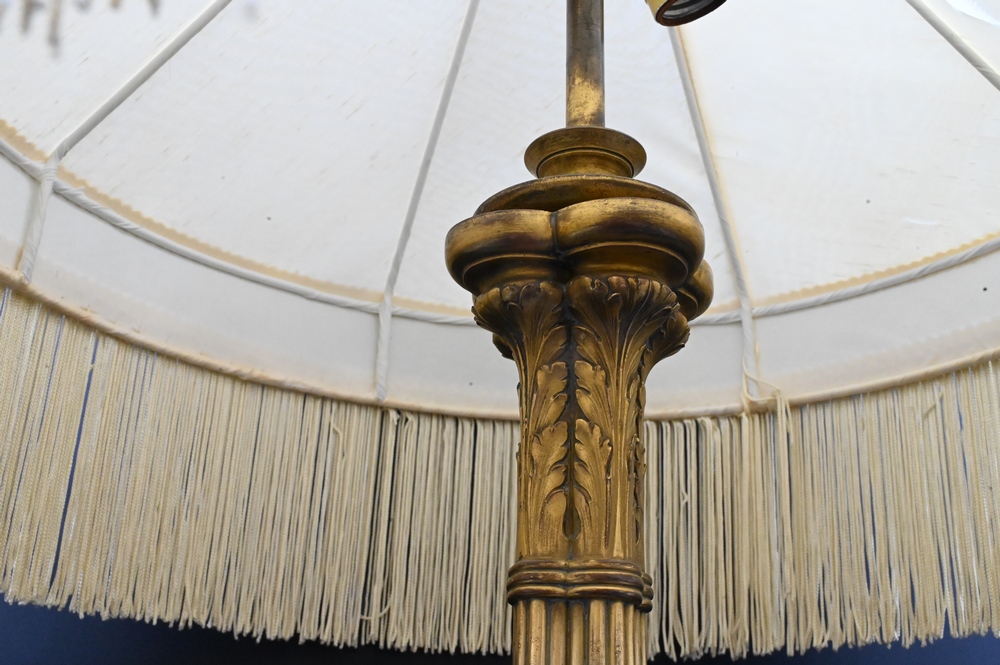 Gilt Bronze Candlestick Style Table Lamp, having silk shade, total height 29 inches.