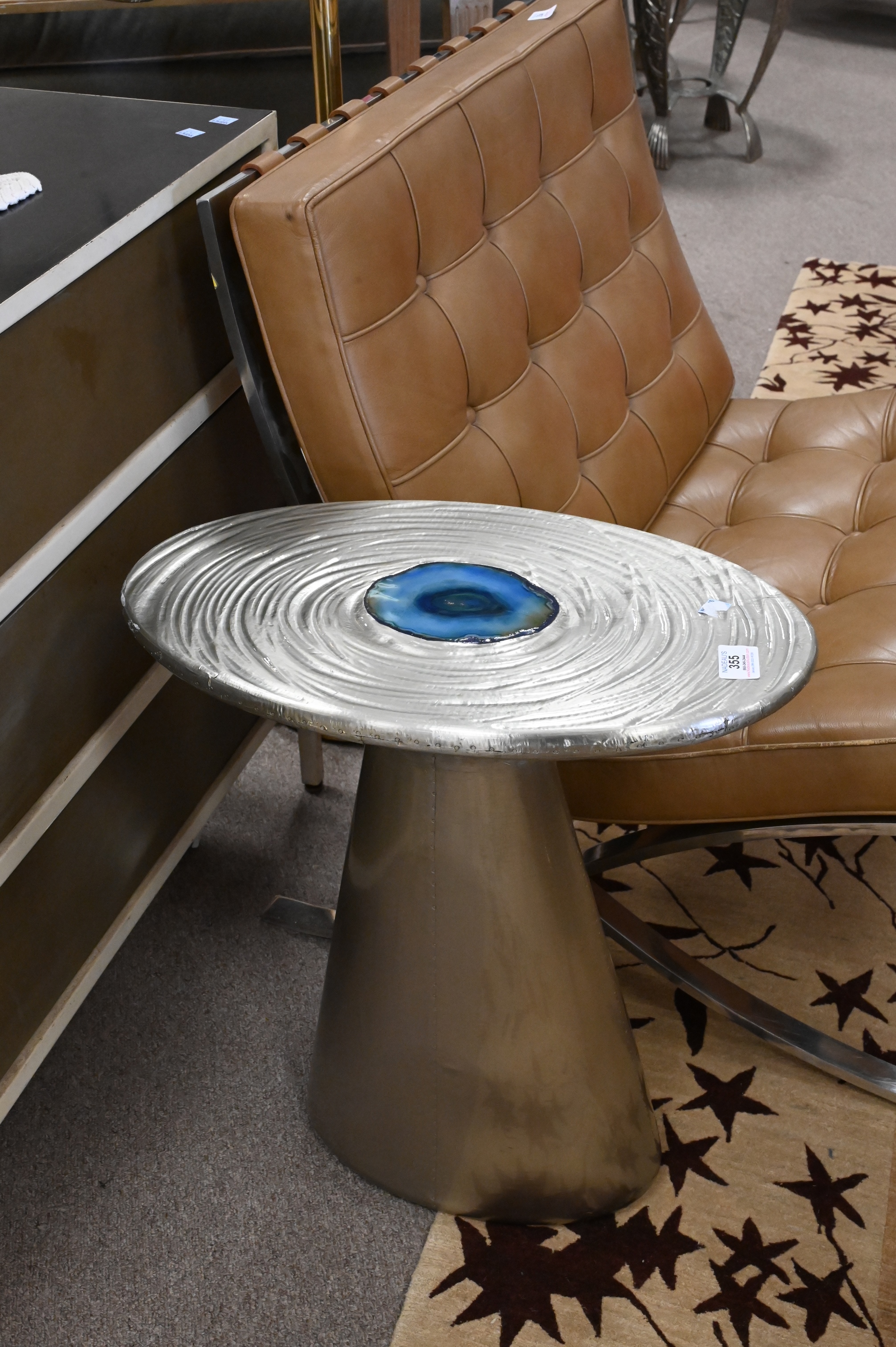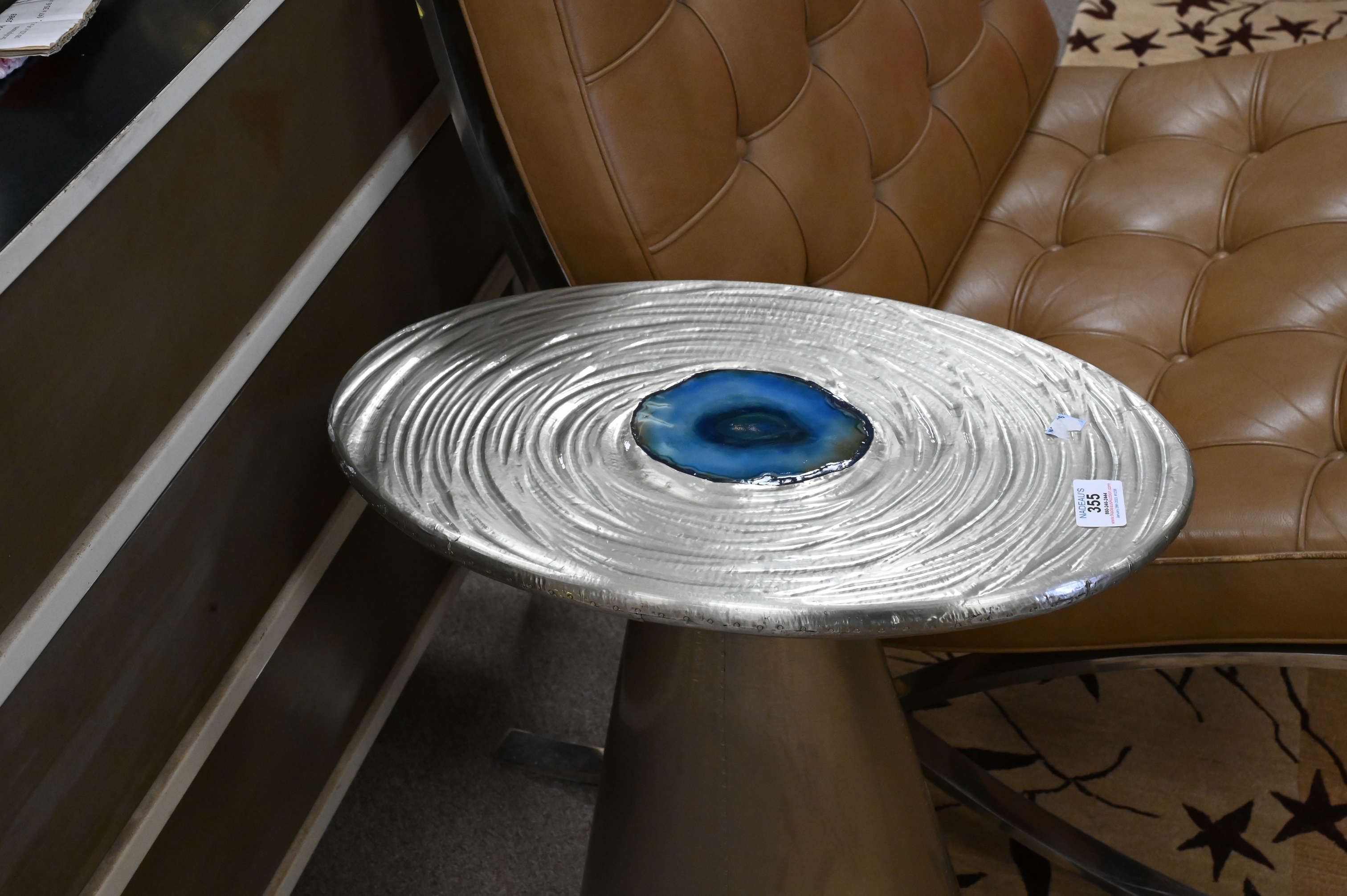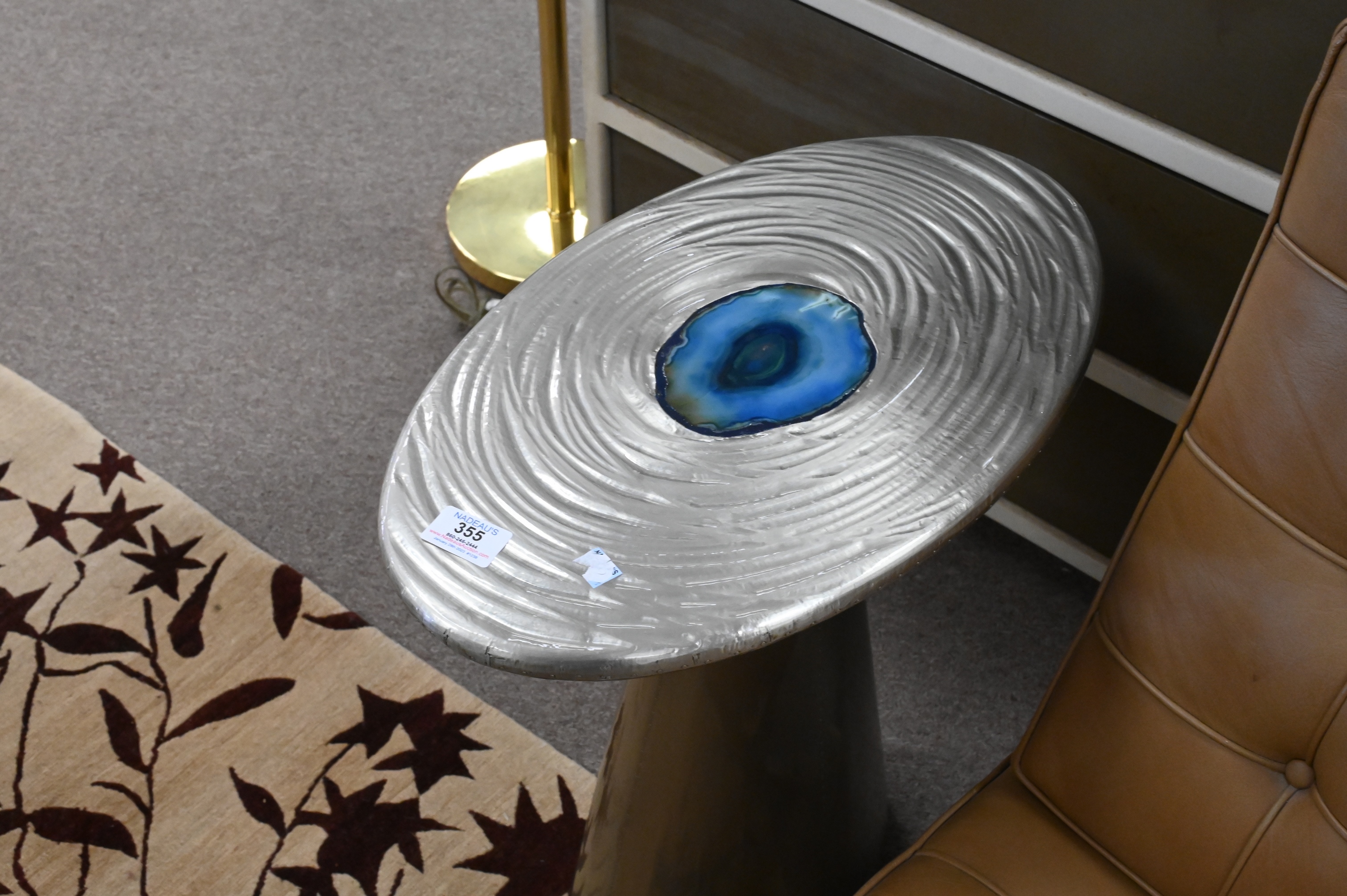 Global Views Studio A Home Side Table, oval top mounted with blue quartz stone, height 22 inches, top 11 1/2″ x 19 1/2″.