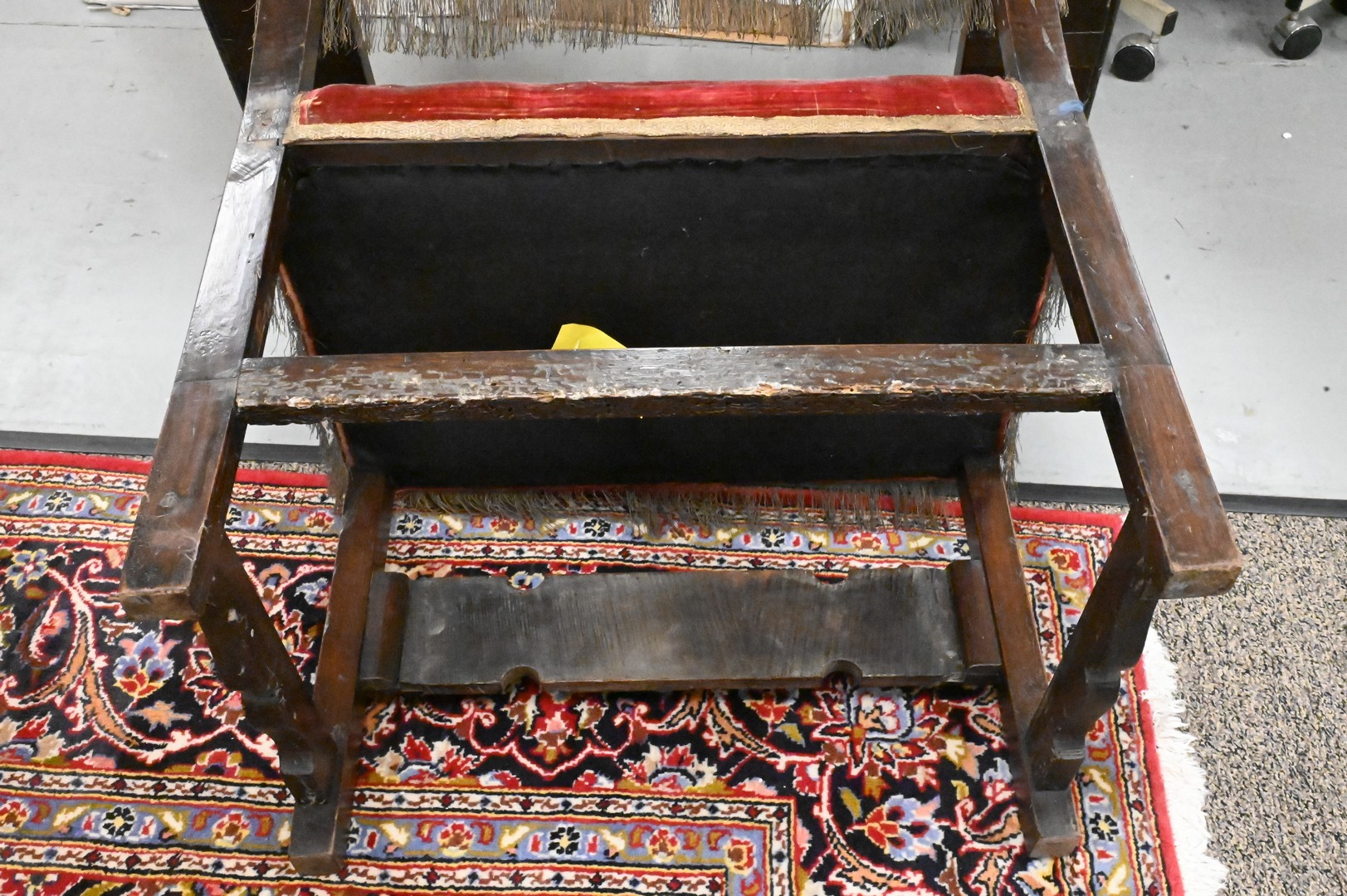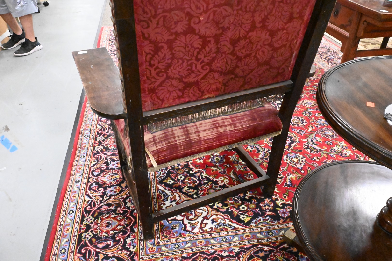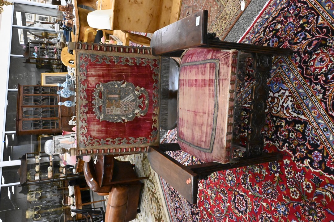 Pair of Walnut Continental Style Armchairs, having brass finials, early upholstery with center coat of arms, (restored or made up of old elements), height 51 inches, width 36 inches.