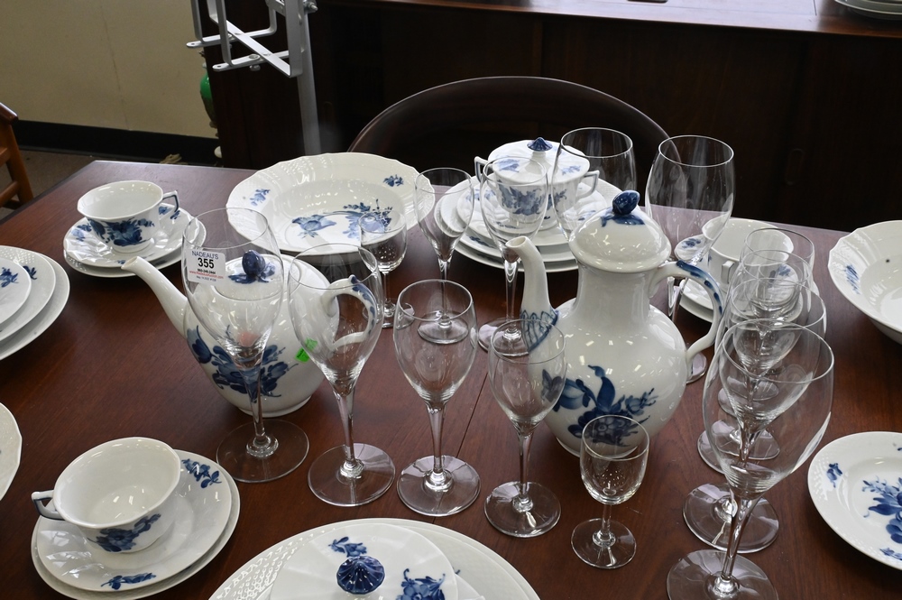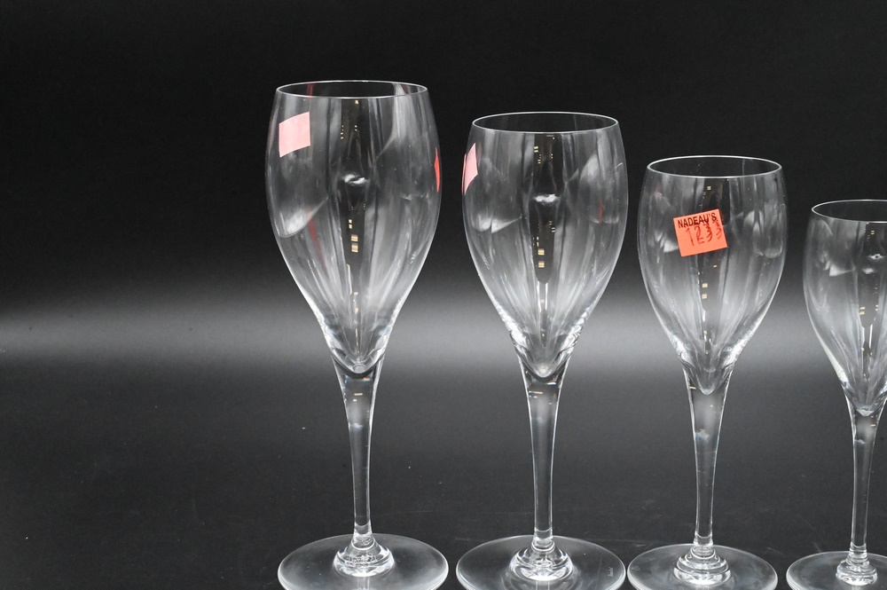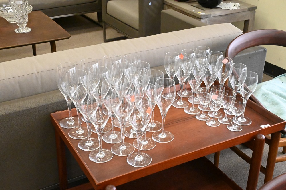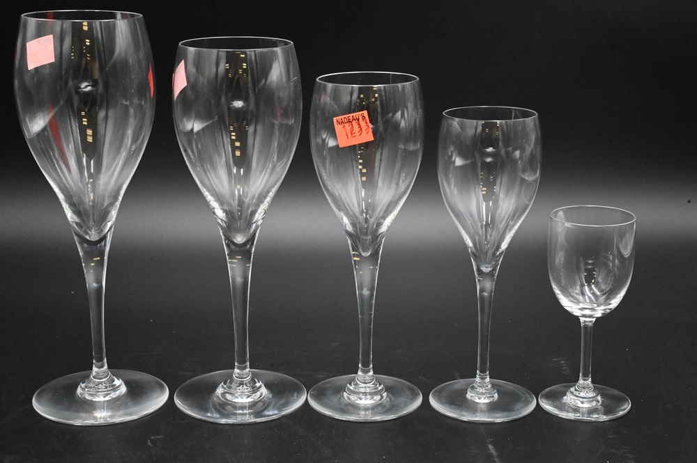 Lot 355: Set of 53 Baccarat Crystal Stems, to include 10 water goblets, 15 red wine, 13 white wine, 6 sherry, along with 9 sour glasses.