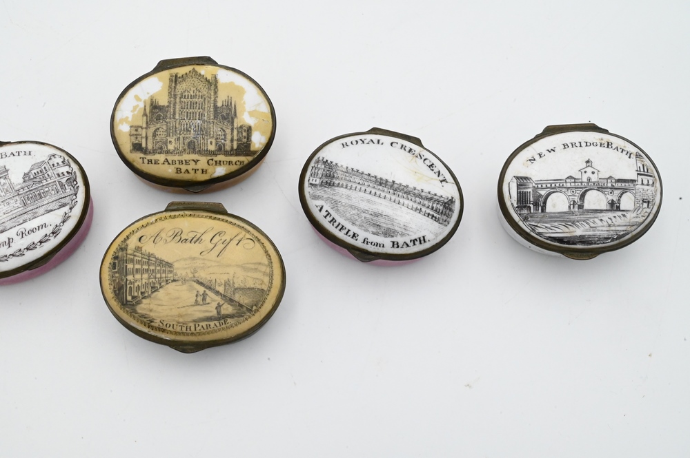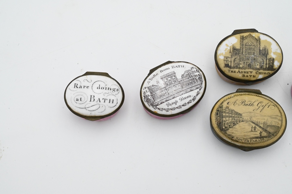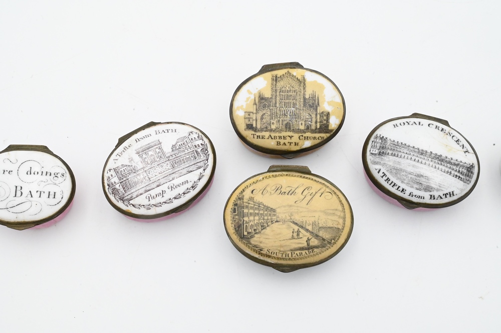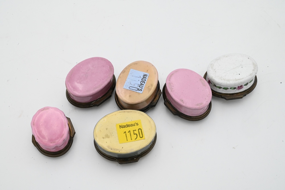 Six Bilston Boxes, from Bath, to include two with receipts, D.M. & P,. Manheim, 1977 and None Such Antiques, 1974, height 3/4 inches, width 1 3/4 inches. Provenance: Estate of Wallace Bradway, New Haven, CT.