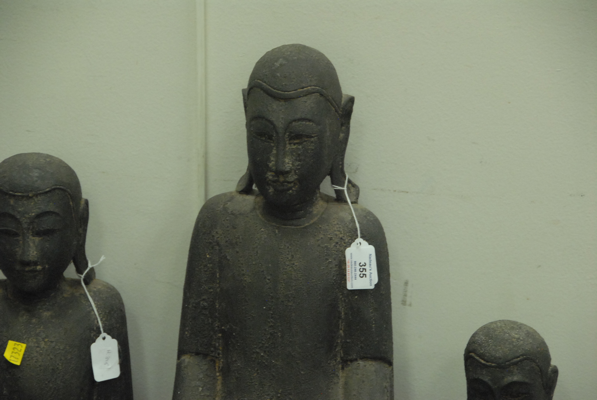 Lot 355: Three standing carved wood Oriental figures holding a pot in black paint. ht. 30 in., ht. 35 in., & ht. 39 in.