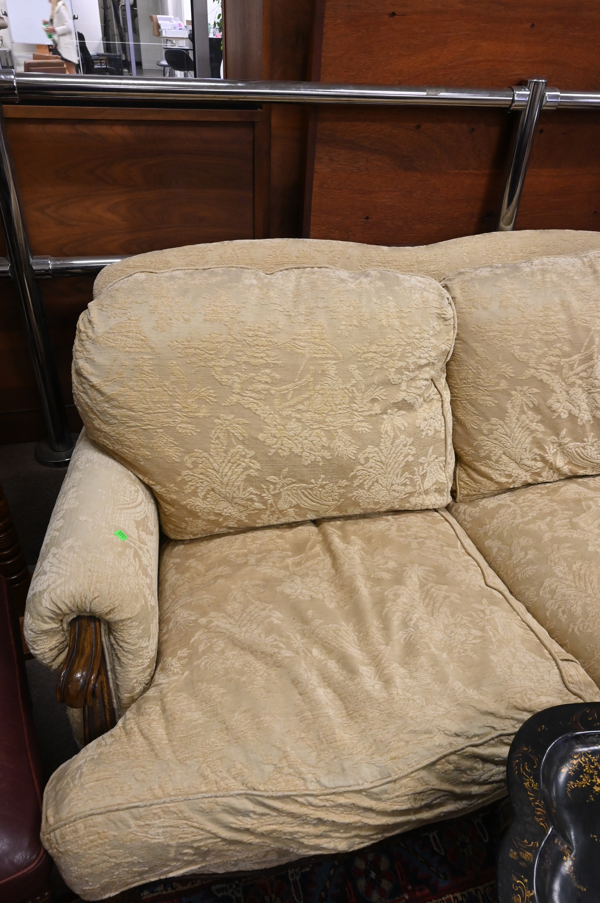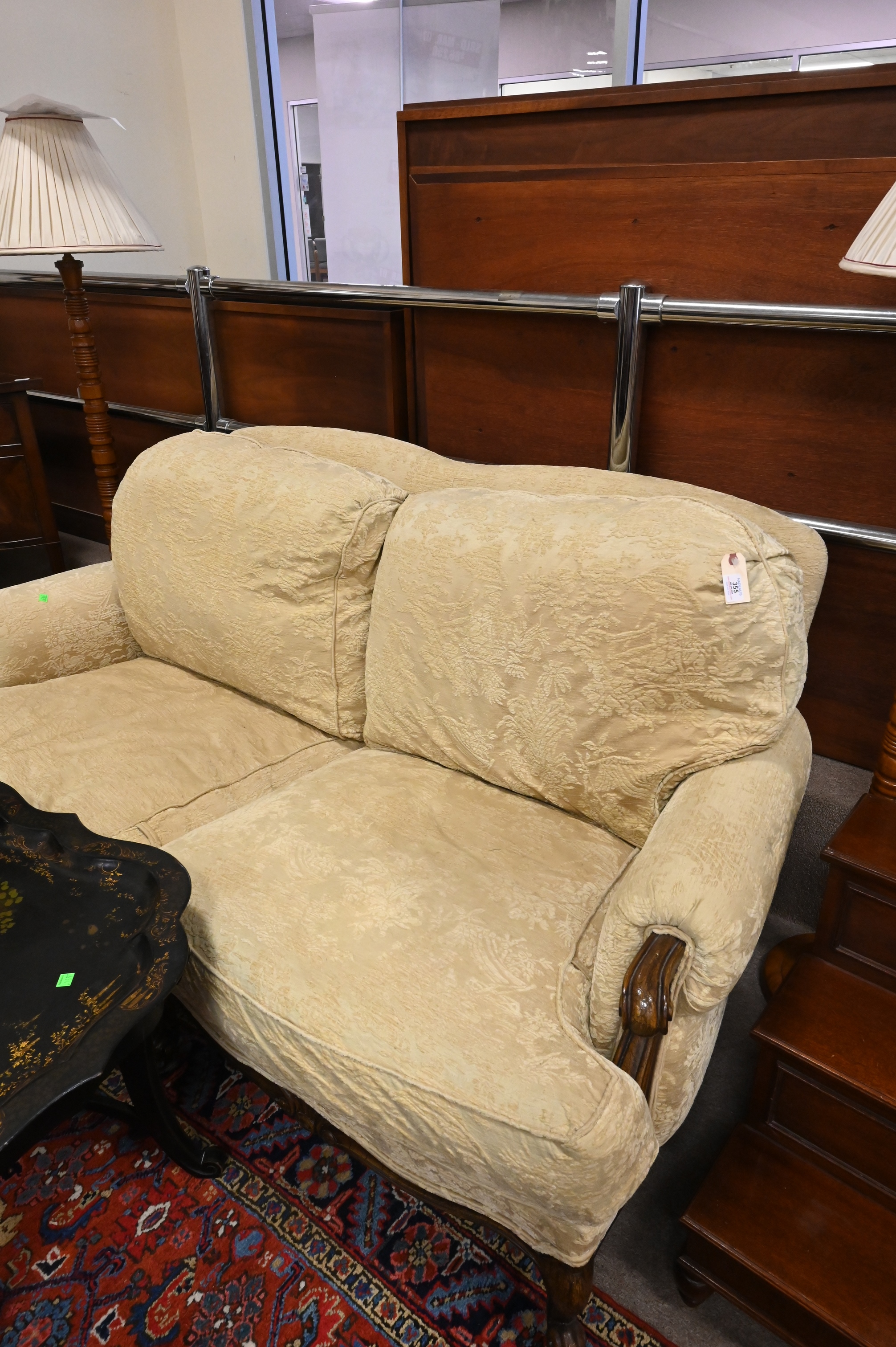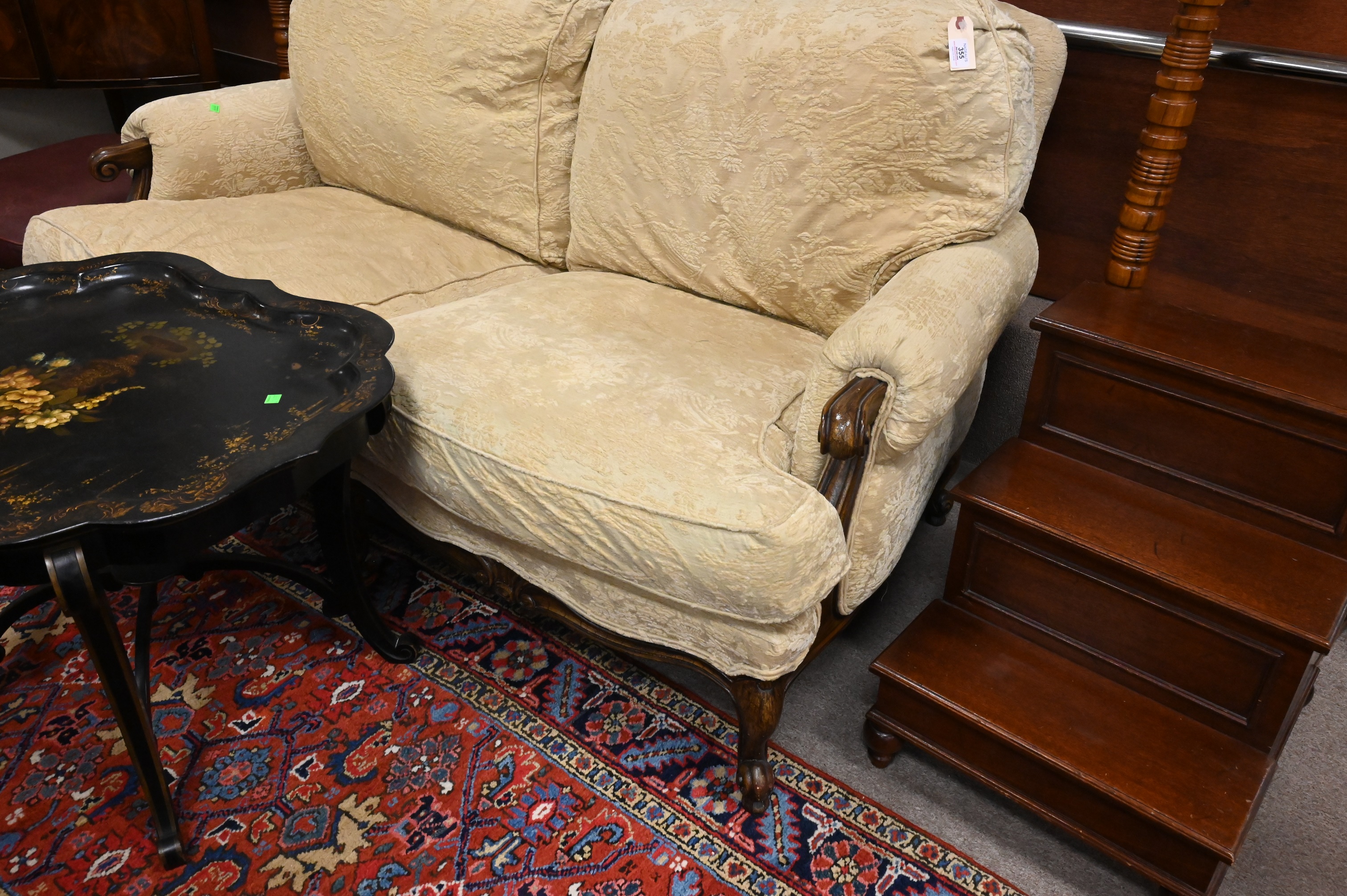 Upholstered Loveseat, set on carved frame ending in cabriole legs, height 36 inches, length 68 inches.