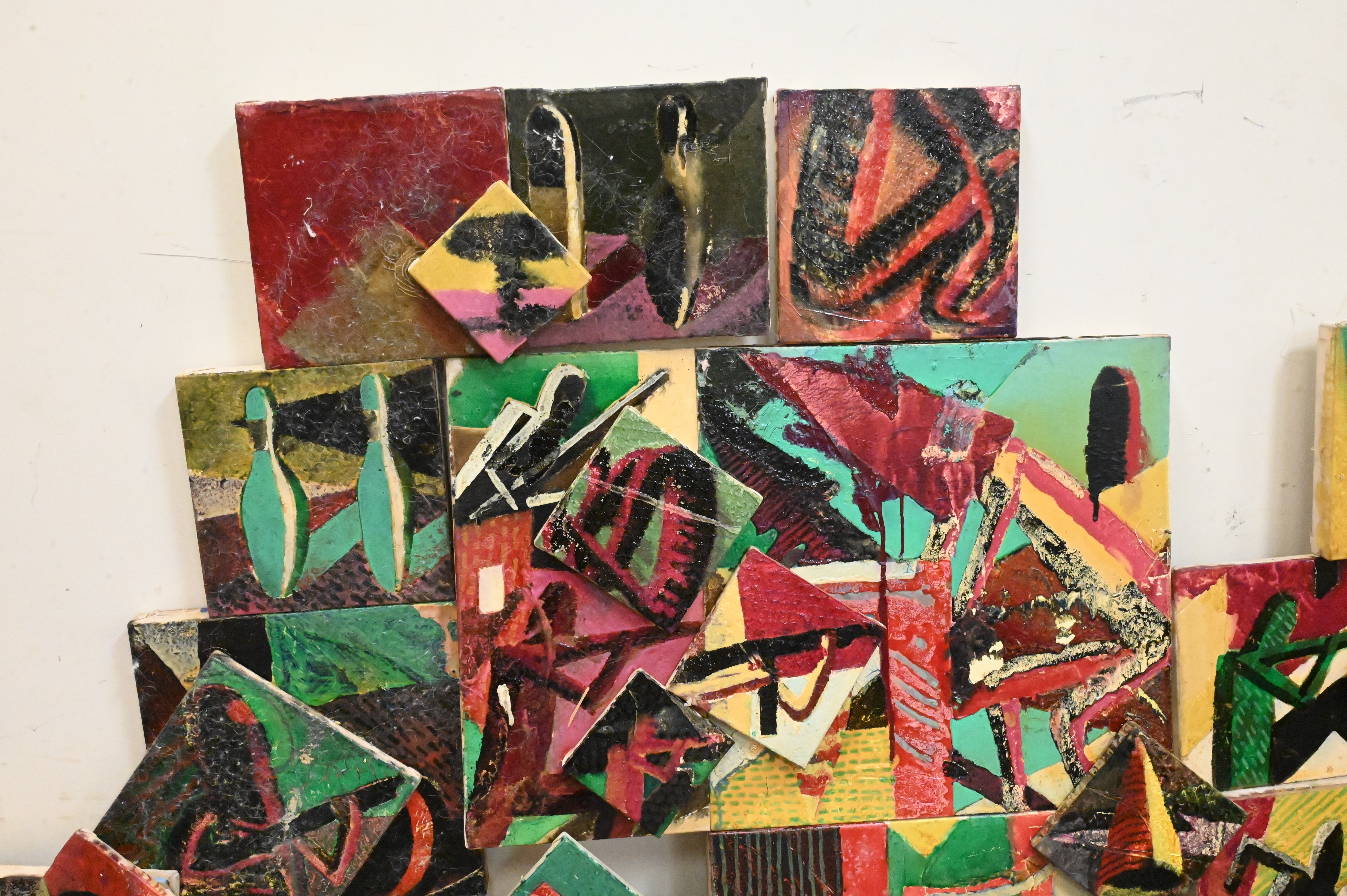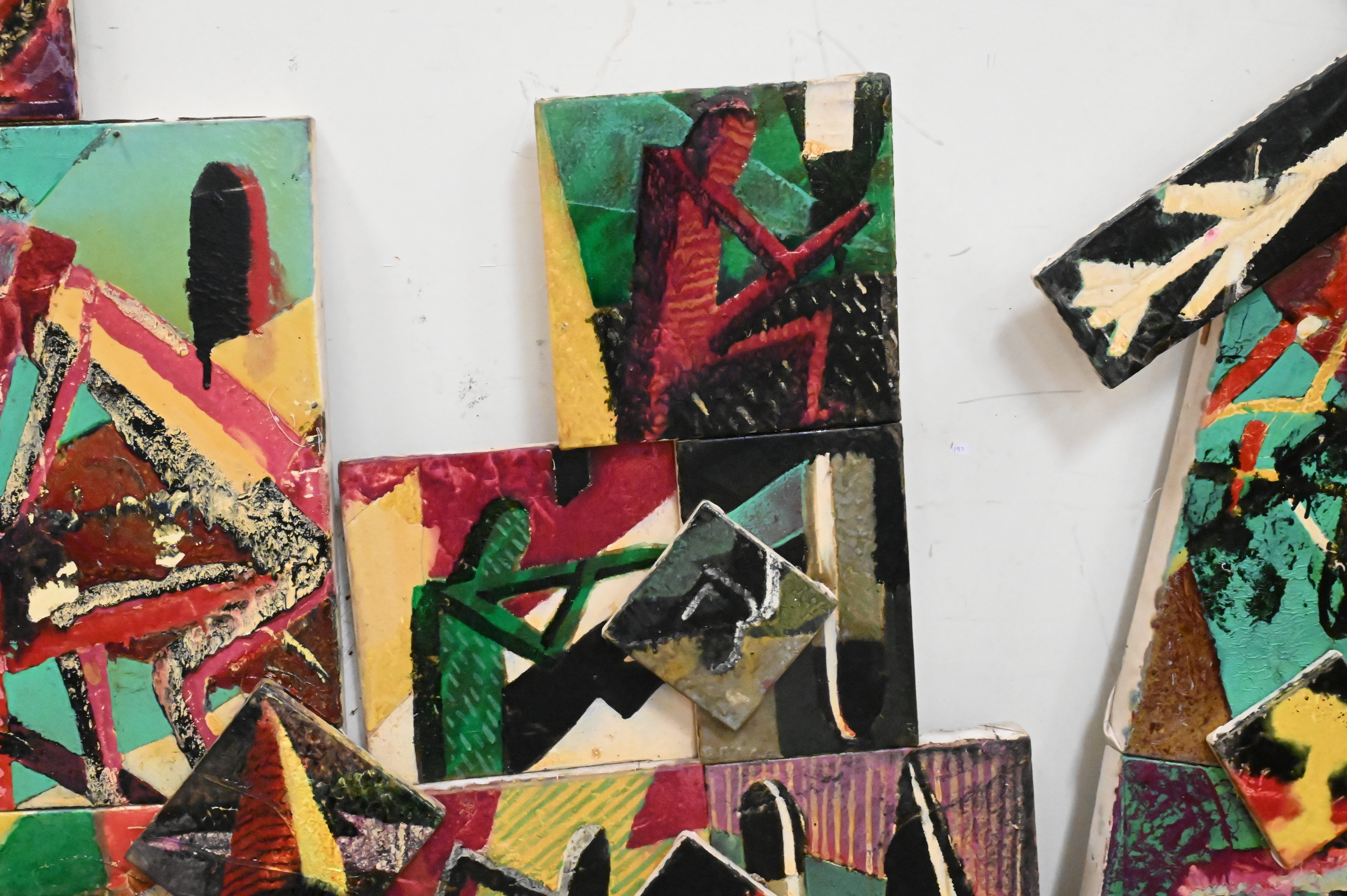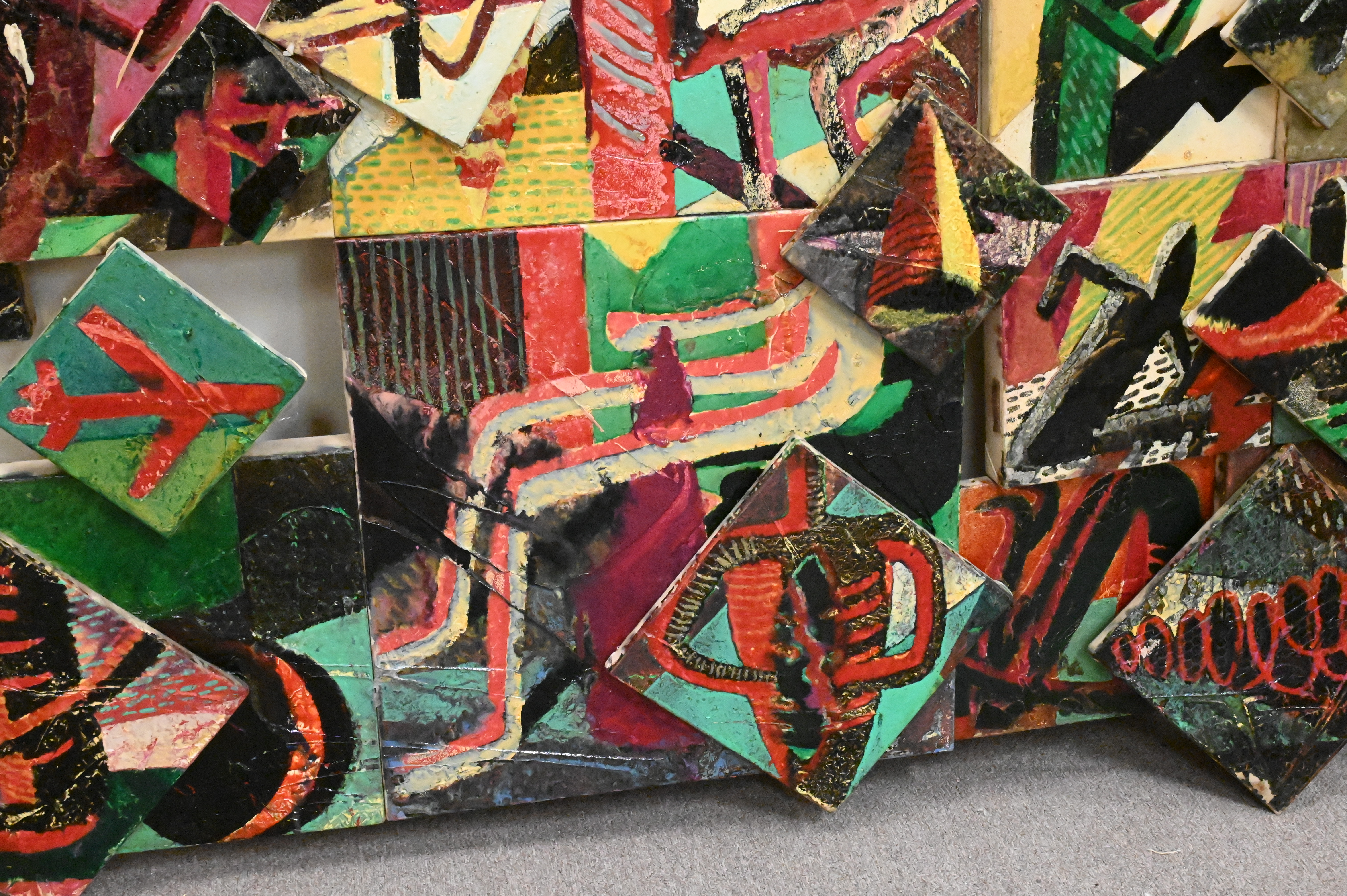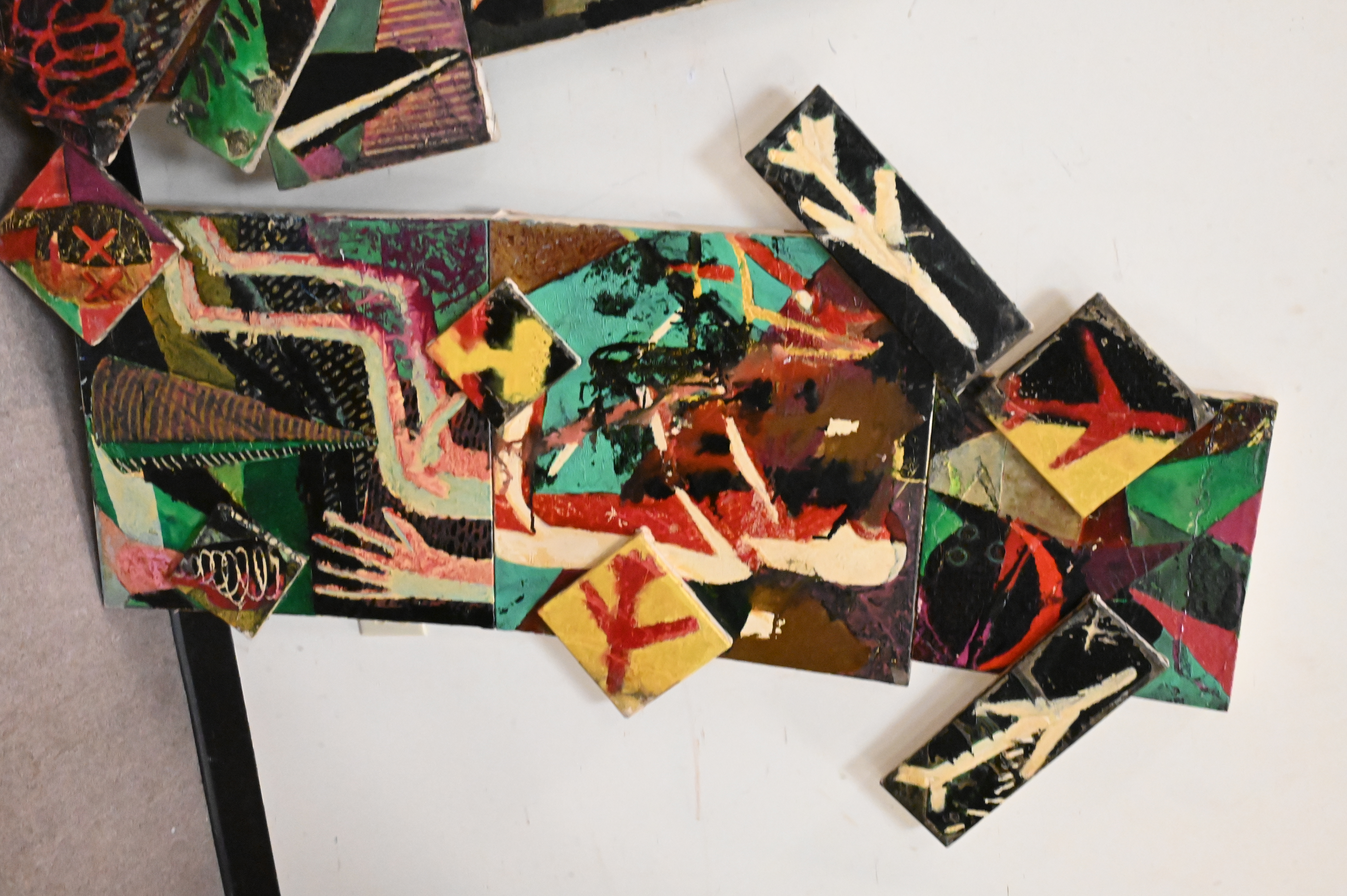 Mixed media installation piece, acrylic, oil, paper on multiple canvases