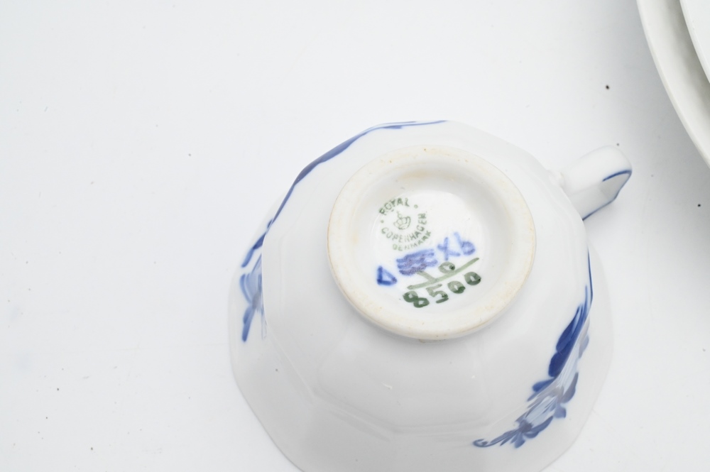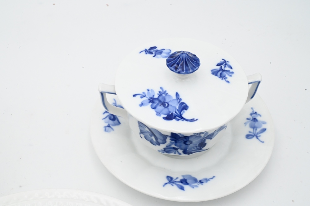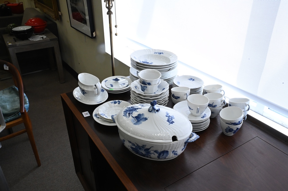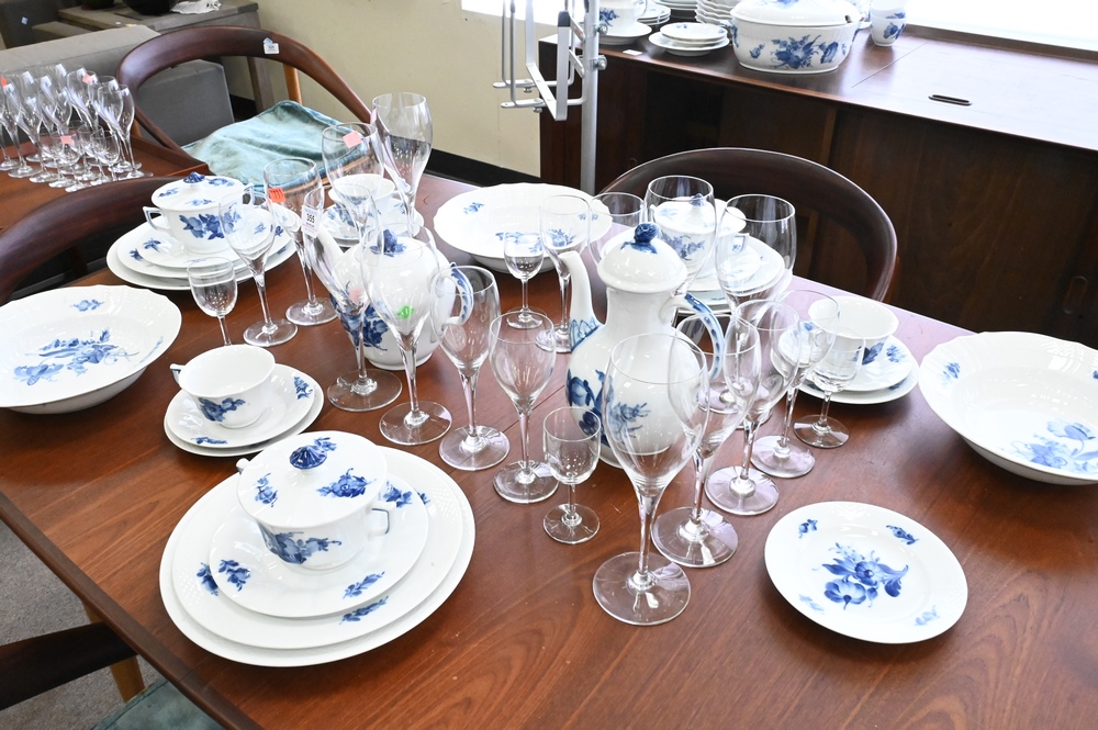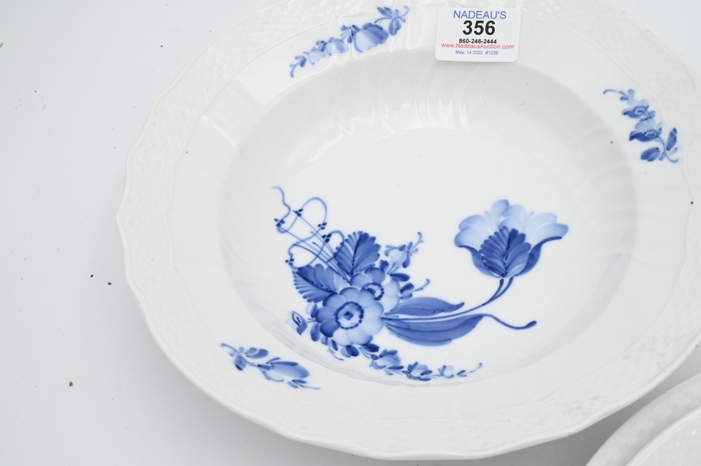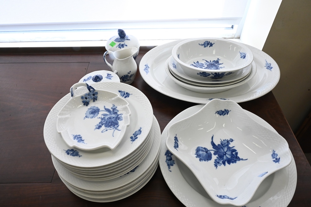 Lot 356: 111 Piece Set of Royal Copenhagen Porcelain, “Blue Flower” pattern, to include 9 dinner plates, 10 luncheon plates, 7 salad plates, 7 bread plates, 8 rimmed soup bowls, 7 berry/cereal bowls, 11 teacups, 6 coffee cups, 5 soup tureens, 1 coffee pot, 1 teapot, 1 sugar, 1 creamer, 1 gravy boat, 1 large tureen, 7 serving pieces, 17 tea saucers, 6 coffee saucers, 5 under plates along with 1 lid.