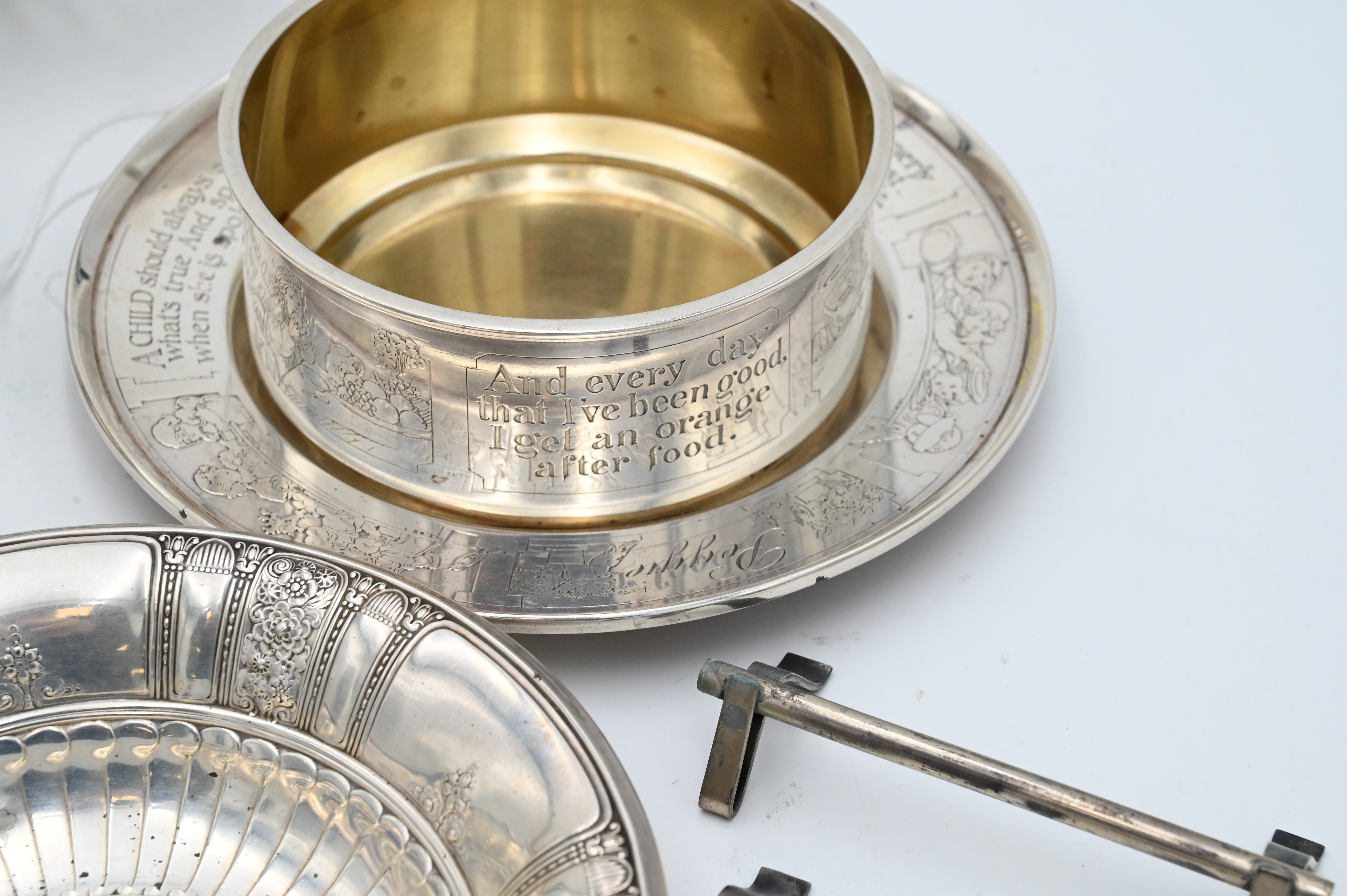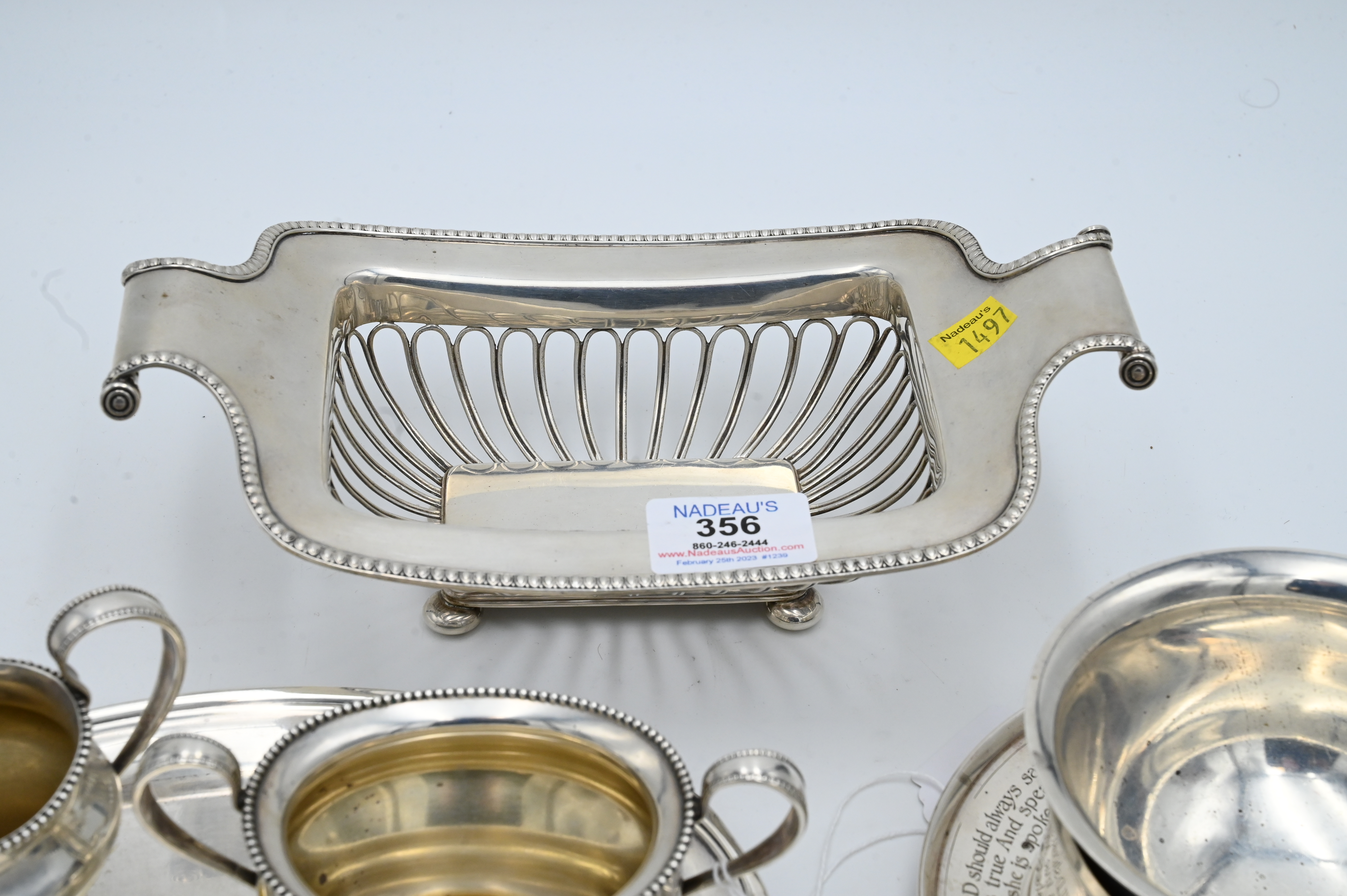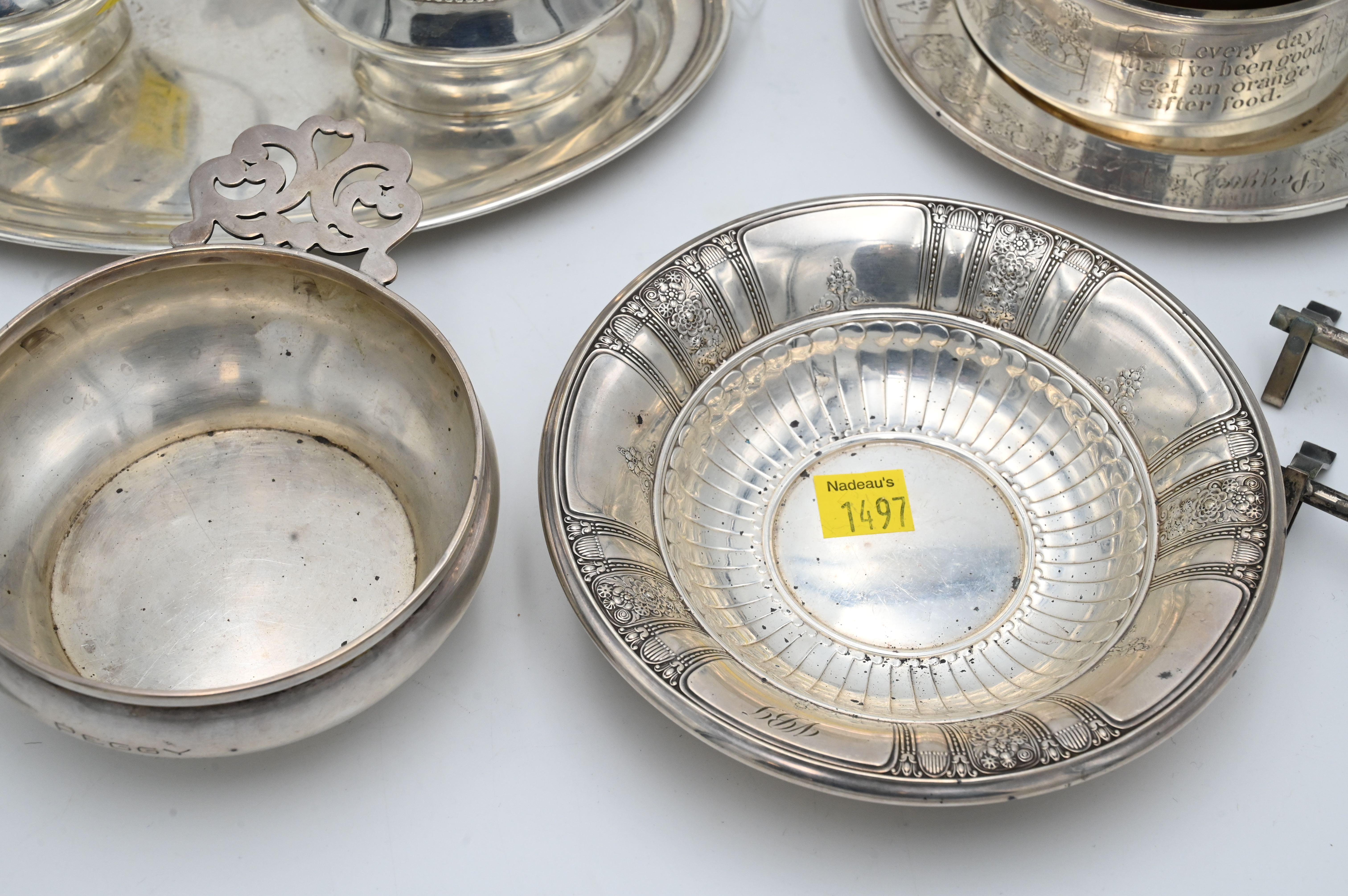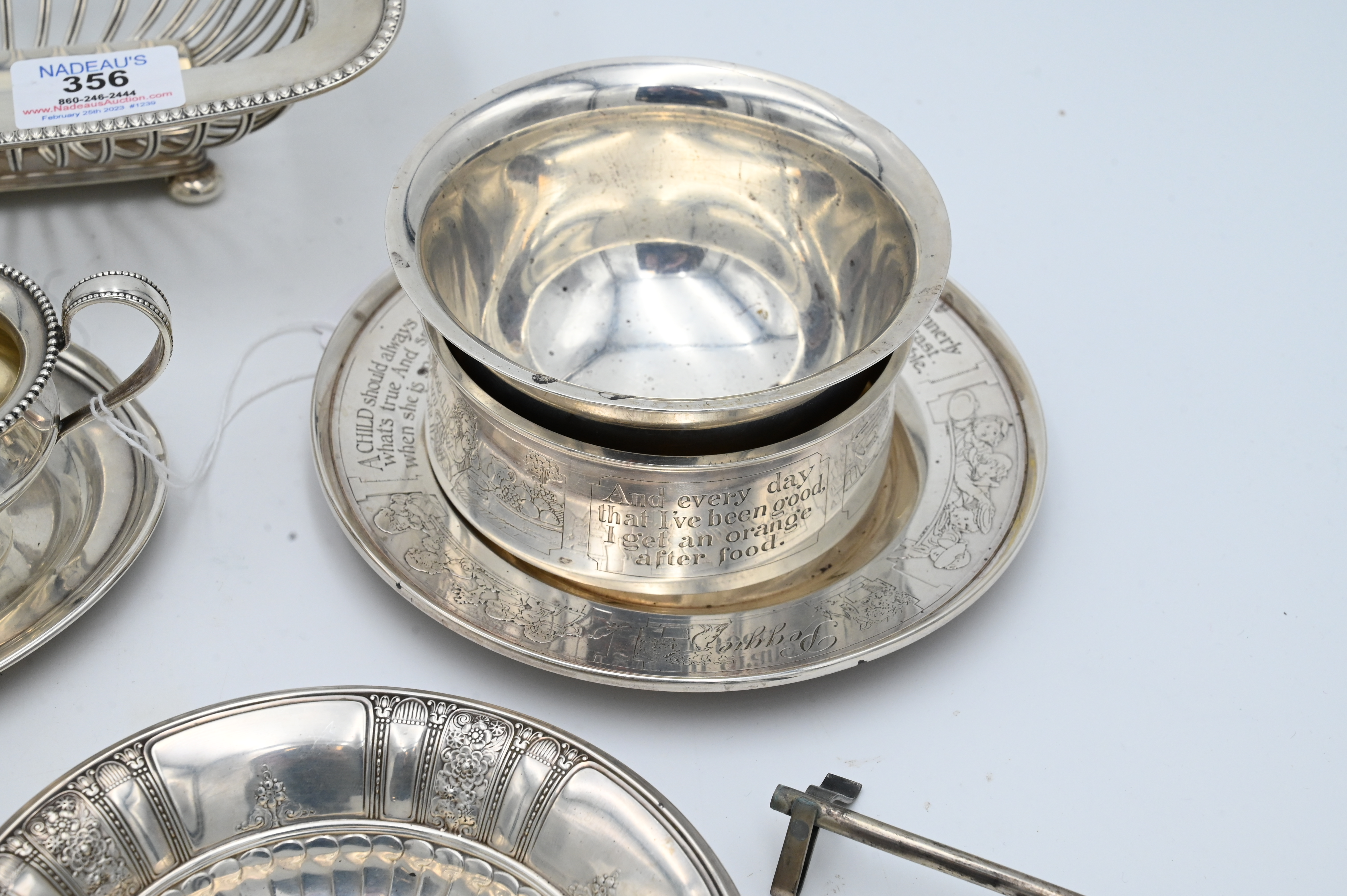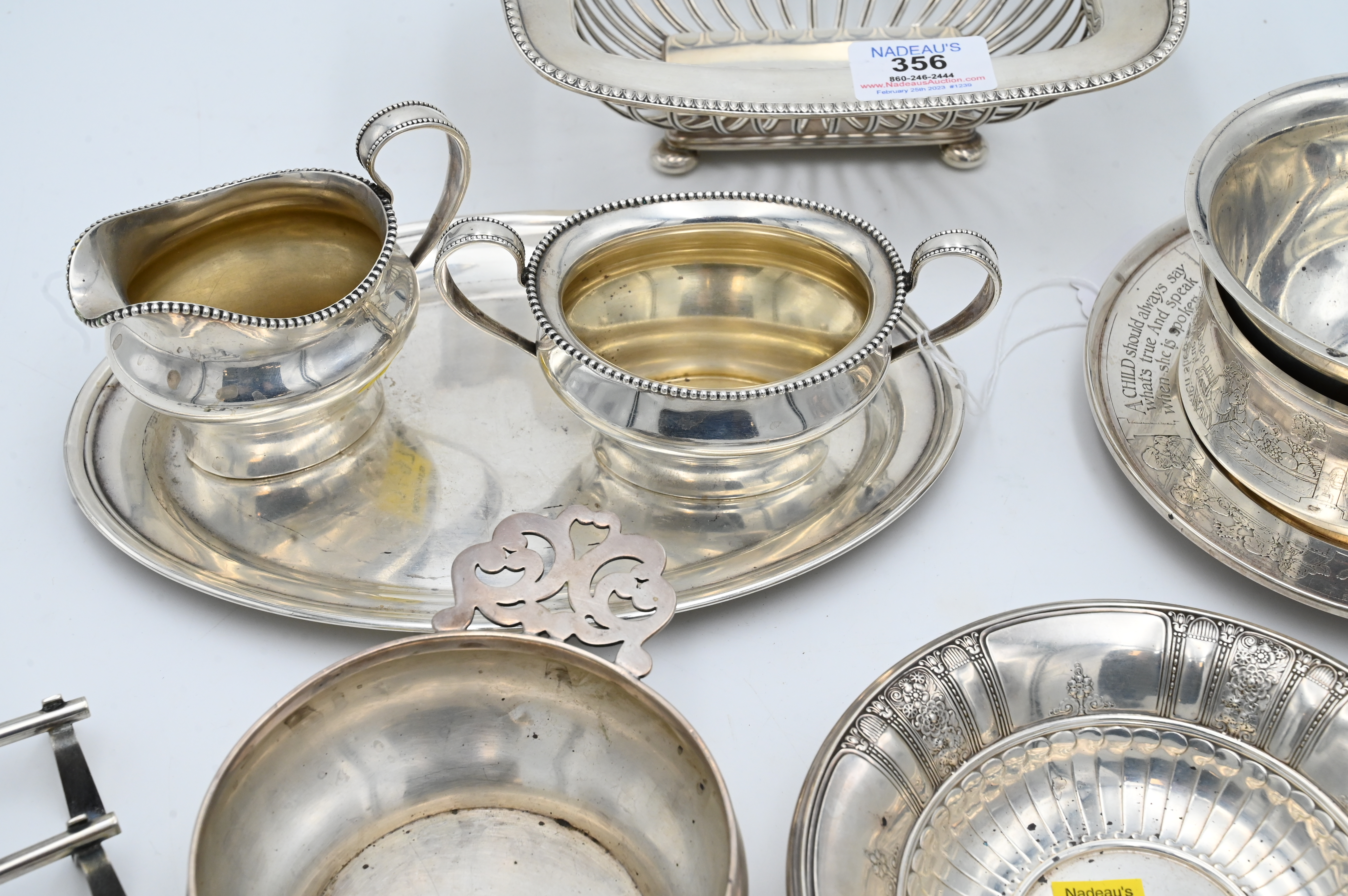 14 Piece Sterling Silver Lot, to include a Gorham child’s bowl and underplate with poem, 3 bowls, a sugar and creamer, basket, oval tray, along with 5 place card holders, all marked sterling or 925, 45.3 t.oz.