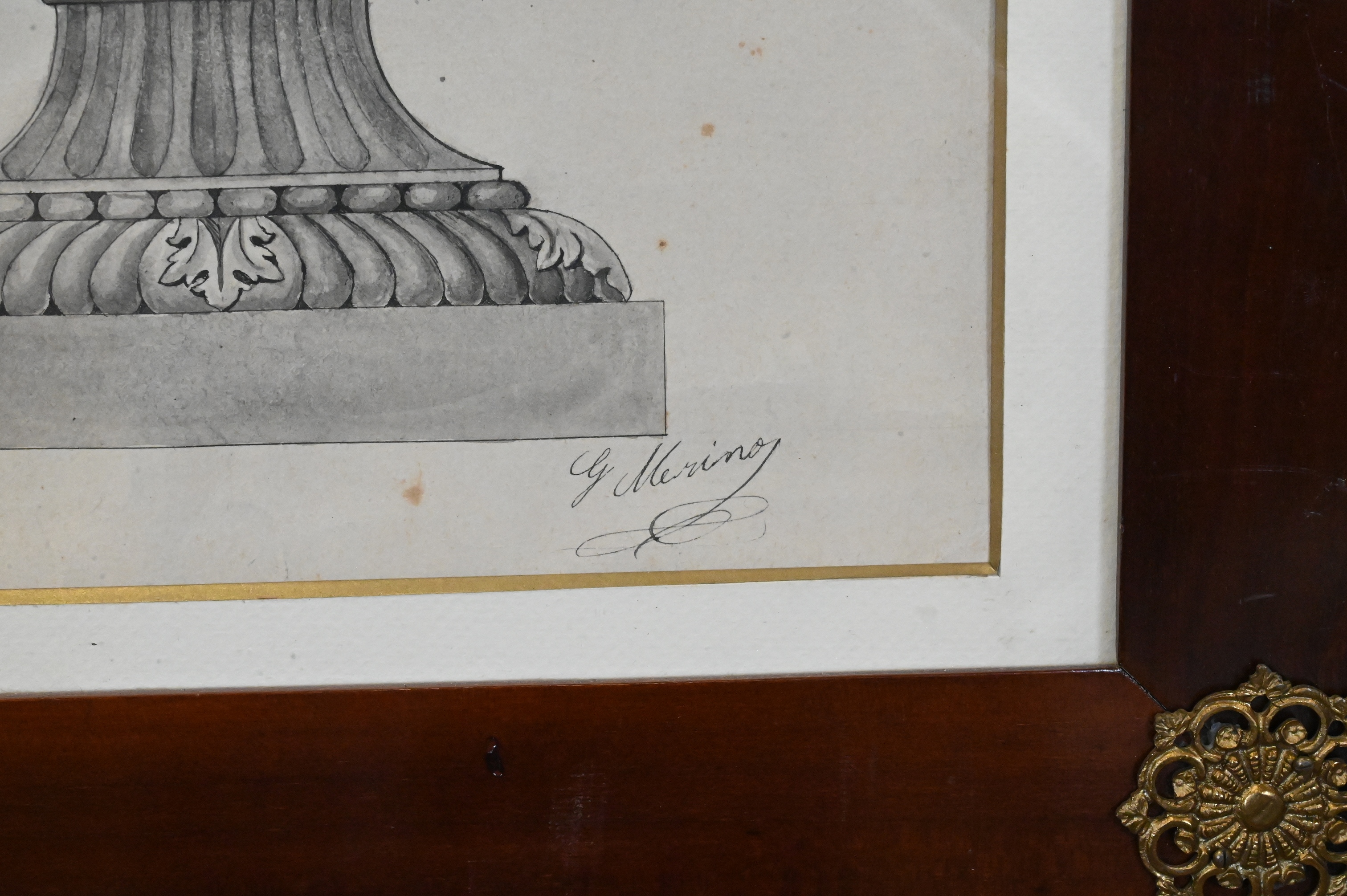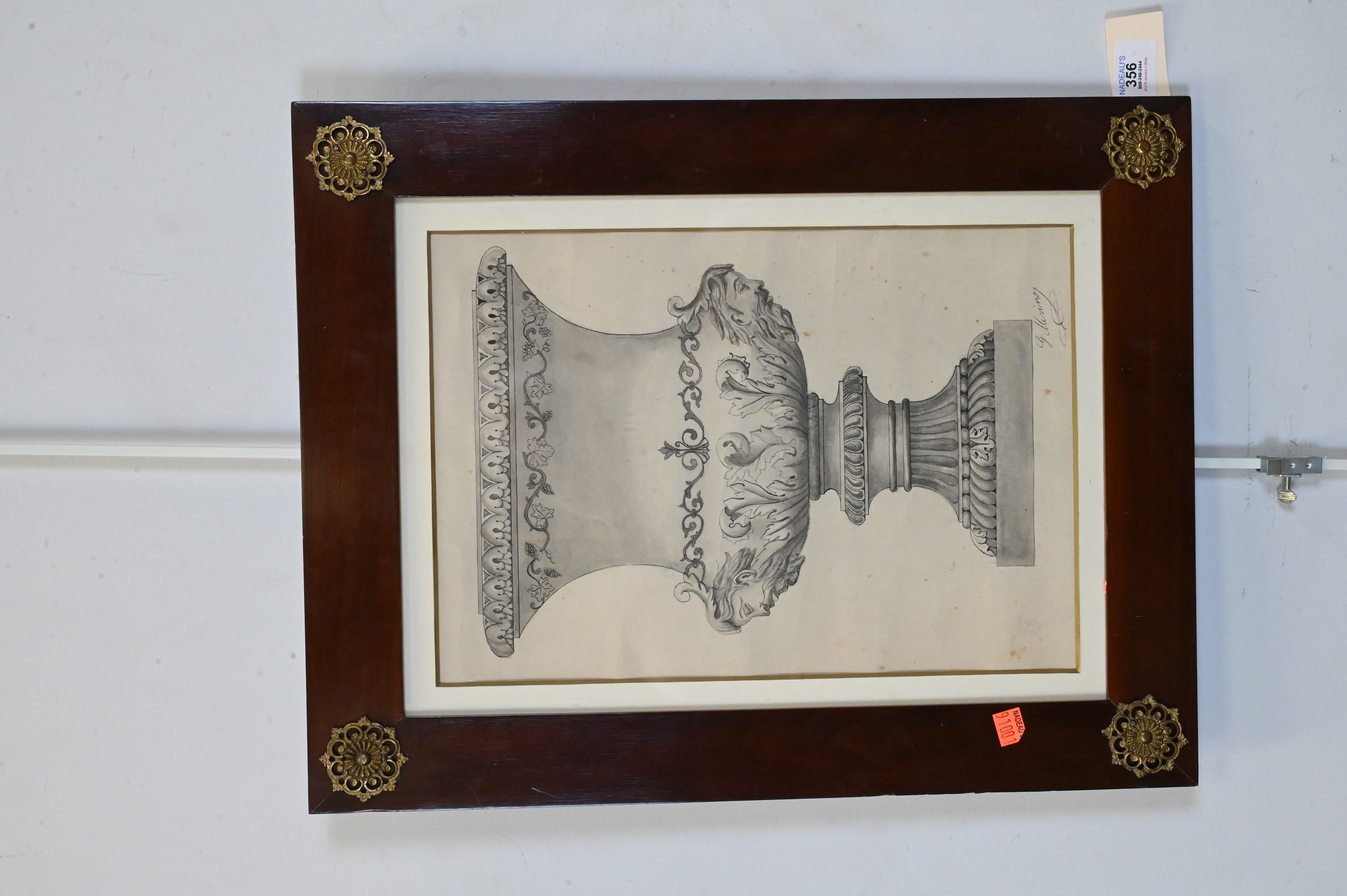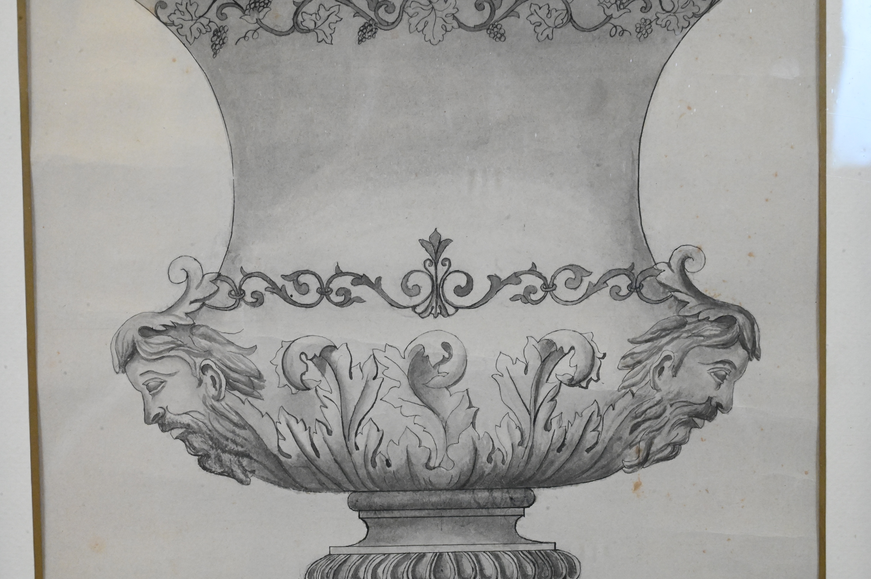 depicting a large neoclassical urn with figural masks, acanthus leaves, and grapevine ornamentation; the design is executed with architectural precision and decorative refinement, suggesting a presentation drawing for a bronze or marble vessel