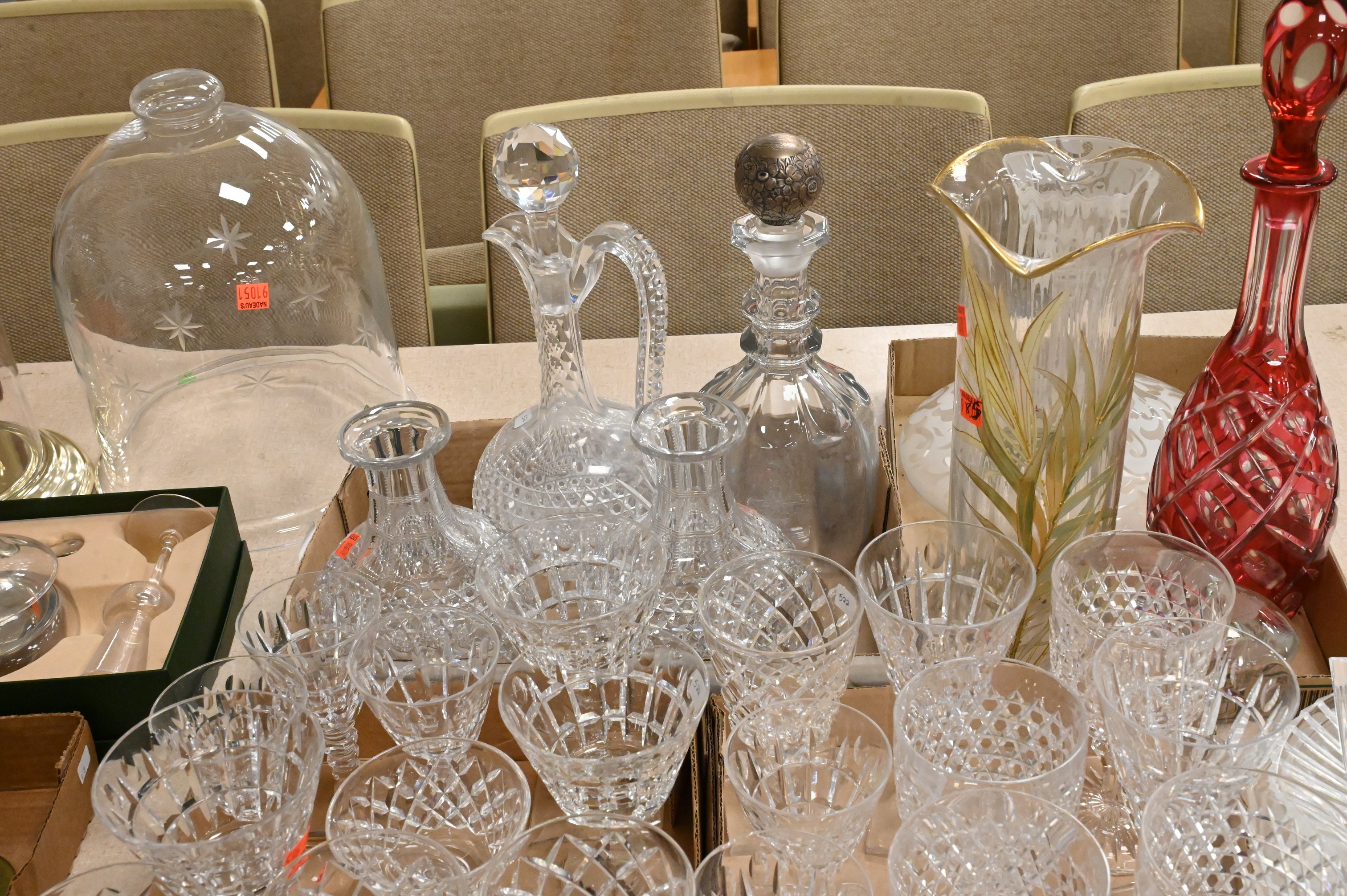 cut glass stems, decanters, one with sterling silver stopper, cranberry cut to clear decanter, Tiffany crystal vase, three Steuben plates with etched designs