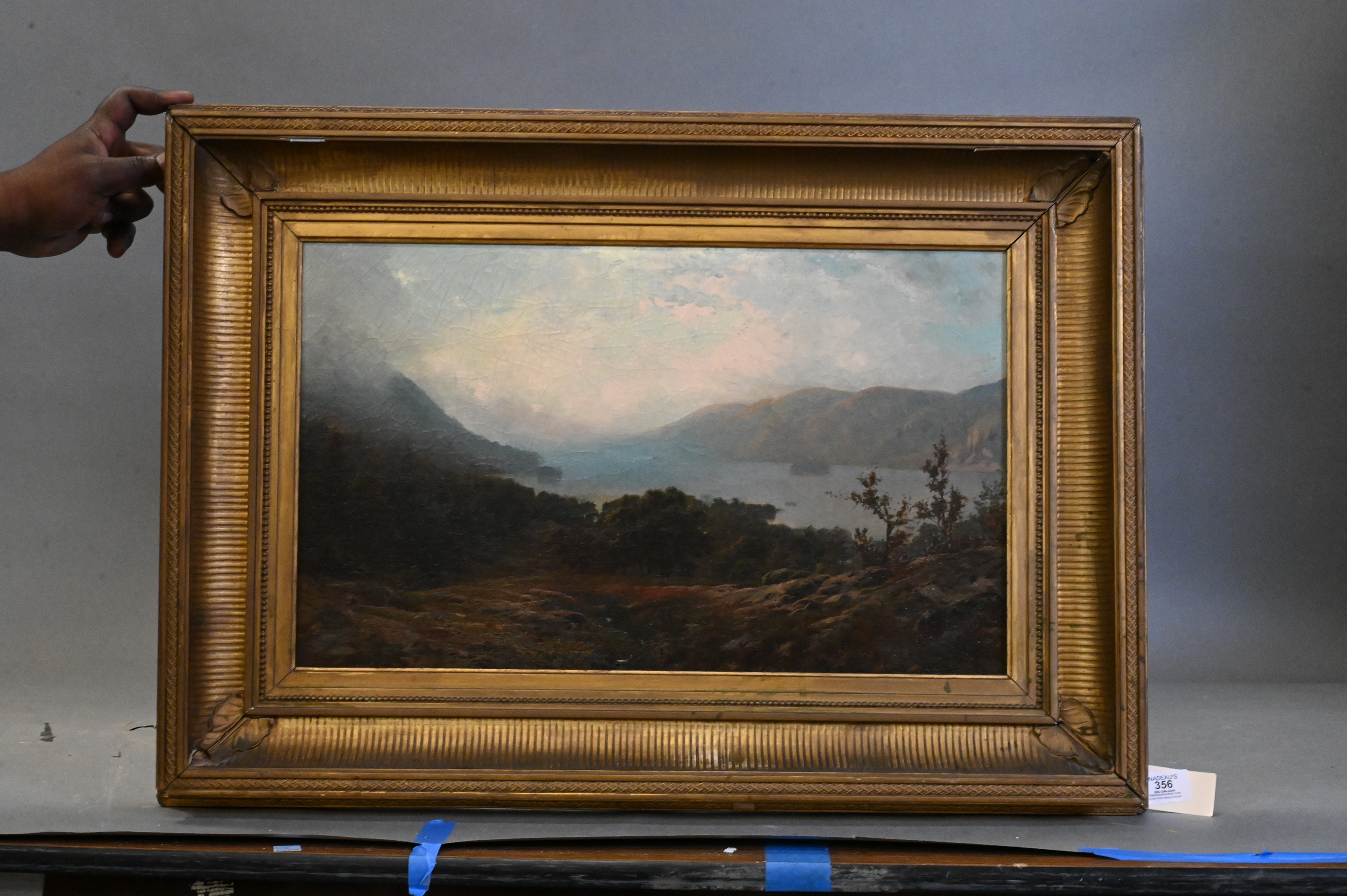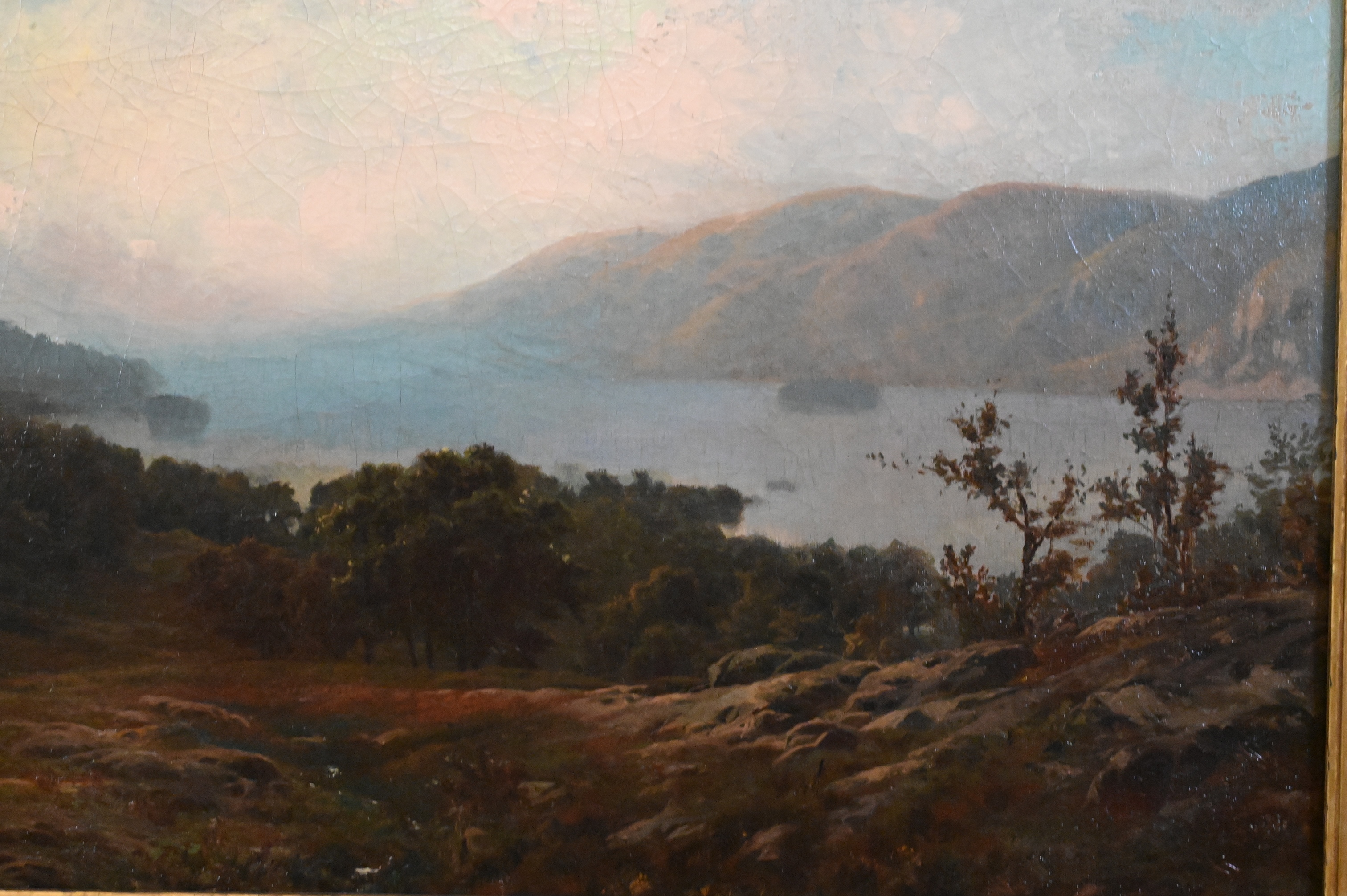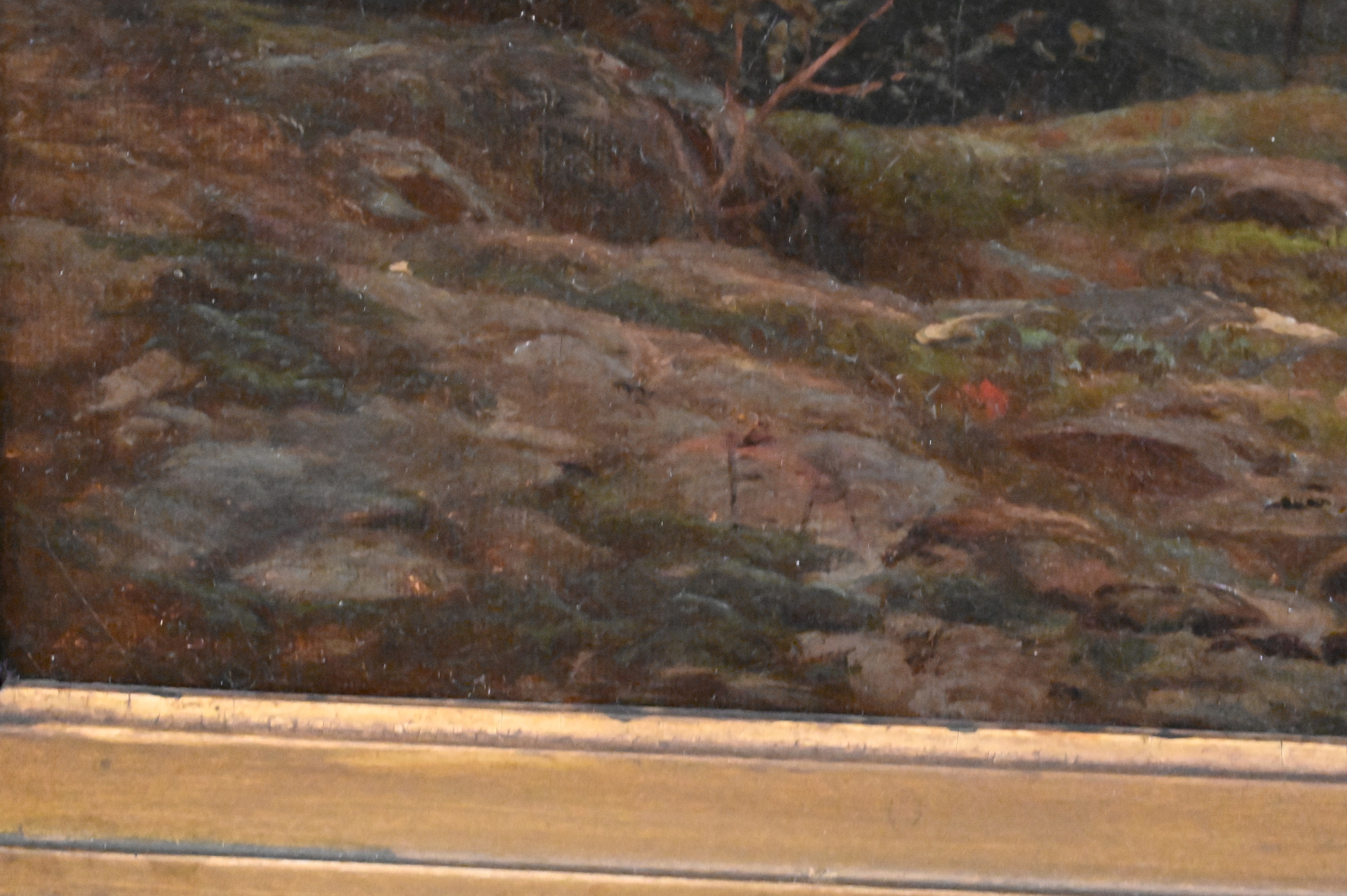 Oil on canvas depicting a Hudson River School landscape with a rocky, brush-covered foreground overlooking the Hudson River, the distant Highlands rising along the horizon beneath a mist-filled sky, the scene rendered in deep late-summer tones.Presented in a gilt Federal style frame with ray pattern molding and acanthus leaf corners.