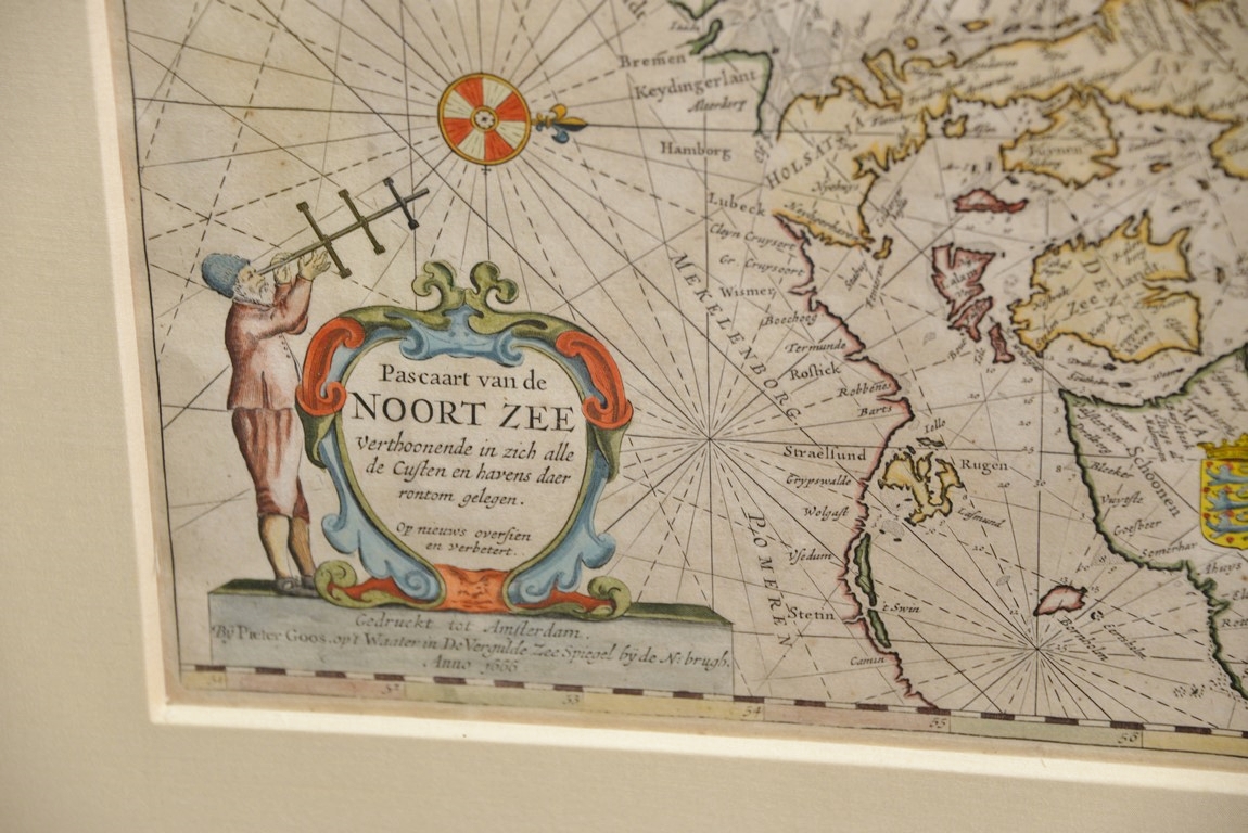 Hand colored engraving map Pascaart van de Noort Zee Verthoonende in Zich alle de Custen en Havens Daer Rontom Gelegen by Pieter Goos, op’t Water in De Vergulde Zee Spiegel by de Ni Brugh Anno 1666 sight size: 17 3/4 x 21 1/2 Provenance: Property from Credit Suisse’s Americana Collection