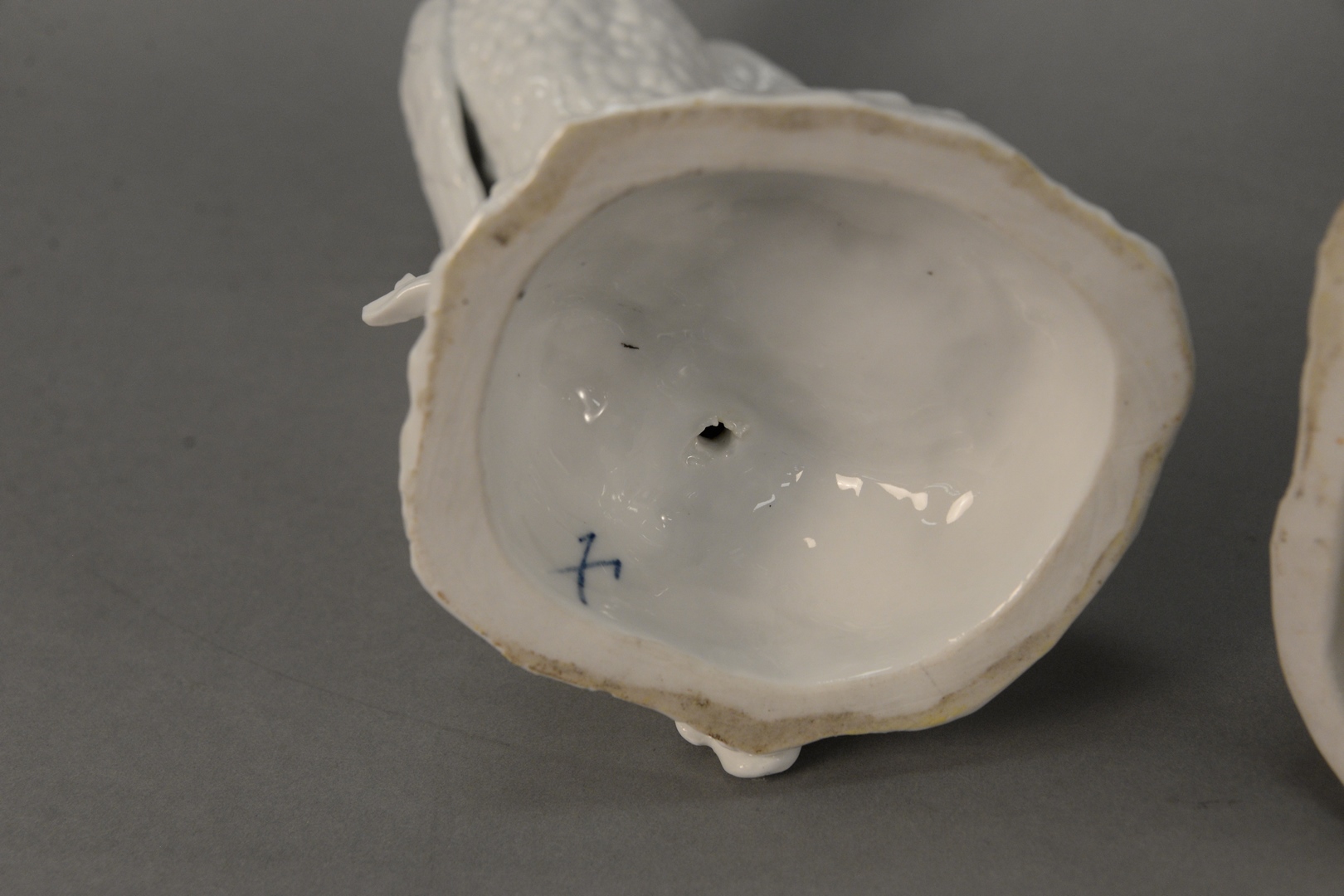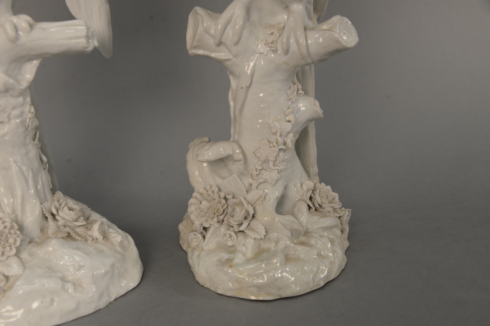 sitting on tree stumps, Blanc de Chine with blue crossed swords, mark on bottom, impressed ‘A’ possibly Meissen
