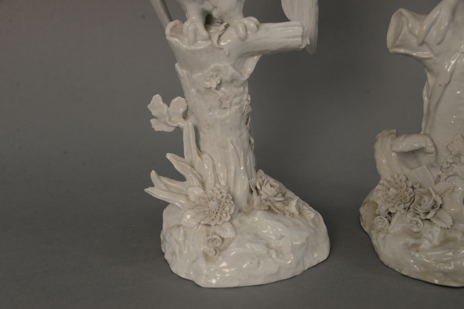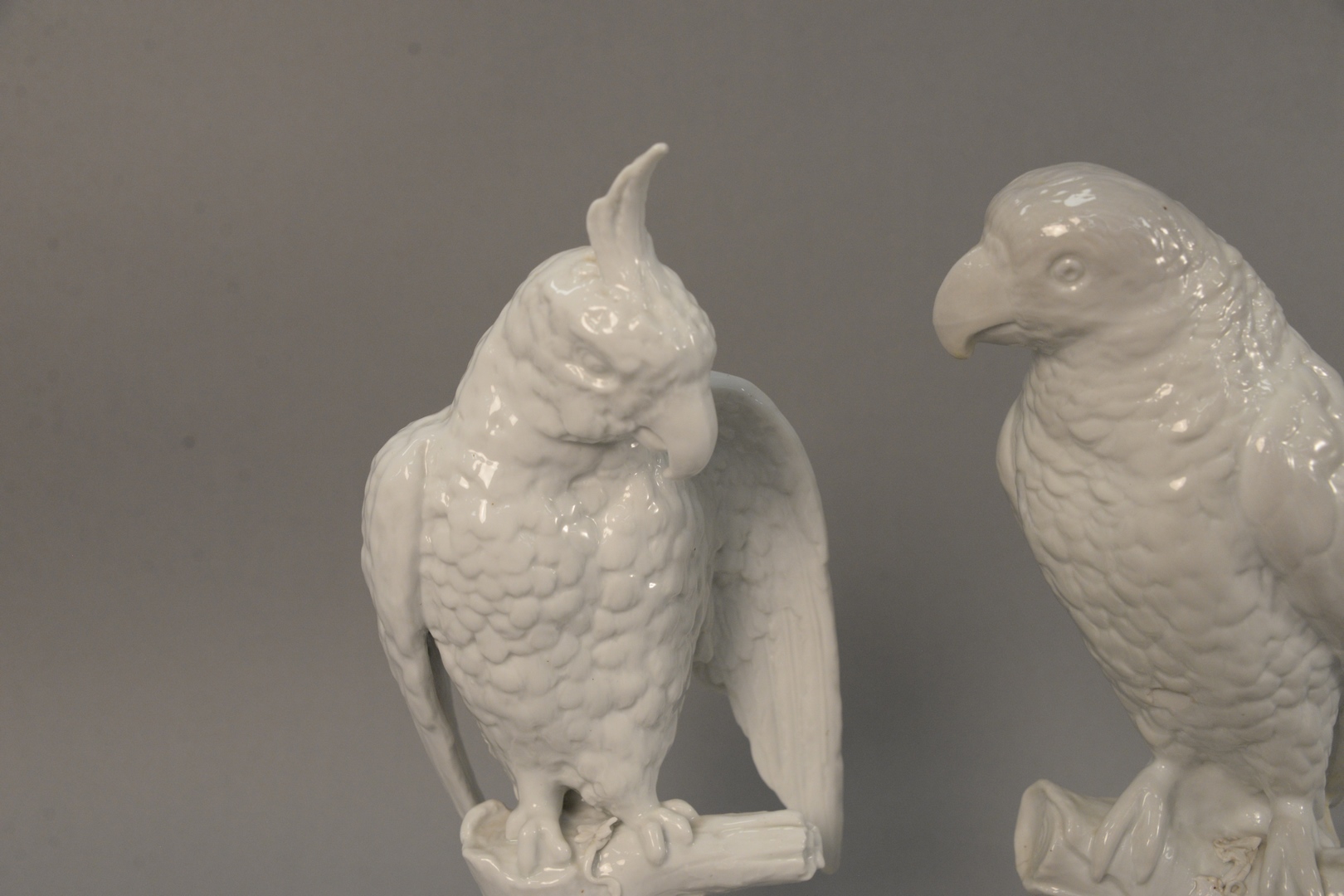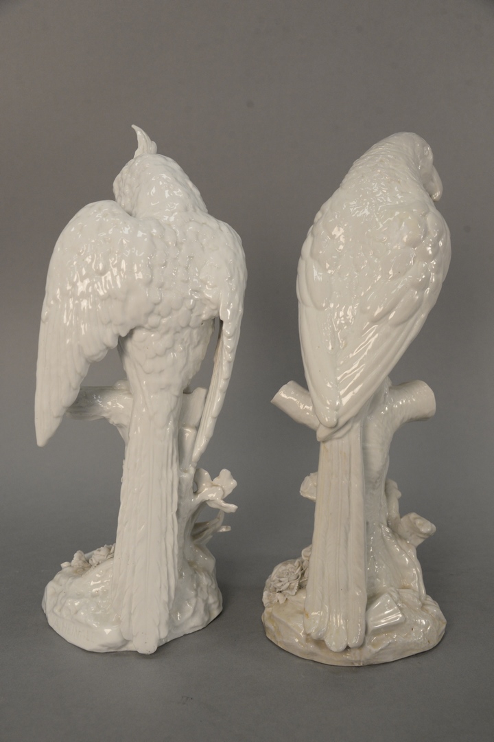 Lot 356: Pair of German Porcelain Parrots sitting on tree stumps, Blanc de Chine with blue crossed swords, mark on bottom, impressed ‘A’ poss…