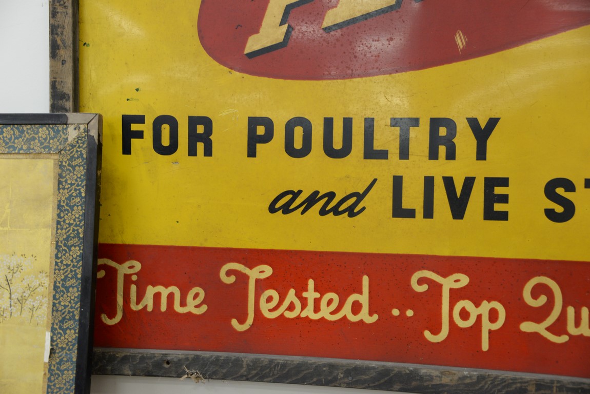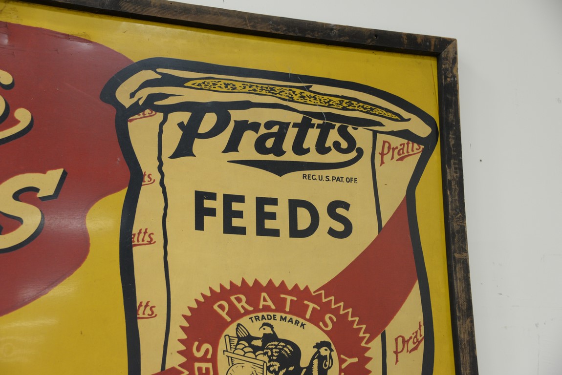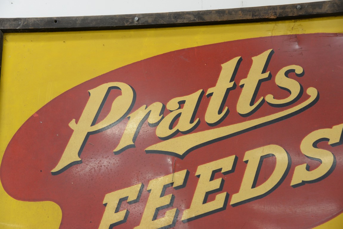 Pratts Feeds metal sign 1 split 4 inches high. 71 x 47