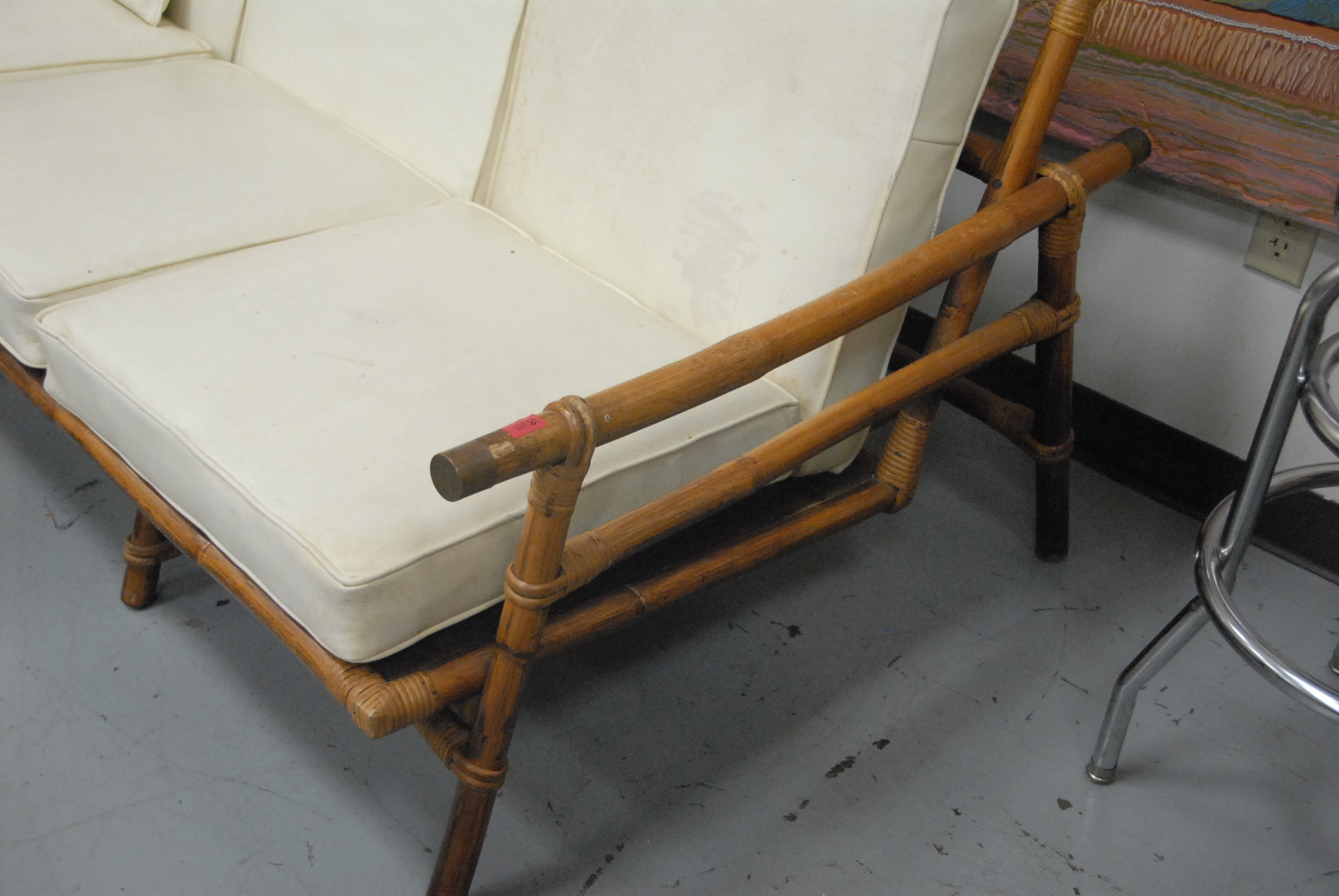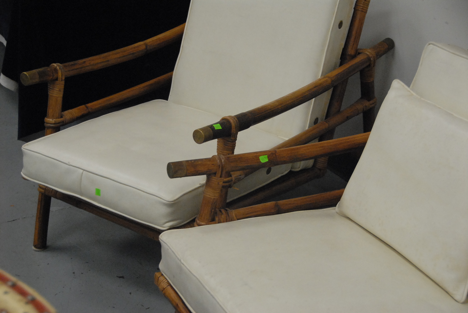 Rattan three-seat sofa and matching lounge chair all with loose seat cushions.