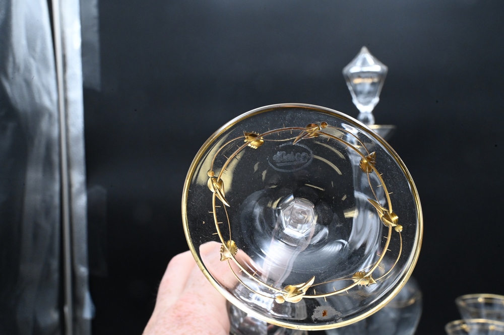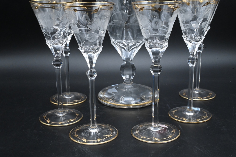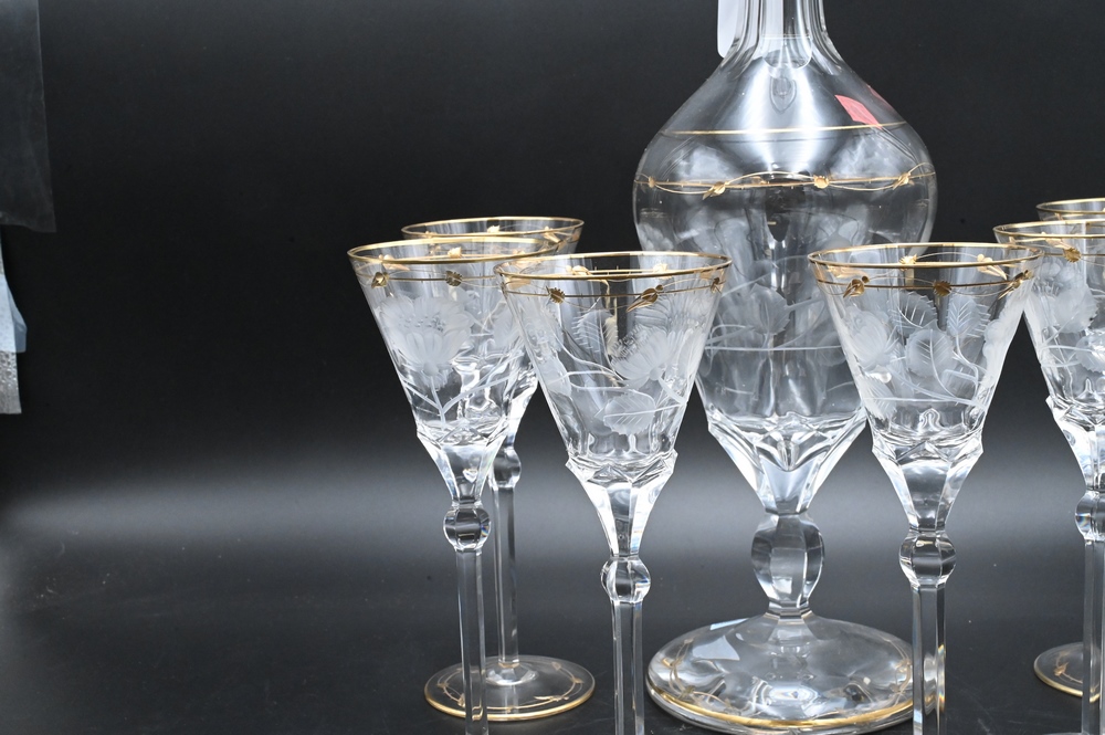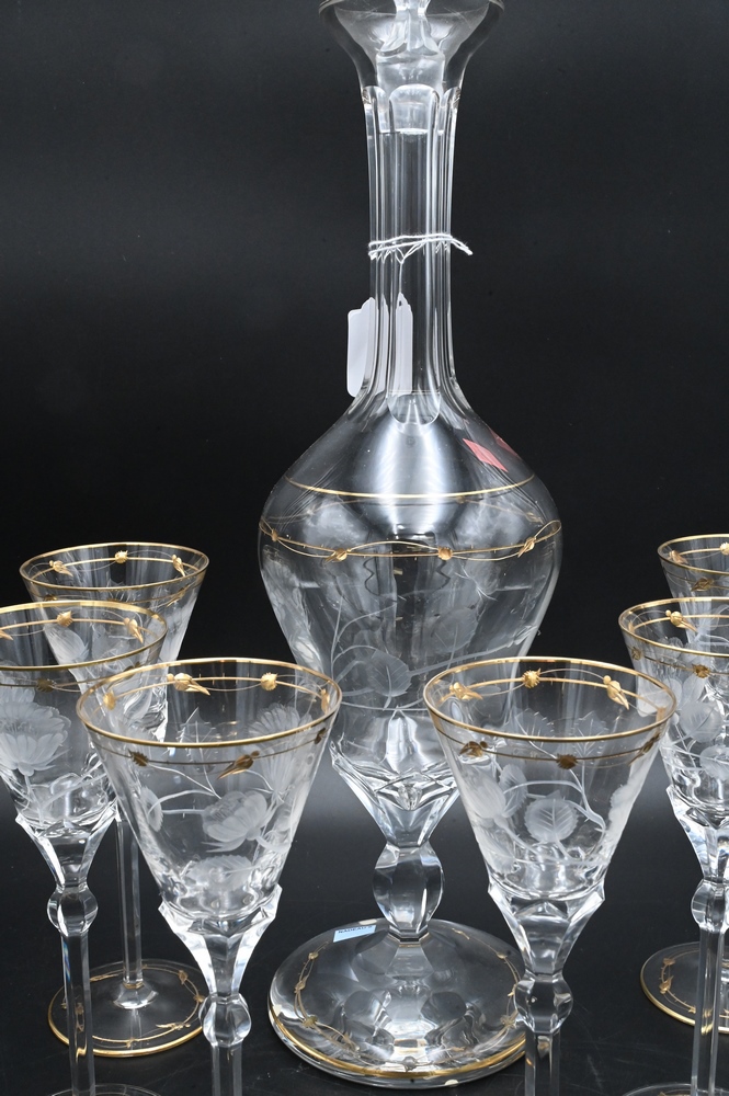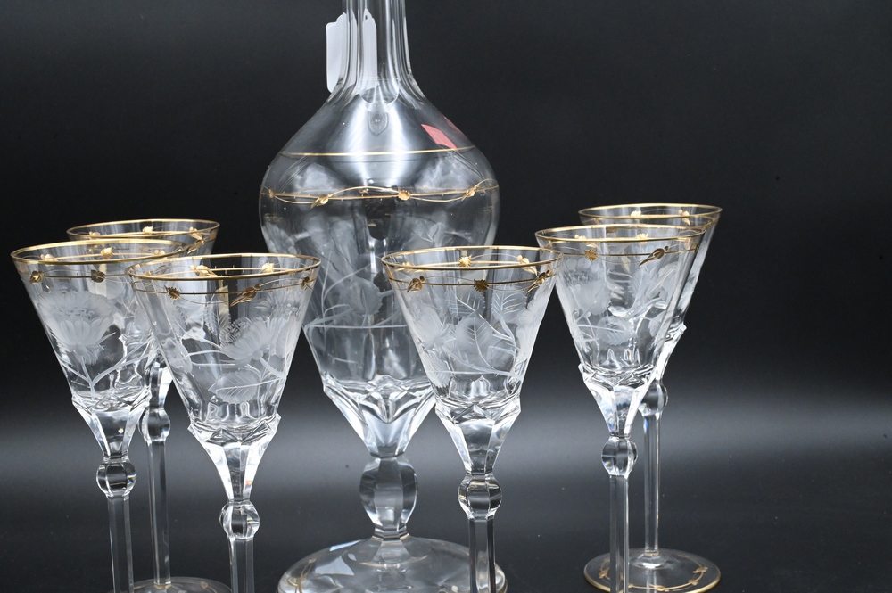 Seven Piece Moser Decanter Set, to include one tall decanter, height 21 inches; along with six stems, height 8 1/4 inches; all with etched flower motif and gilt decoration.