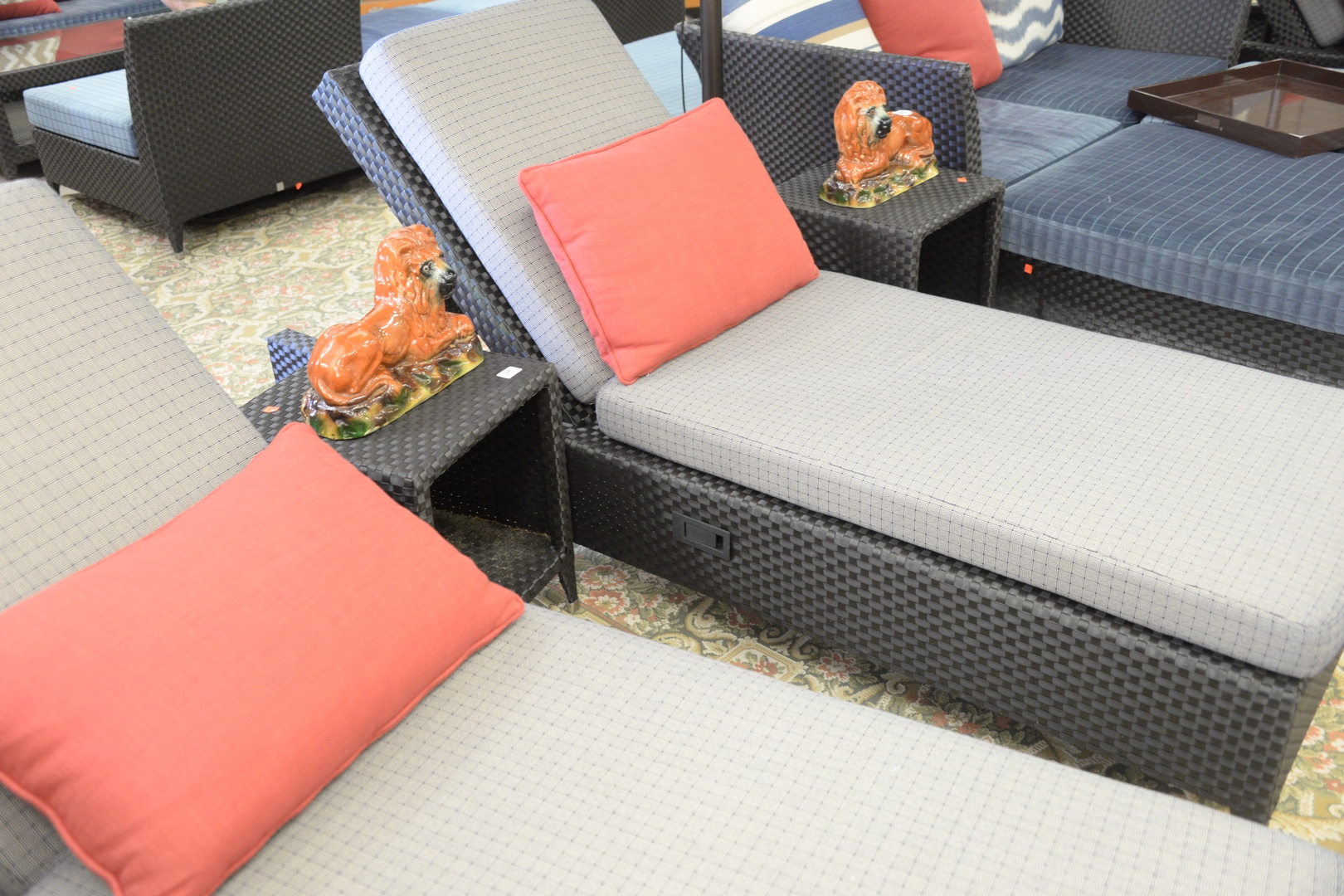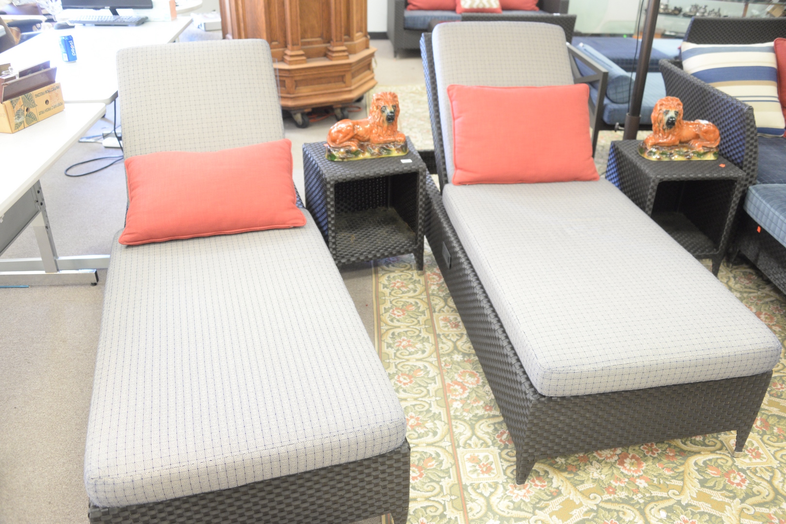 Lot 356: Three Piece Sifas Indoor/Outdoor Transatlantik Group, to include pair of loungers or chaises, having high central side stand and custom cushions with side adjustments, along with custom outdoor covers, length 80 inches. Provenance: David and Cynthia Kim, 22 Stoney Wylde Lane, Greenwich, Connecticut. View home by visiting: https://www.zillow.com/homedetails/22-Stoney-Wylde-Ln-Greenwich-CT-06830/177238281_zpid/