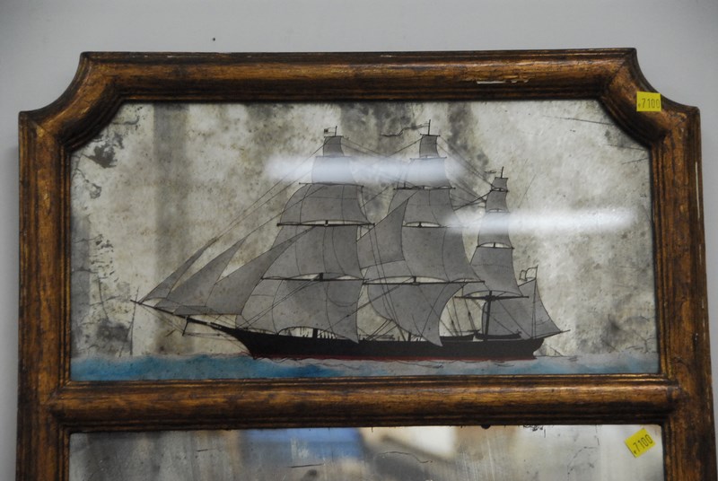 Two part mirror with ship at top. ht. 43in. wd. 22in.