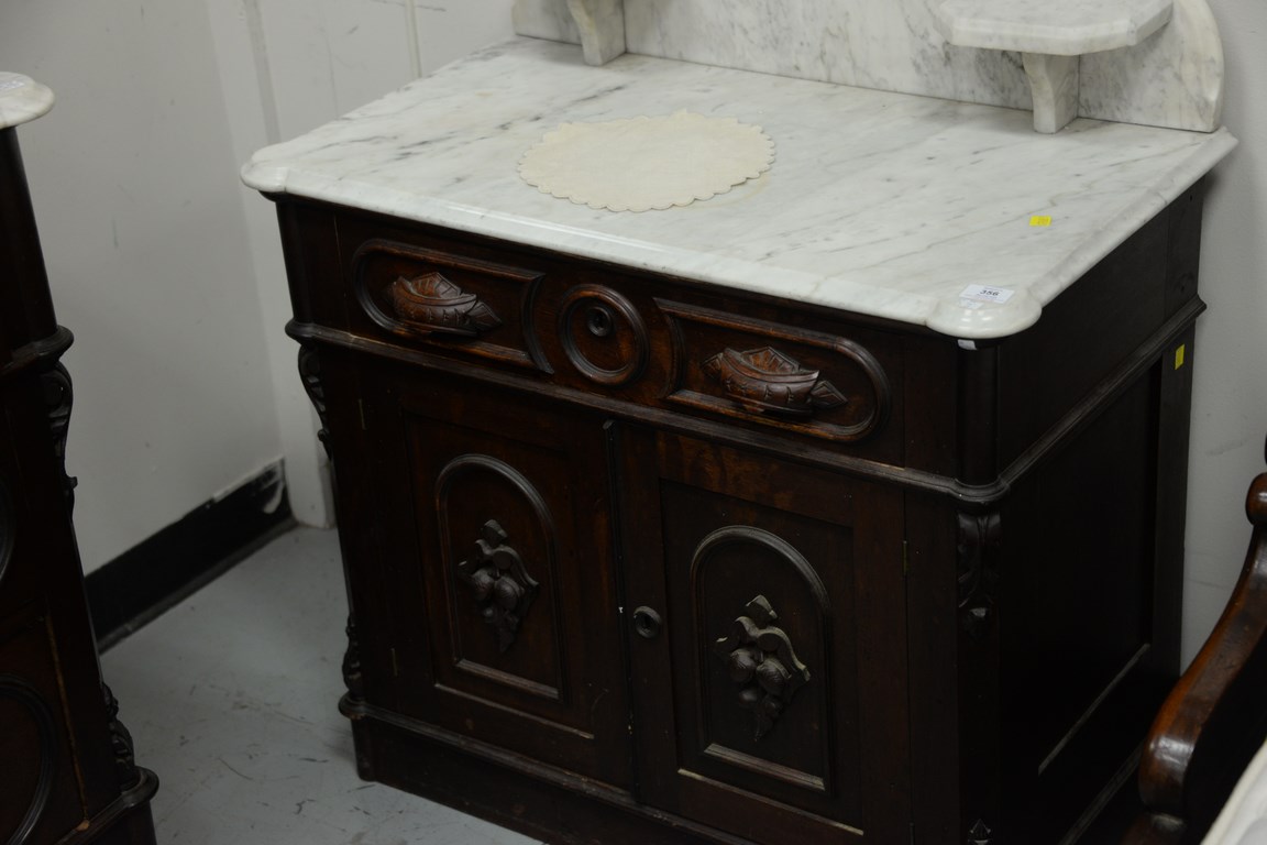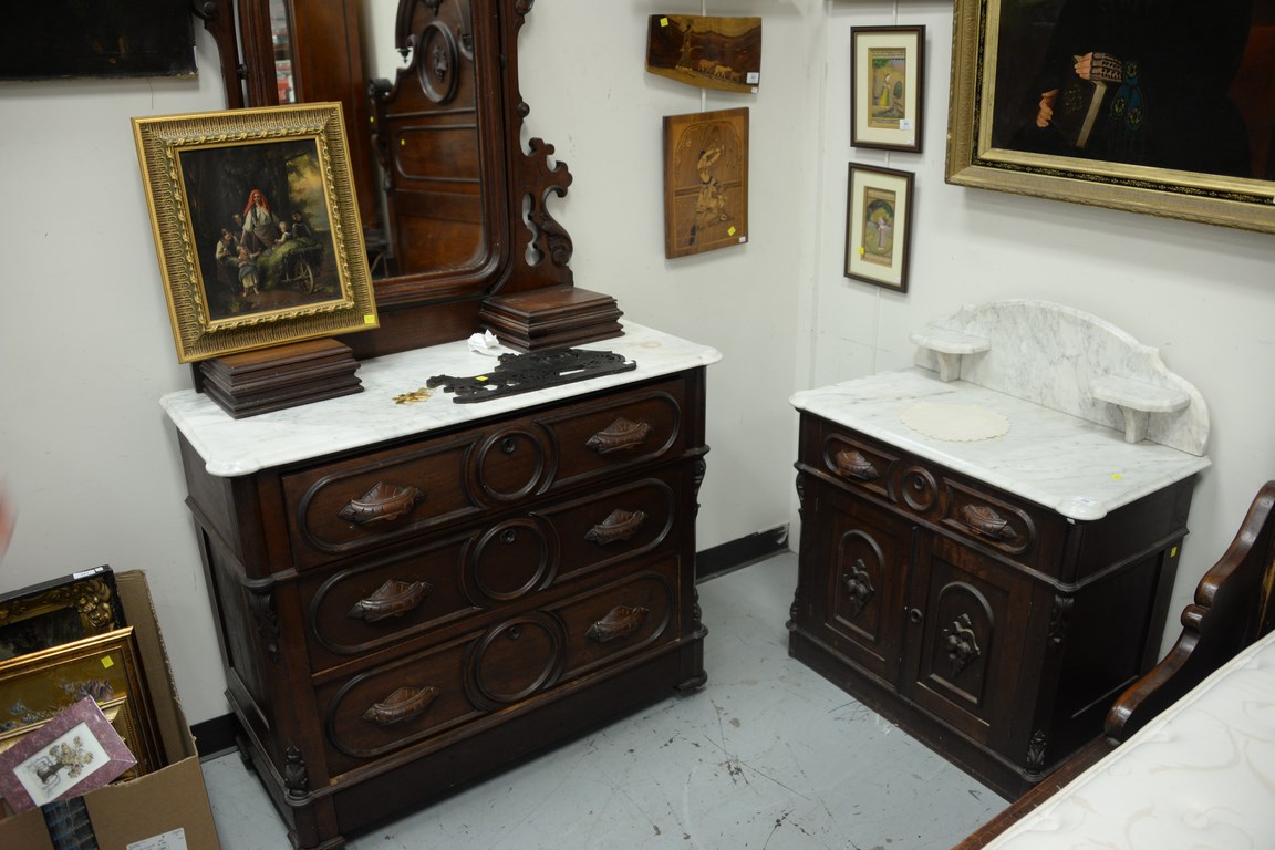 Lot 356: Two piece walnut Victorian set with marble top chest and mirror and matching marble top commode. chest with mirror: ht. 85 in.