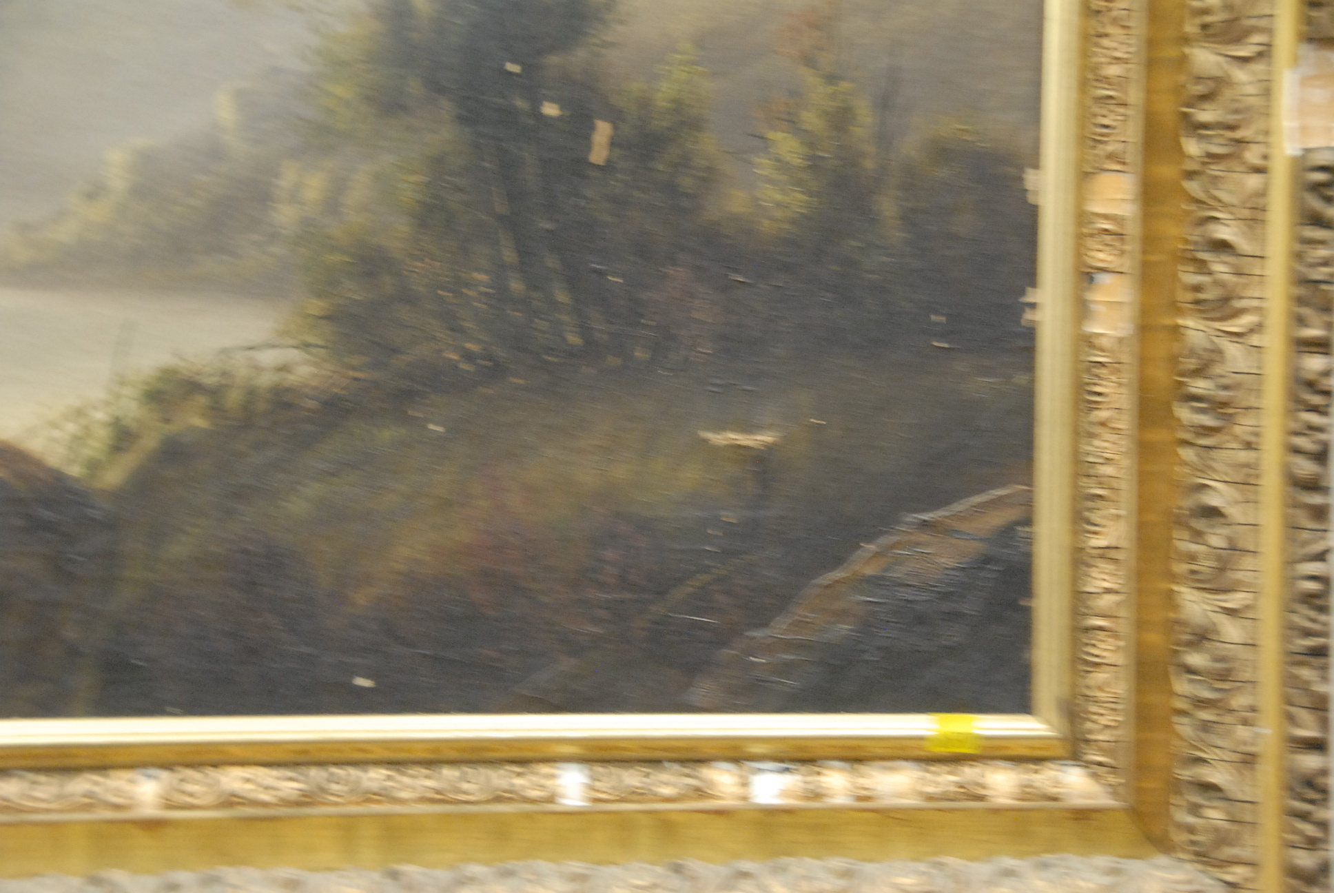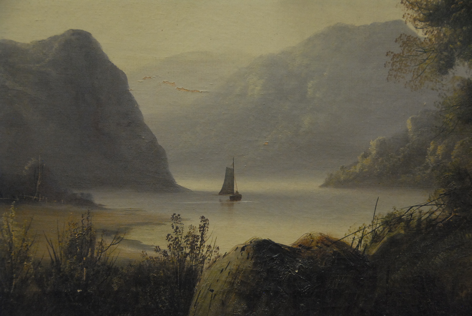 Lot 356: Victorian oil on canvas lake and sailboat with mountains in Victorian frame, 22 x 36 minor paint loss and cut.