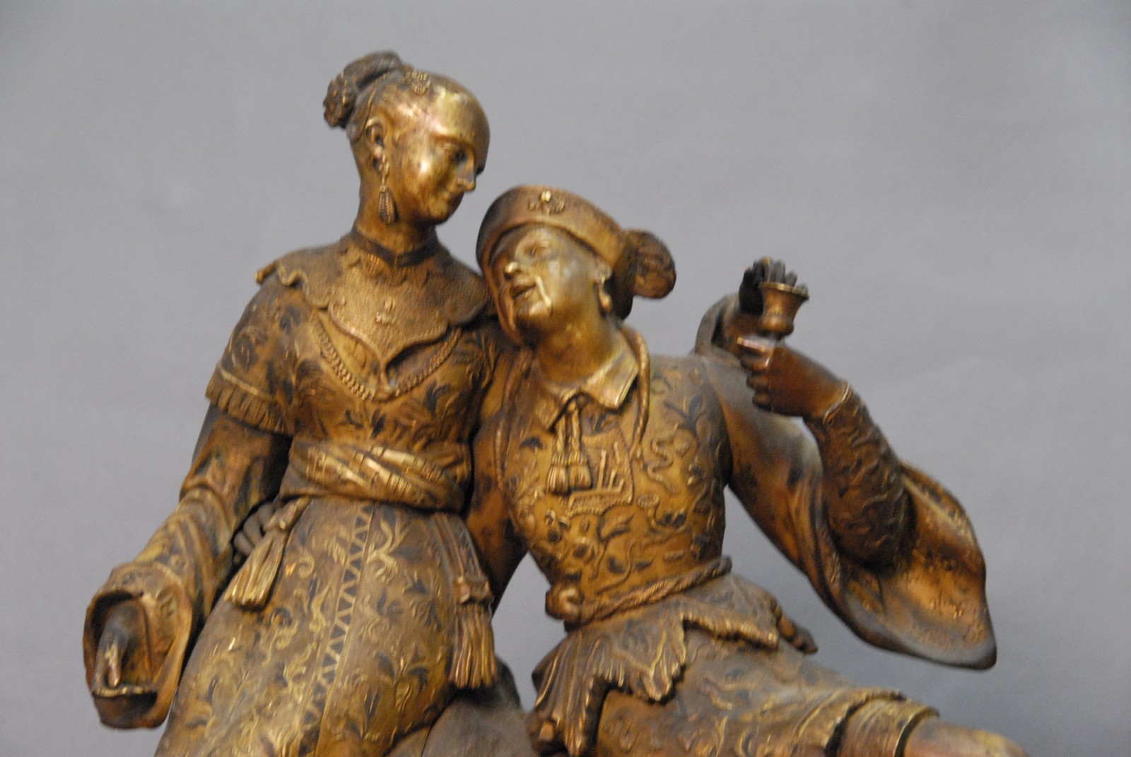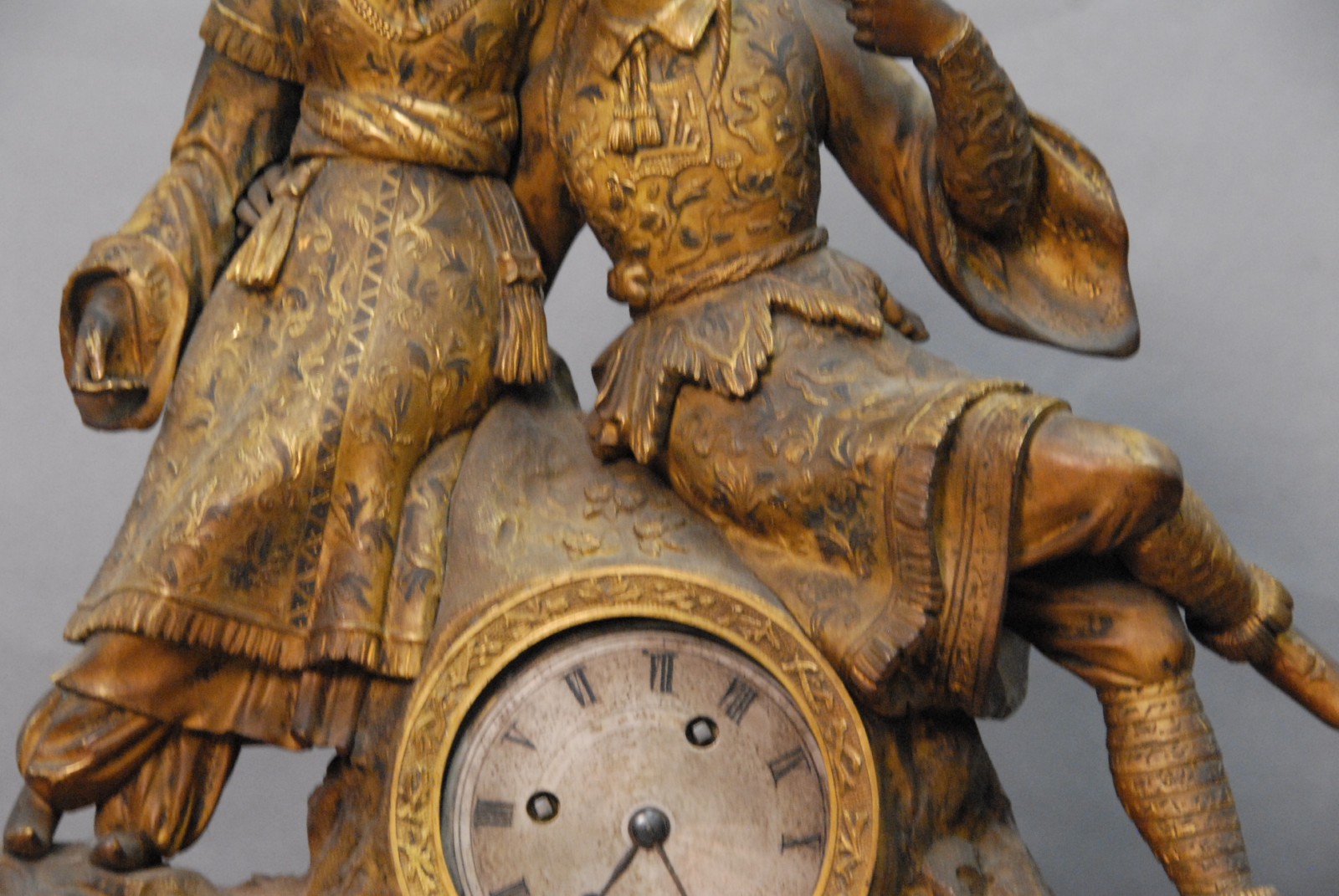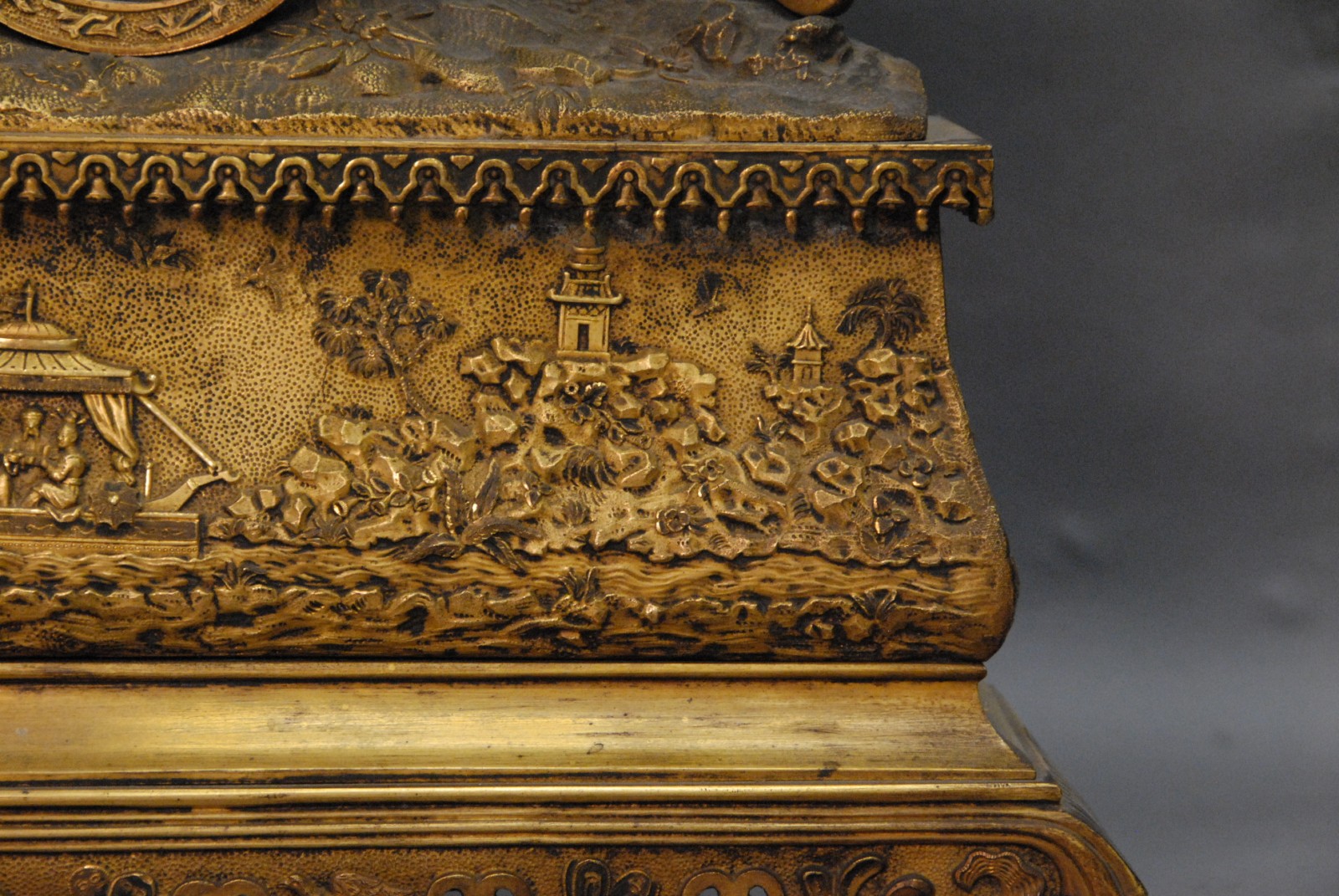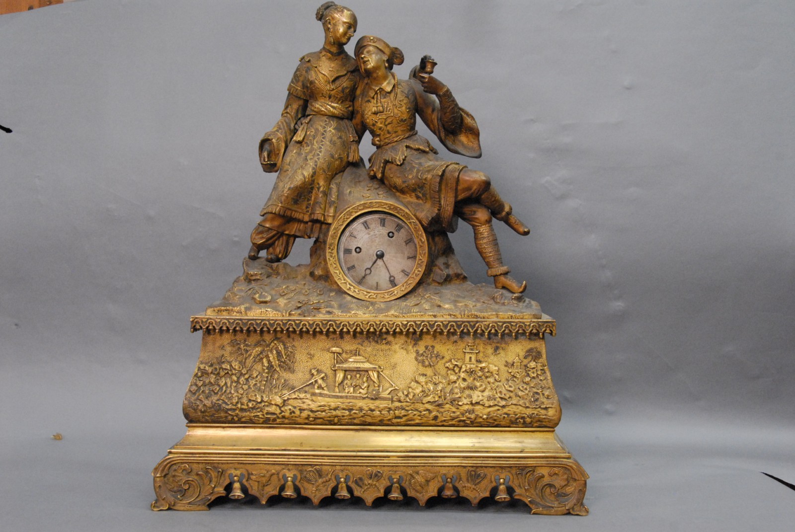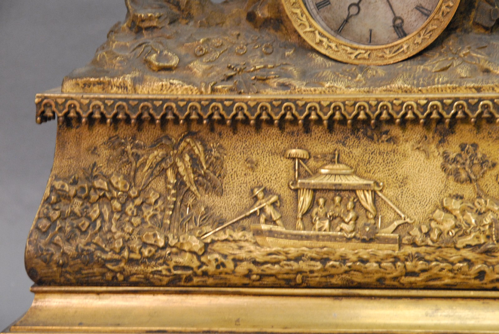 Bronze Chinese style mantle clock mounted with two Chinese figures on base with Chinese Royalty in boat and pagodas with brass works and silvered dial 19th century.