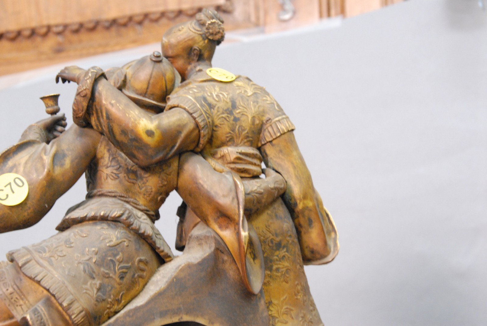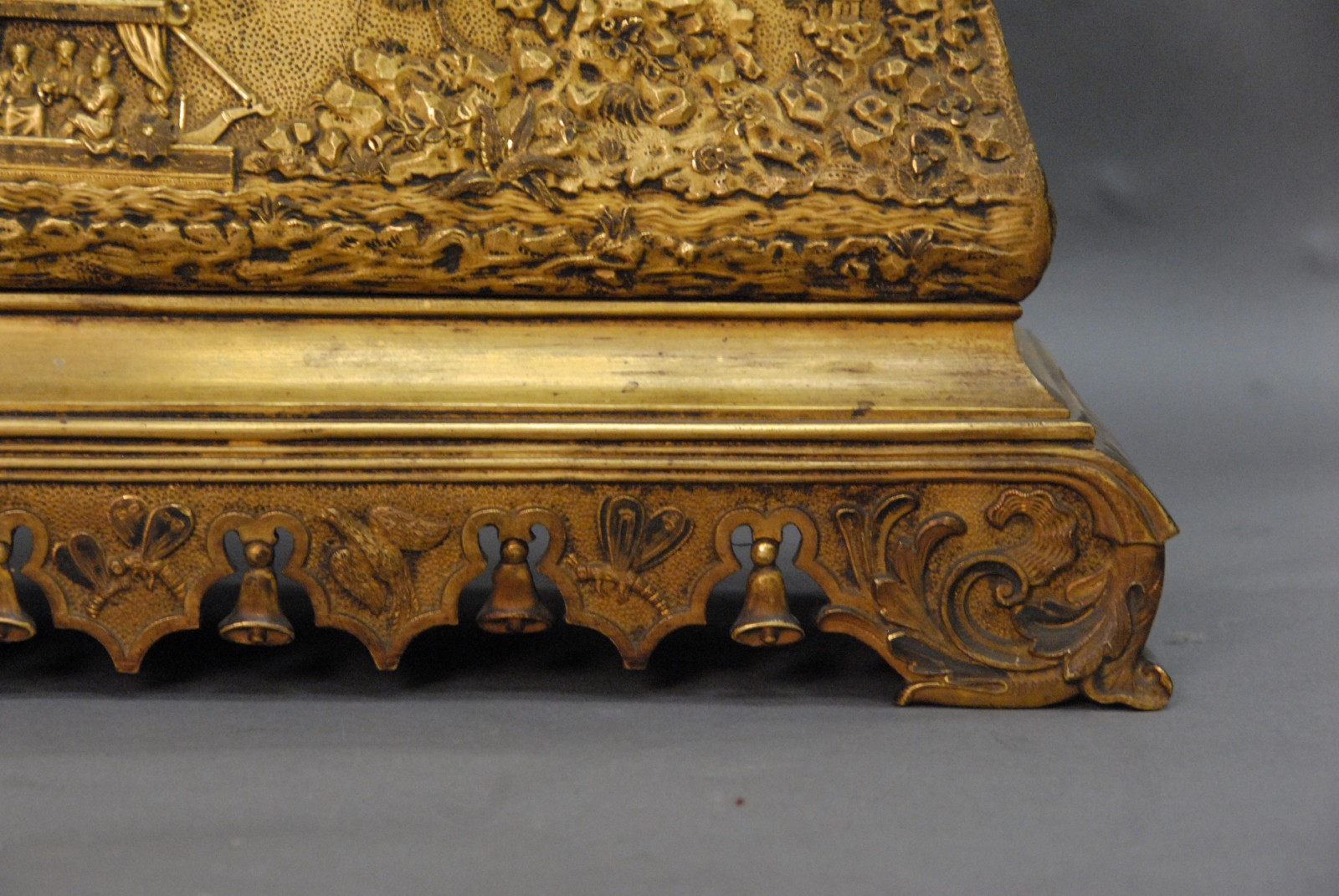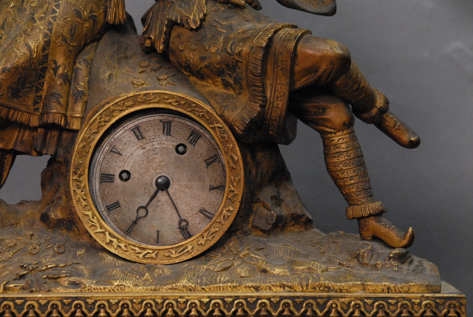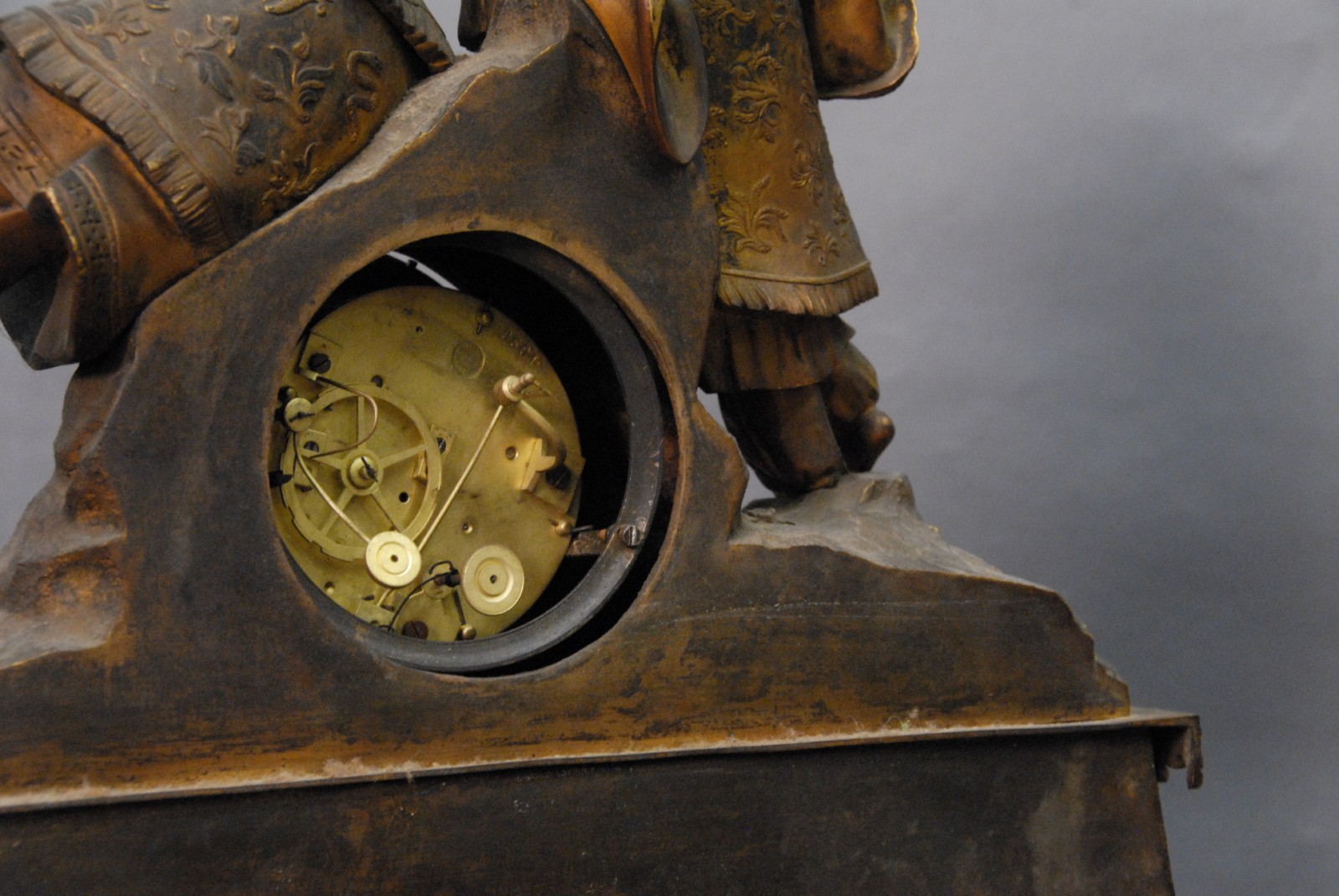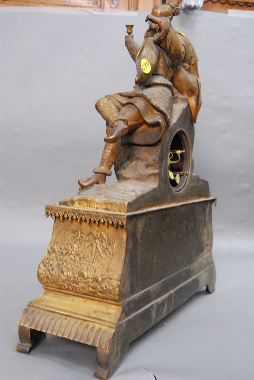 Bronze Chinese style mantle clock mounted with two Chinese figures on base with Chinese Royalty in boat and pagodas with brass works and silvered dial 19th century.