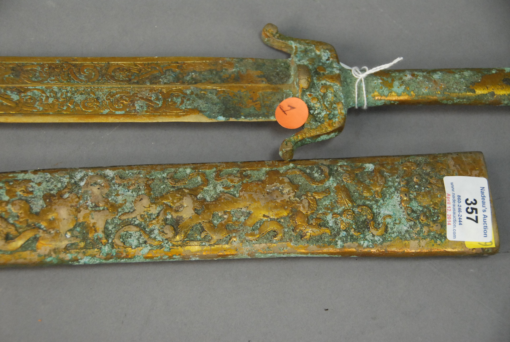 Chinese bronze sword and scabbard. lg. 27 1/2in.