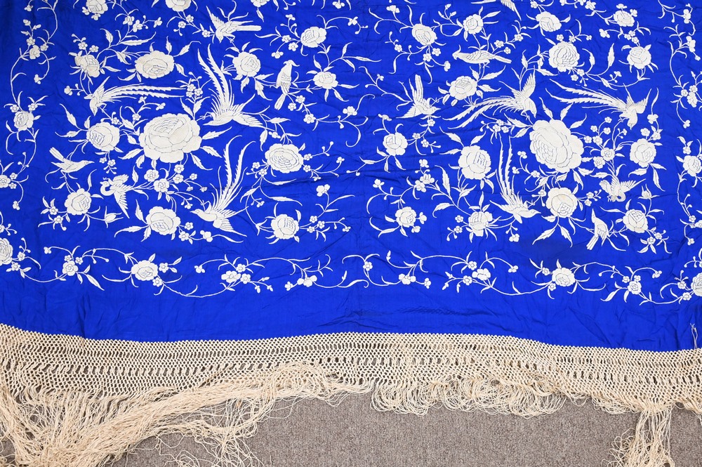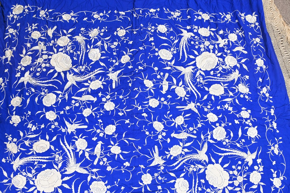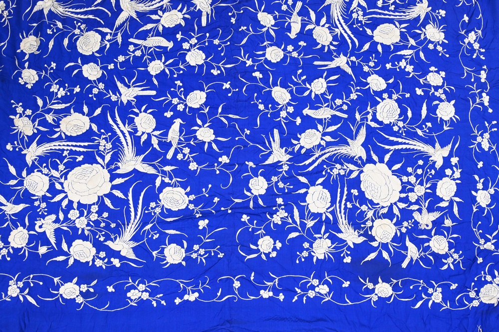 Lot 357: Chinese Silk Embroidered Piano Shawl, having dark blue background and white birds and flowers, approximately 4′ 8″ x 4′ 9″.
