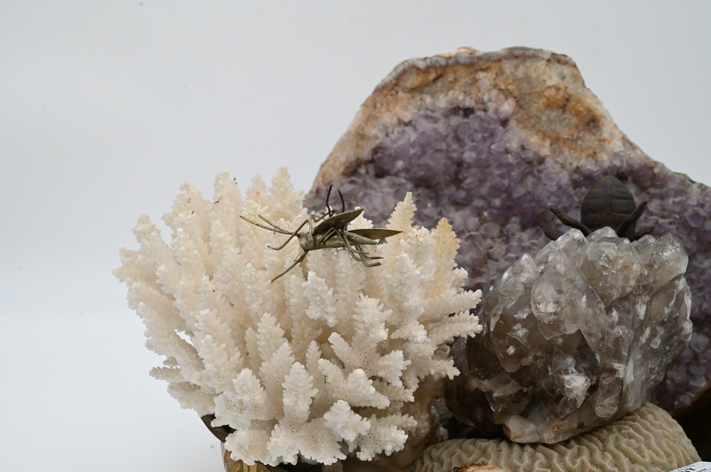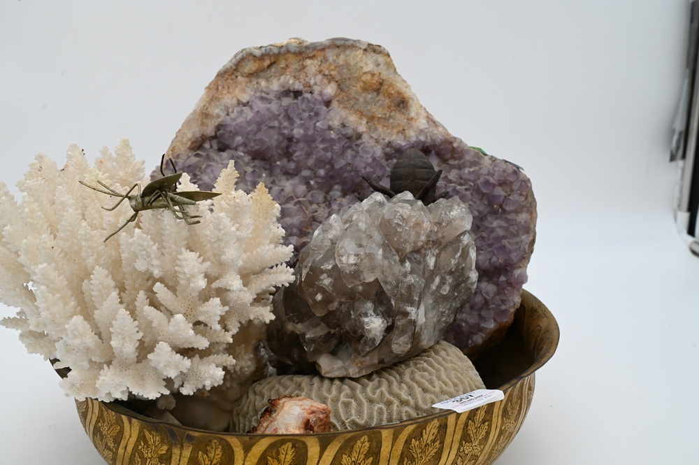 Decorative Bowl, along with assorted items to include amethyst, quartz, iron pyrite, coral, and metal bugs, height 4 inches, diameter 14 inches.