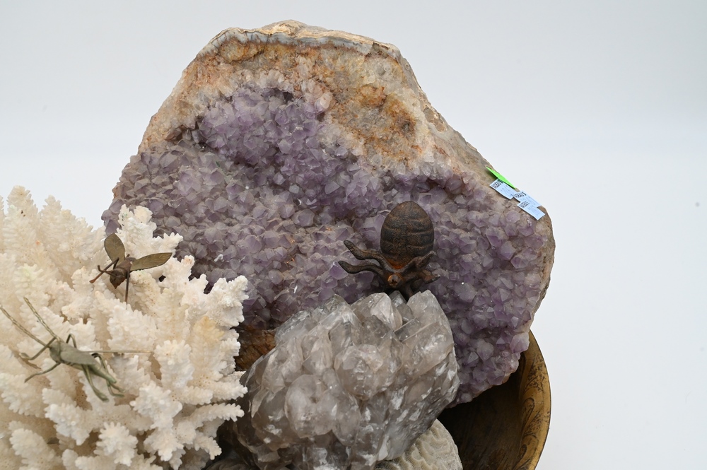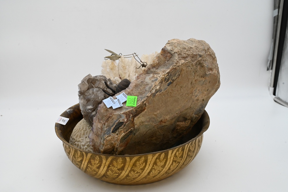 Lot 357: Decorative Bowl, along with assorted items to include amethyst, quartz, iron pyrite, coral, and metal bugs, height 4 inches, diameter 14 inches.