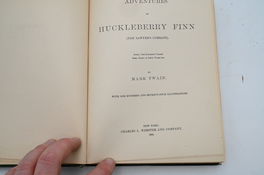 First Edition Adventures of Huckleberry Finn Tom Sawyer’s Comrade, by Mark Twain, hardcover book, circa 1885, Provenance: Fifty Year Personal Collection of Clocks and American Antiques from Thomas Bailey, Manchester, Connecticut.
