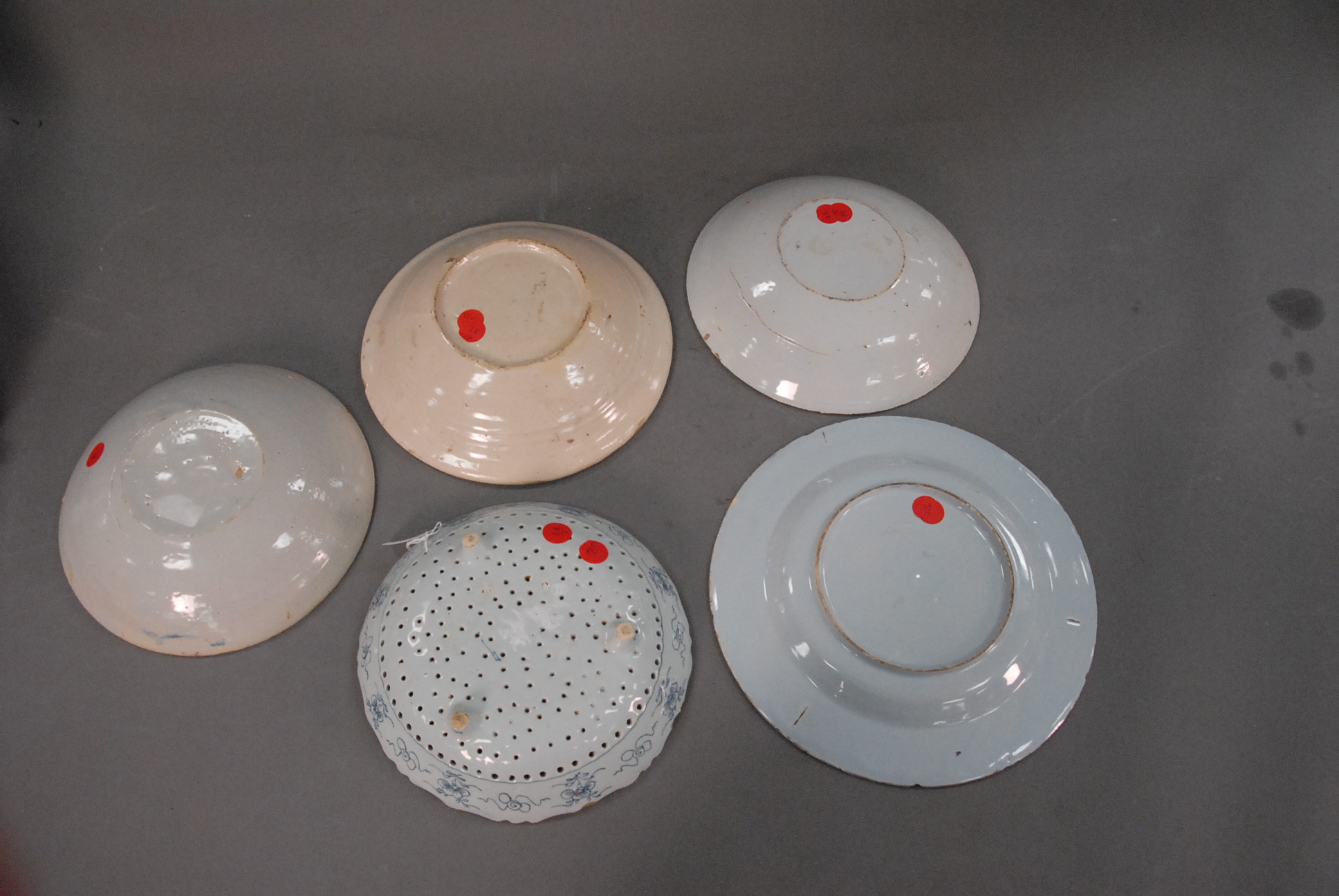 Five piece Delft lot to include three bowls, one plate, and one strainer plate, 18th – 19th century imperfections.
