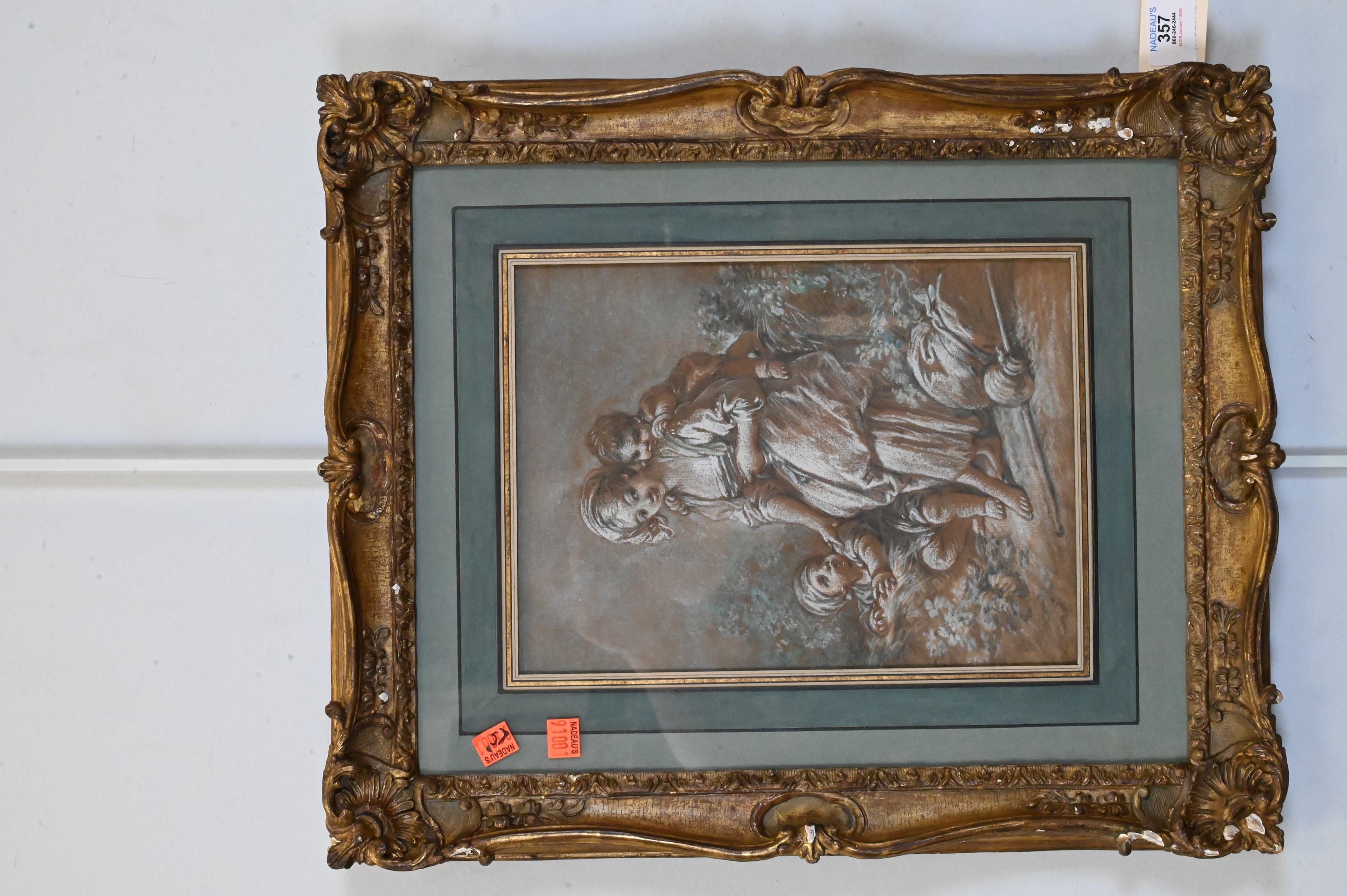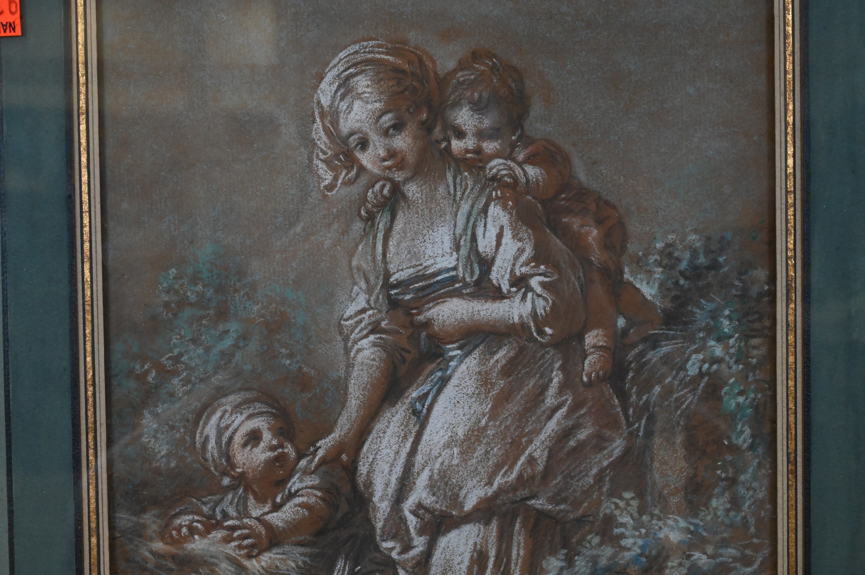 depicting a young woman seated outdoors with a child on her back and another reaching for her hand, set within a softly wooded landscape; executed with delicate modeling and the tender sentiment characteristic of Boucher and his Rococo circle