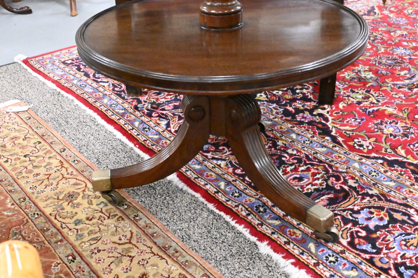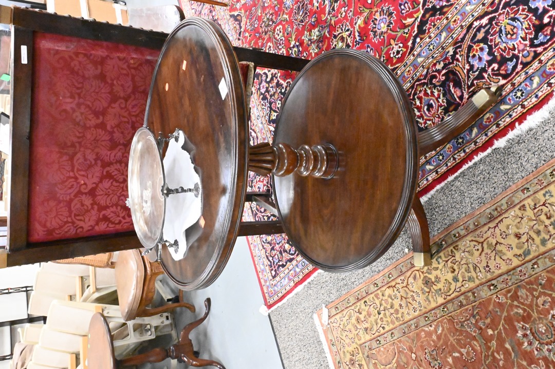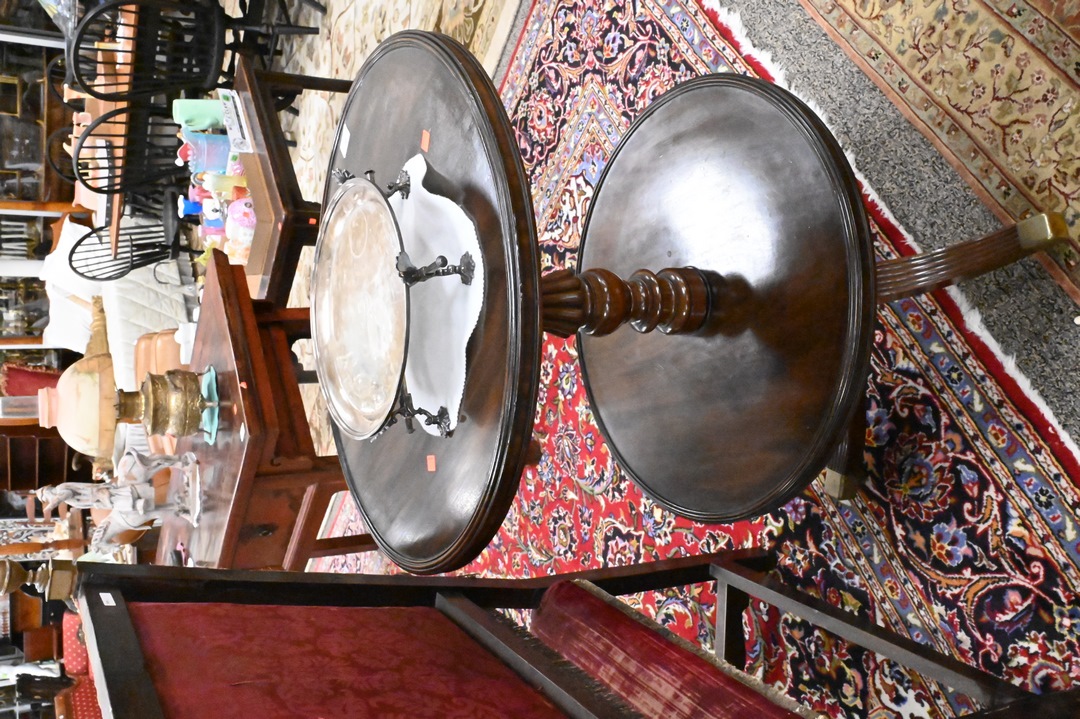 George IV Dumbwaiter, having two tiers, on pedestal base, height 33 1/2 inches, diameter 25 inches. Provenance: Estate of Peter Tillou, Litchfield, Connecticut.