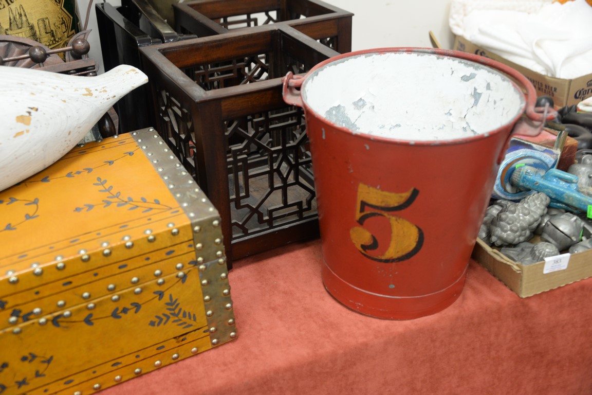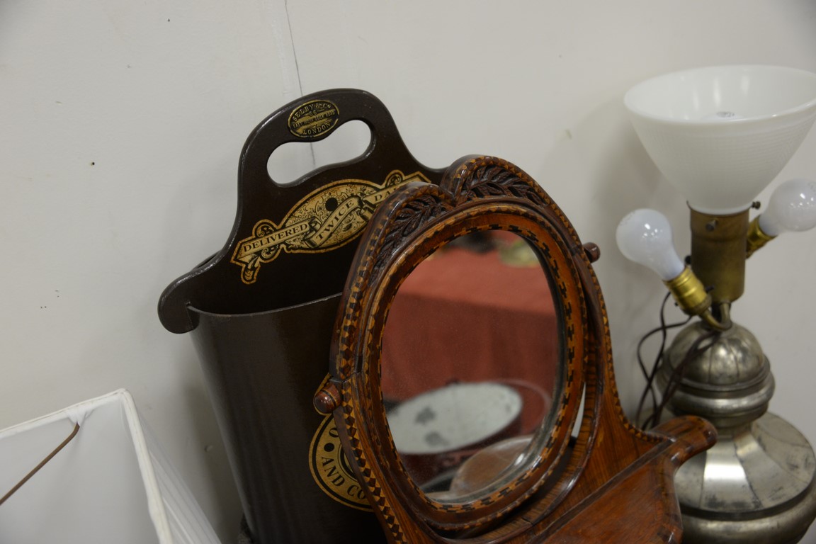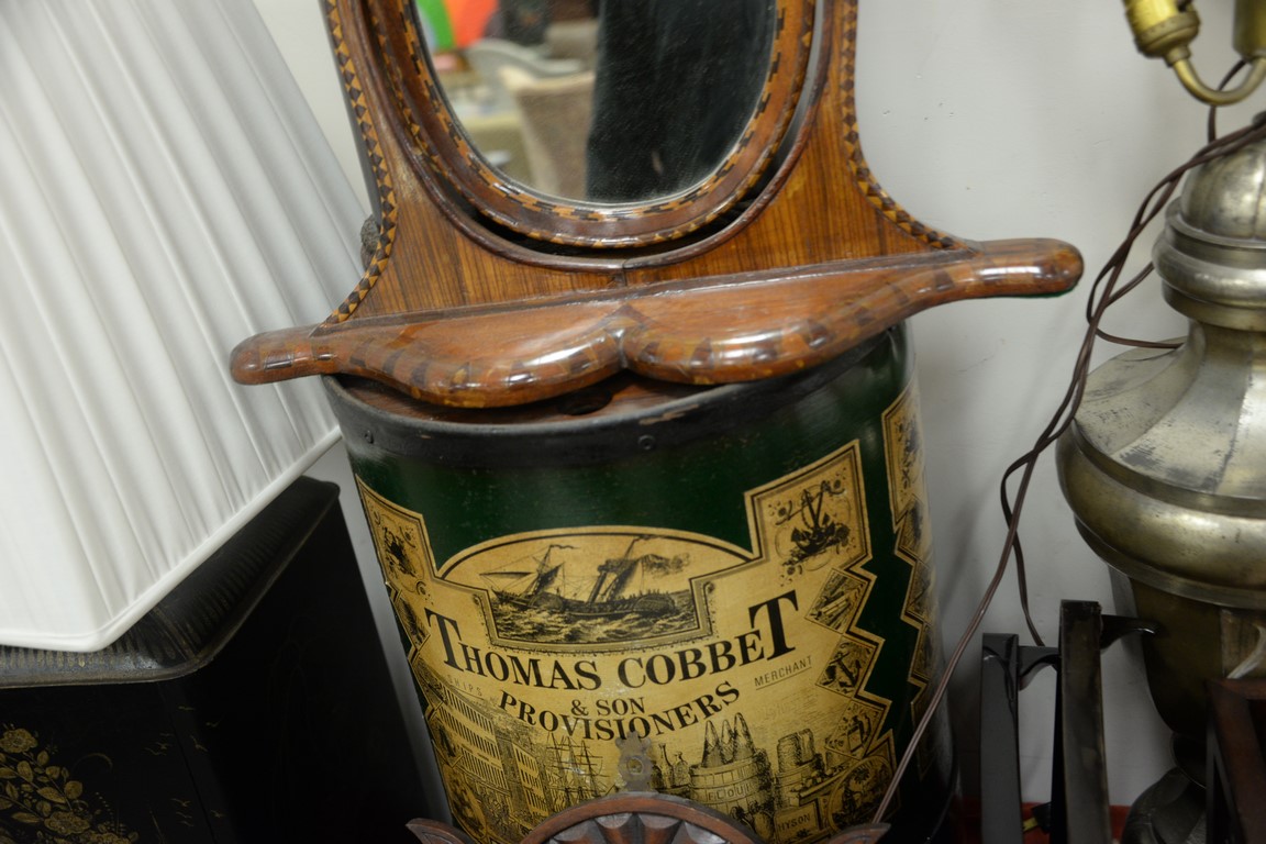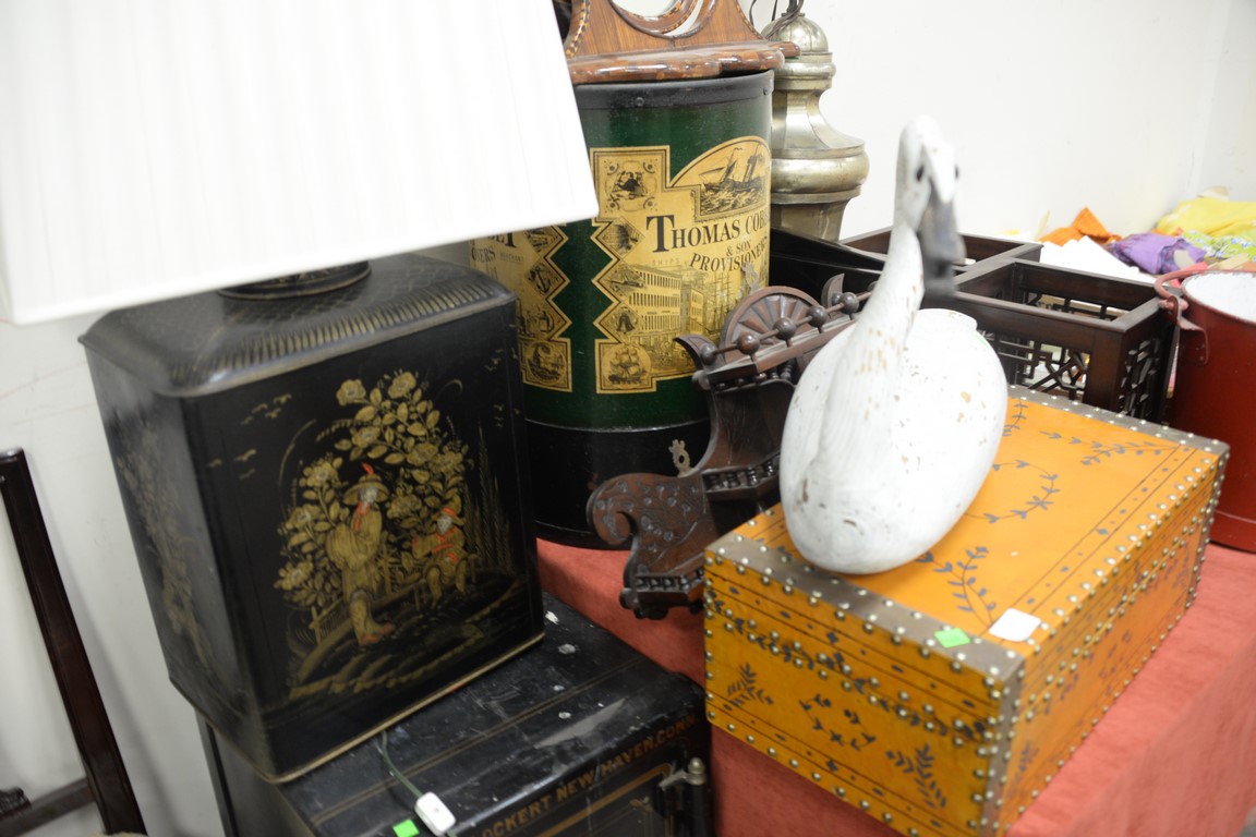 Lot 357: Group of eleven decorative items to include Thomas Cobbet hamper, two waste baskets, lift top box, hanging cabinet, two lamps, tole …
