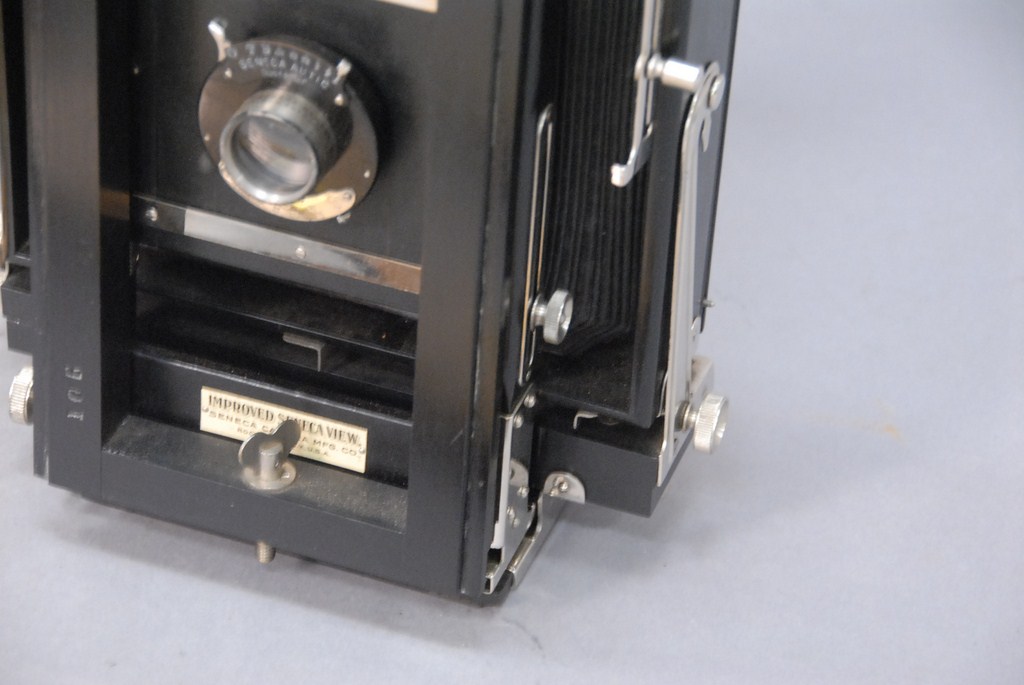 Improved Seneca View box camera, Seneca Autic in original carrying case with wooden tripod stand.