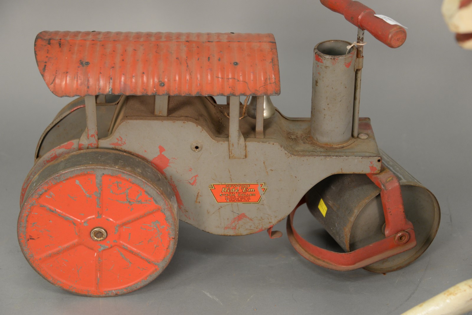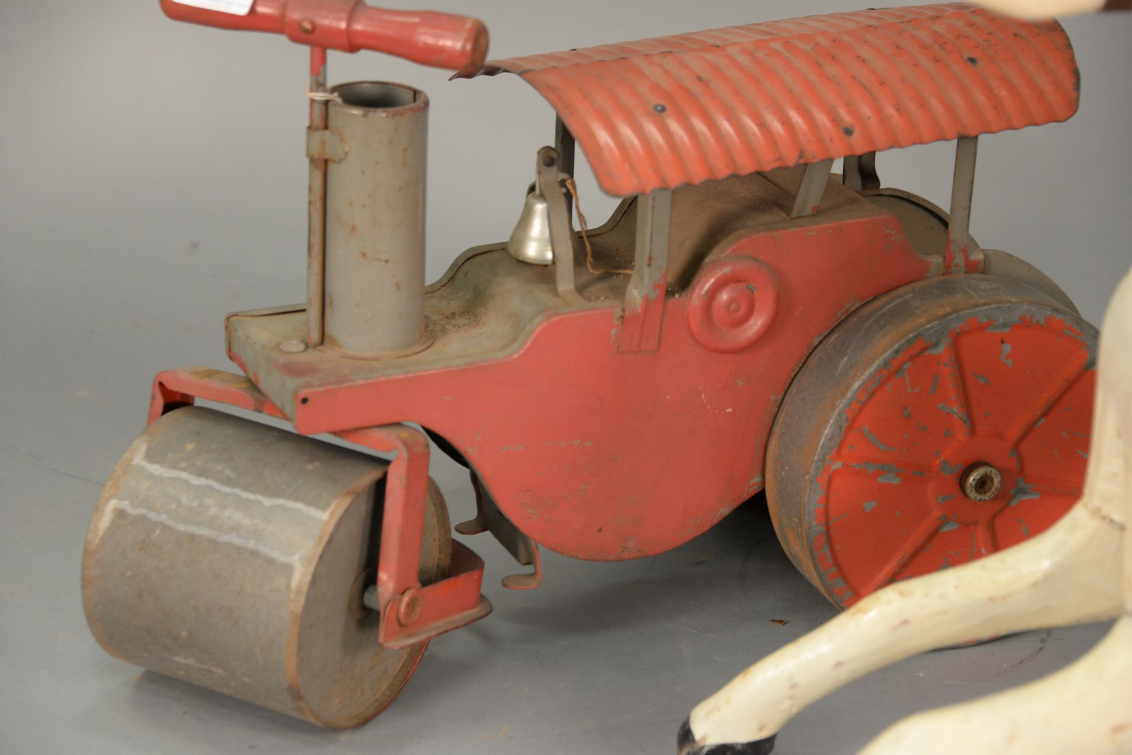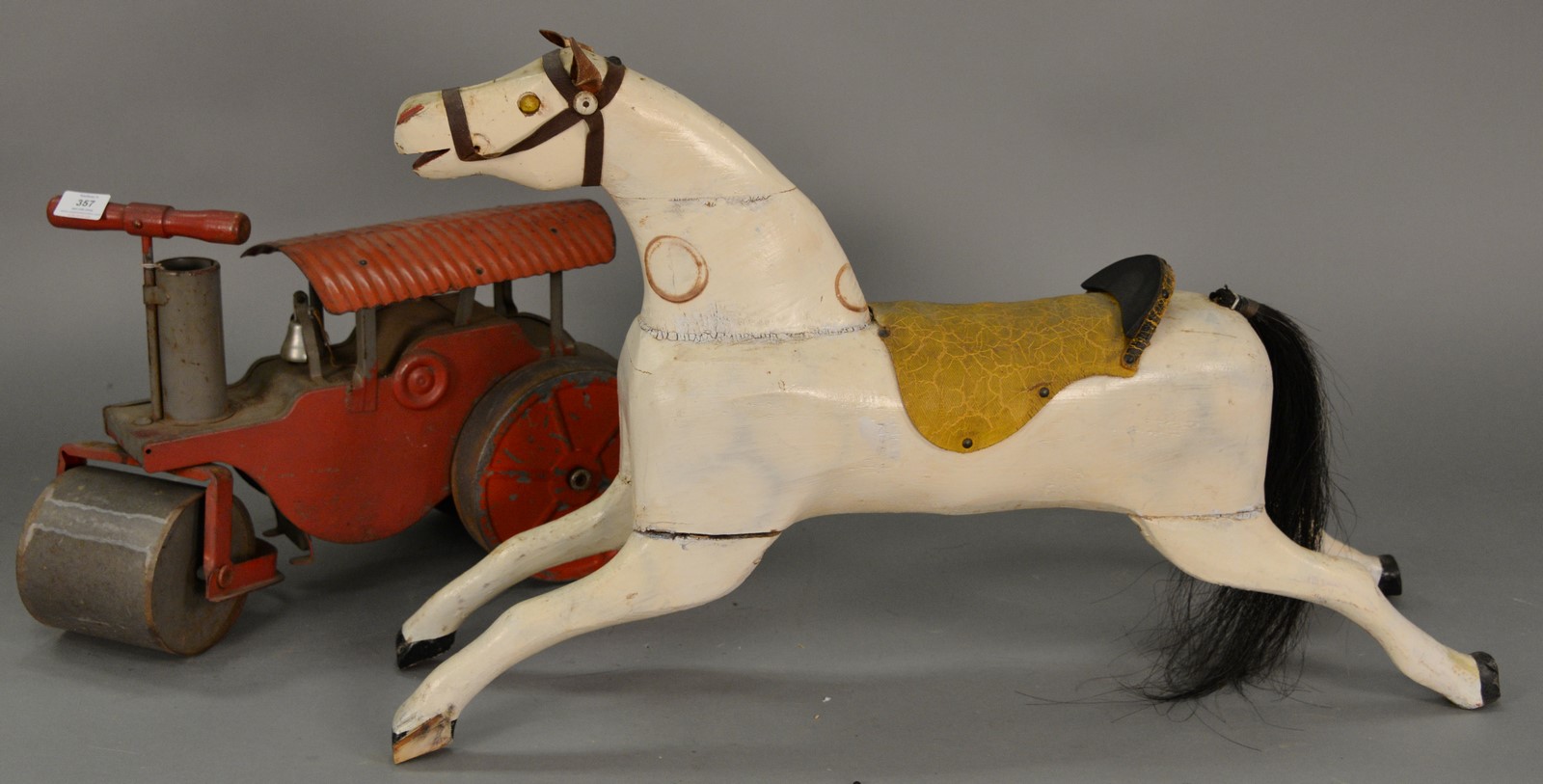 Lot 357: Keystone Ride’Em Steam Roller, pressed steel ride on toy along with a carved wood toy horse.steam roller: ht. 14 in. lg. 21 in.,…