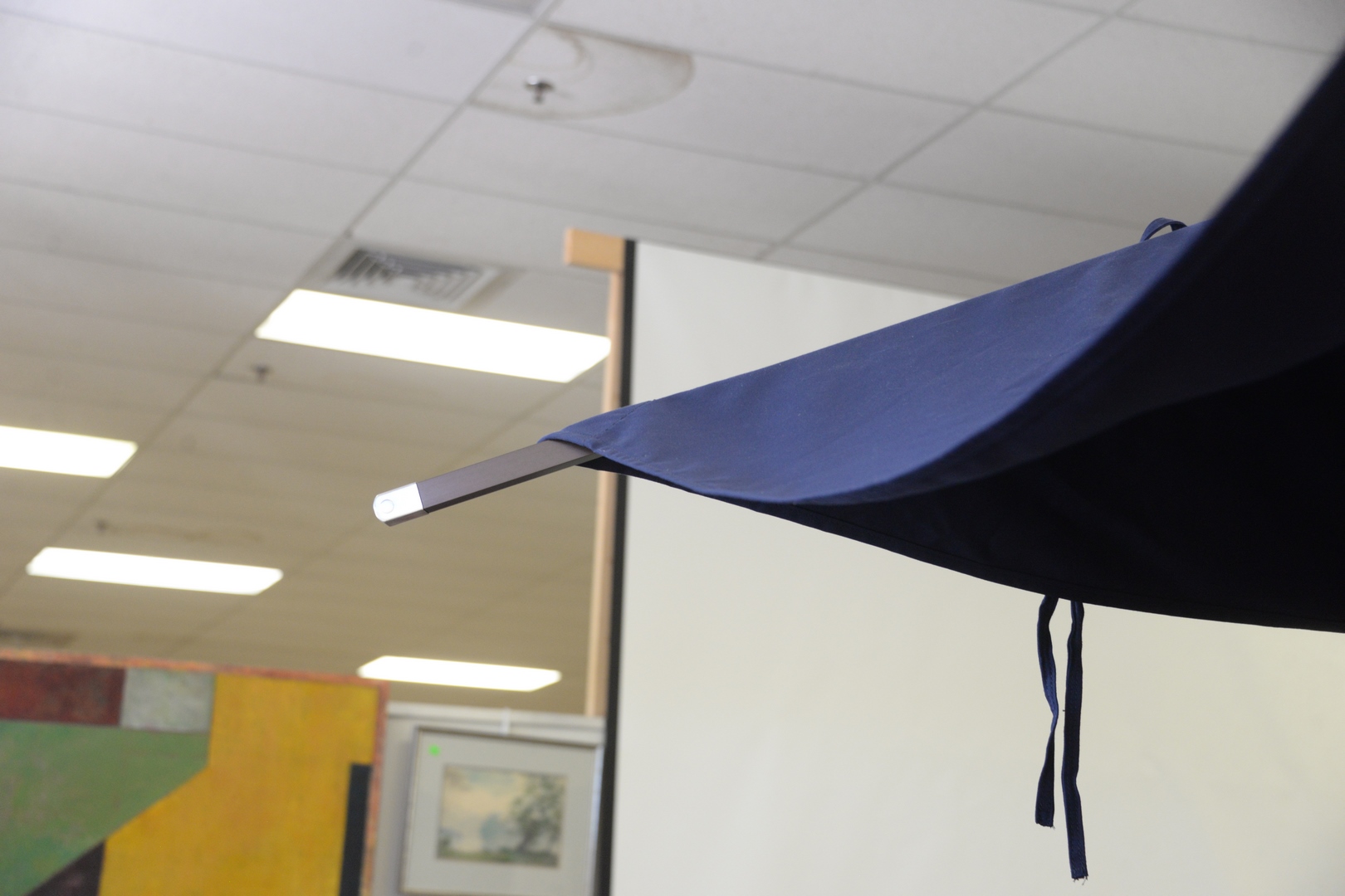 Large Rectangle Umbrella with Stand, navy blue fabric, possibly Sunbrella, 70″ x 120″ (as is). Provenance: David and Cynthia Kim, 22 Stoney Wylde Lane, Greenwich, Connecticut. View home by visiting: https://www.zillow.com/homedetails/22-Stoney-Wylde-Ln-Greenwich-CT-06830/177238281_zpid/