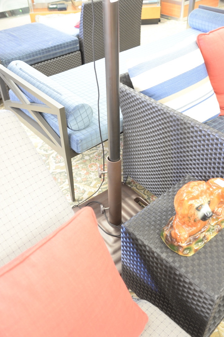 Lot 357: Large Rectangle Umbrella with Stand, navy blue fabric, possibly Sunbrella, 70″ x 120″ (as is). Provenance: David and Cynthia Kim, 22 Stoney Wylde Lane, Greenwich, Connecticut. View home by visiting: https://www.zillow.com/homedetails/22-Stoney-Wylde-Ln-Greenwich-CT-06830/177238281_zpid/