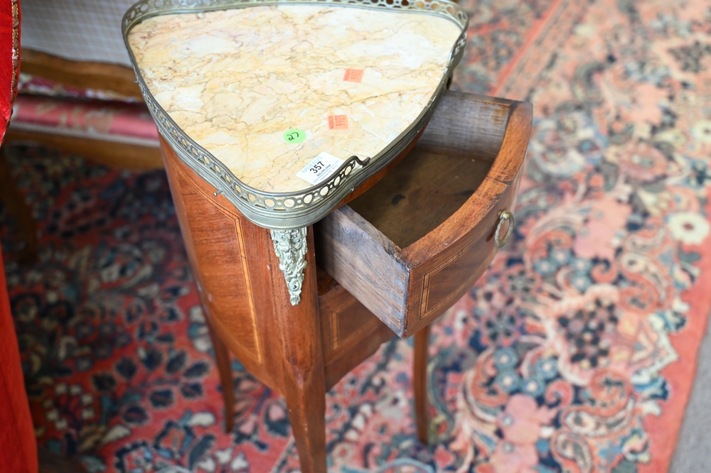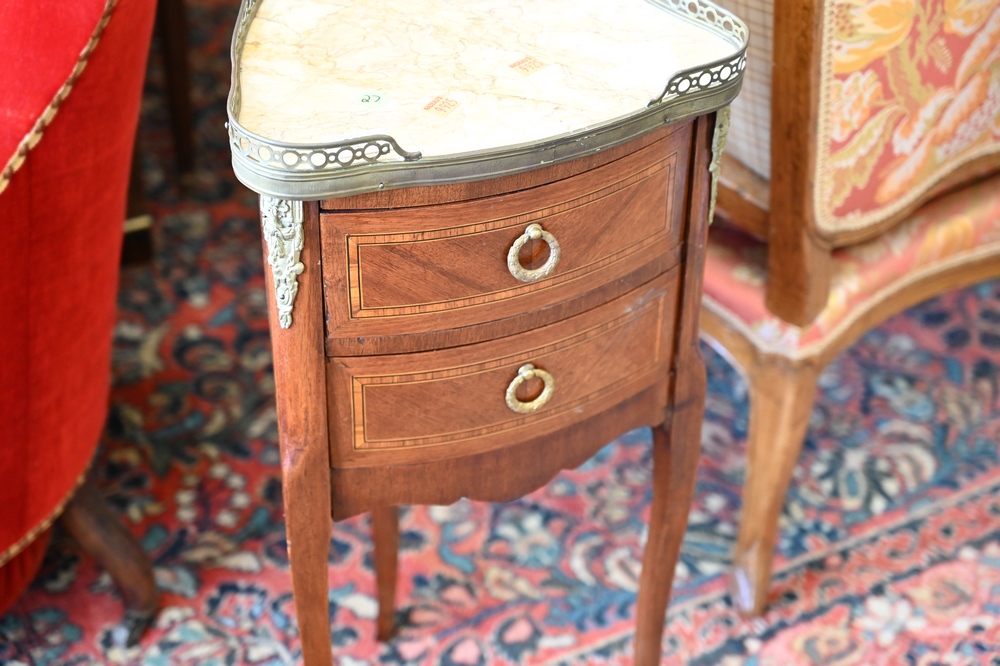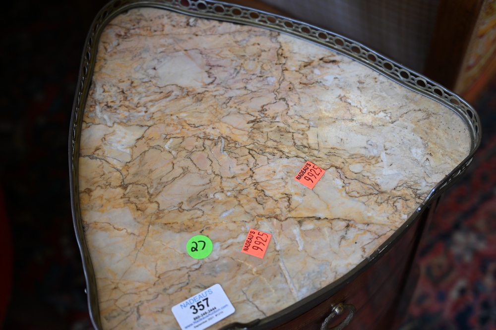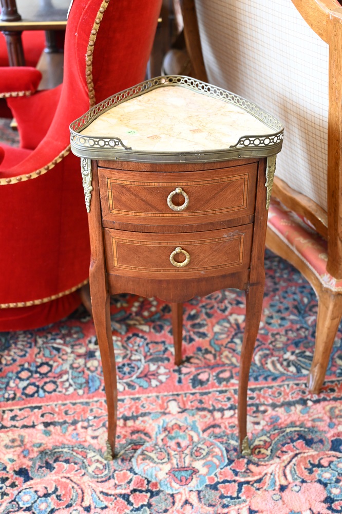 Lot 357: Louis XV Style Stand, having marble top with gallery over two inlaid drawers over three cabriole legs having brass mounts, height 28 1/2 inches.