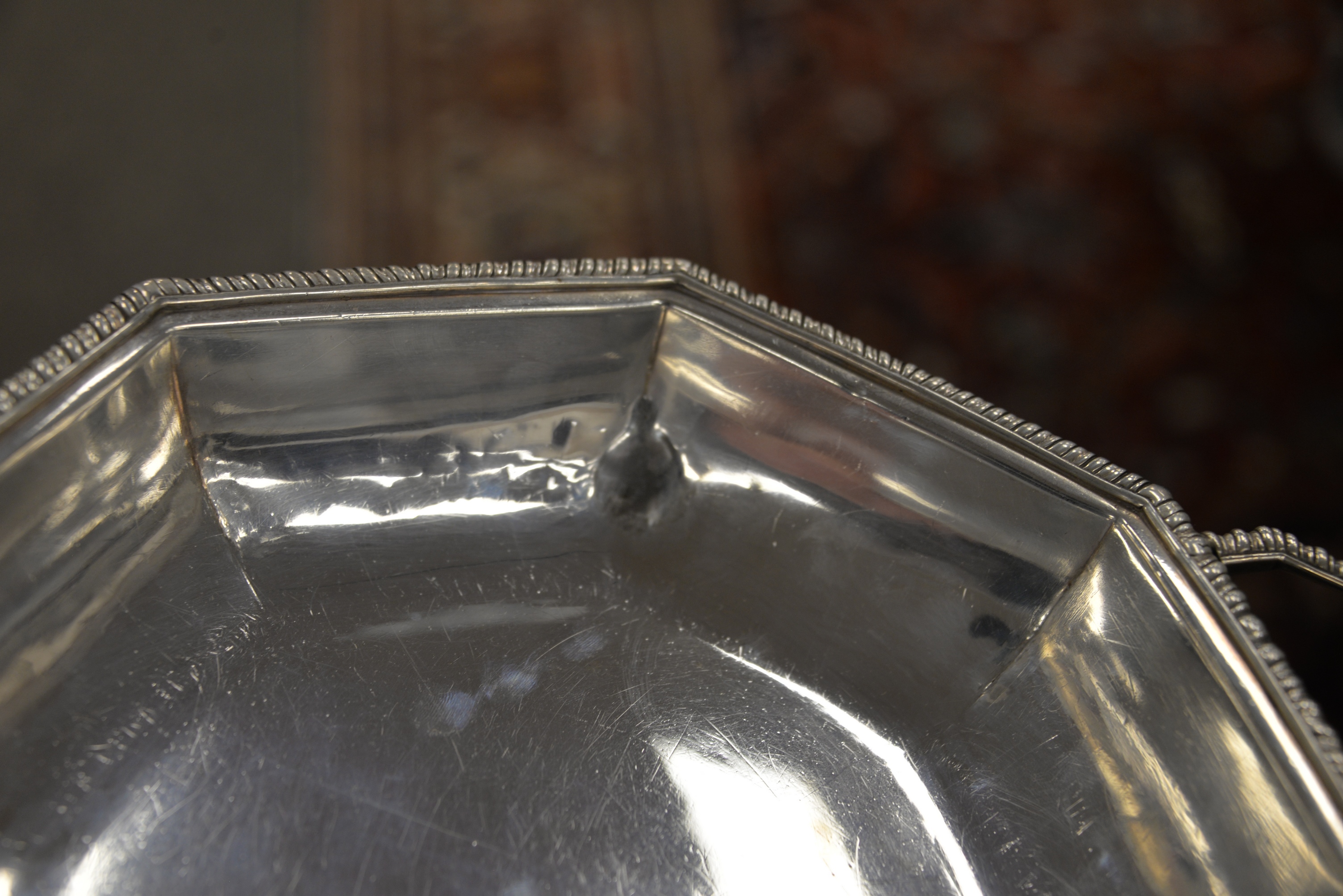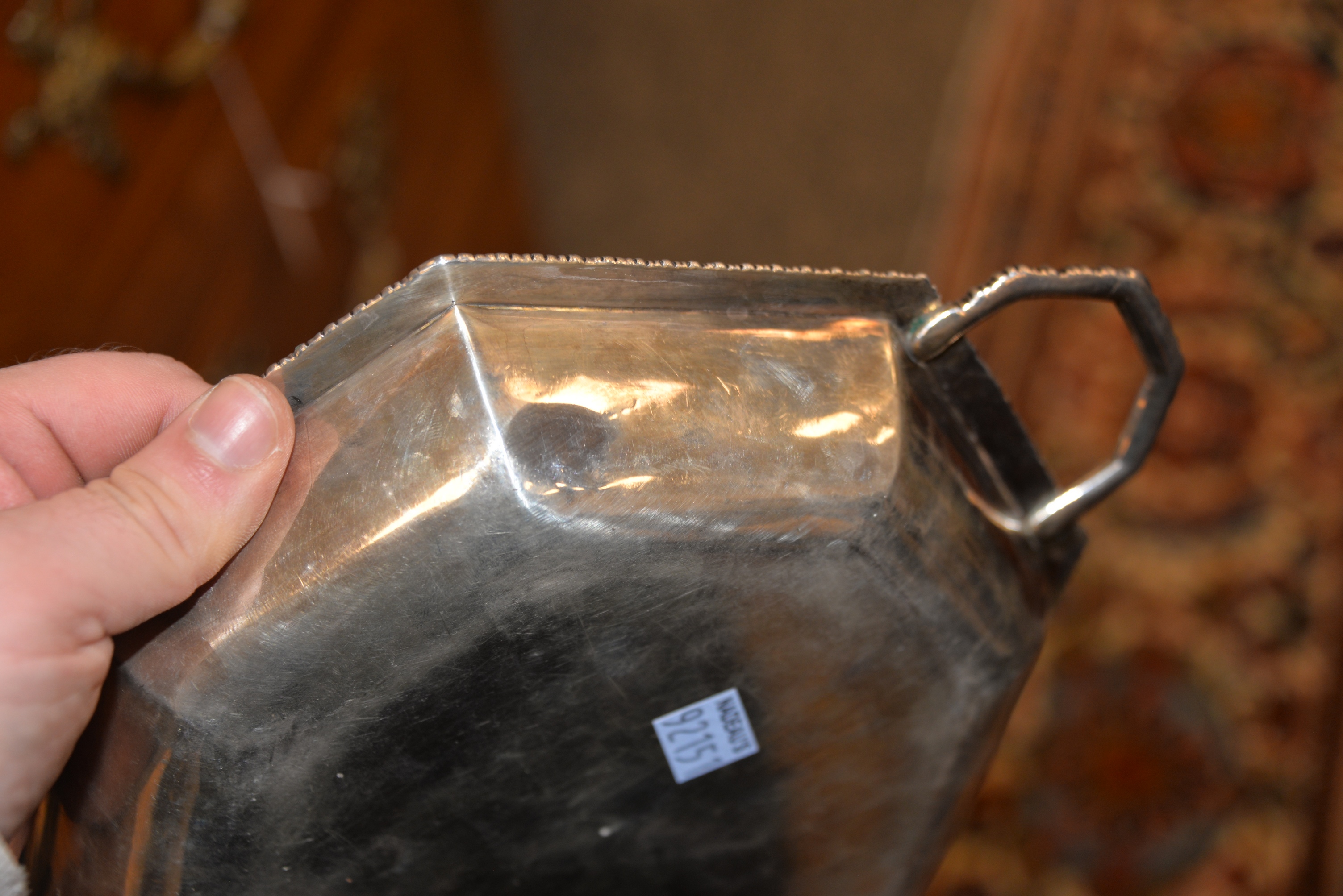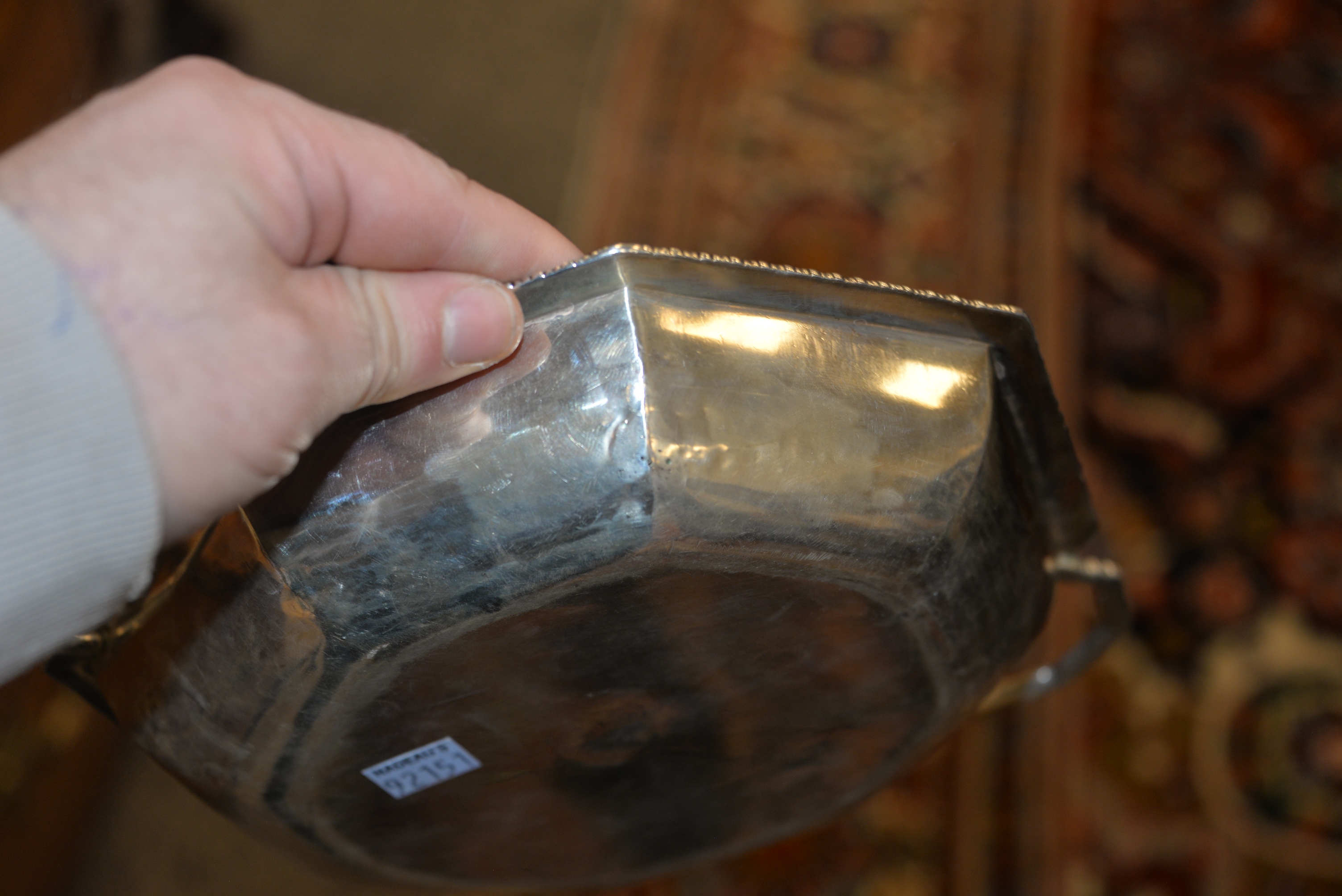 eight sided, having double handles, floral chasing around pointed domed lid, both with dog engraving on lid