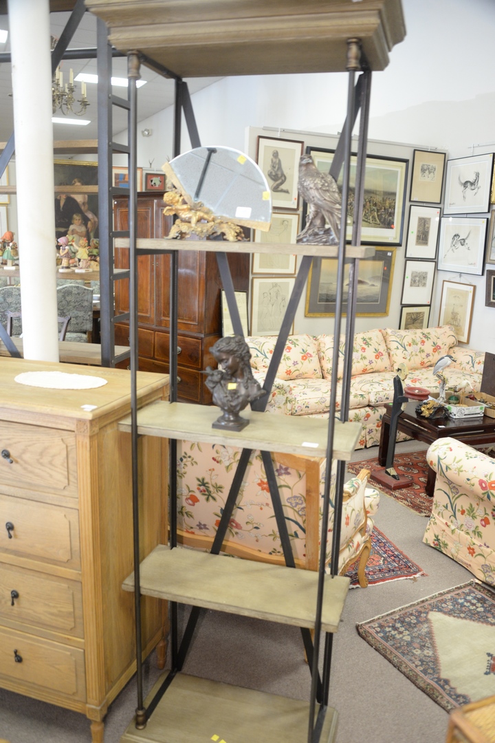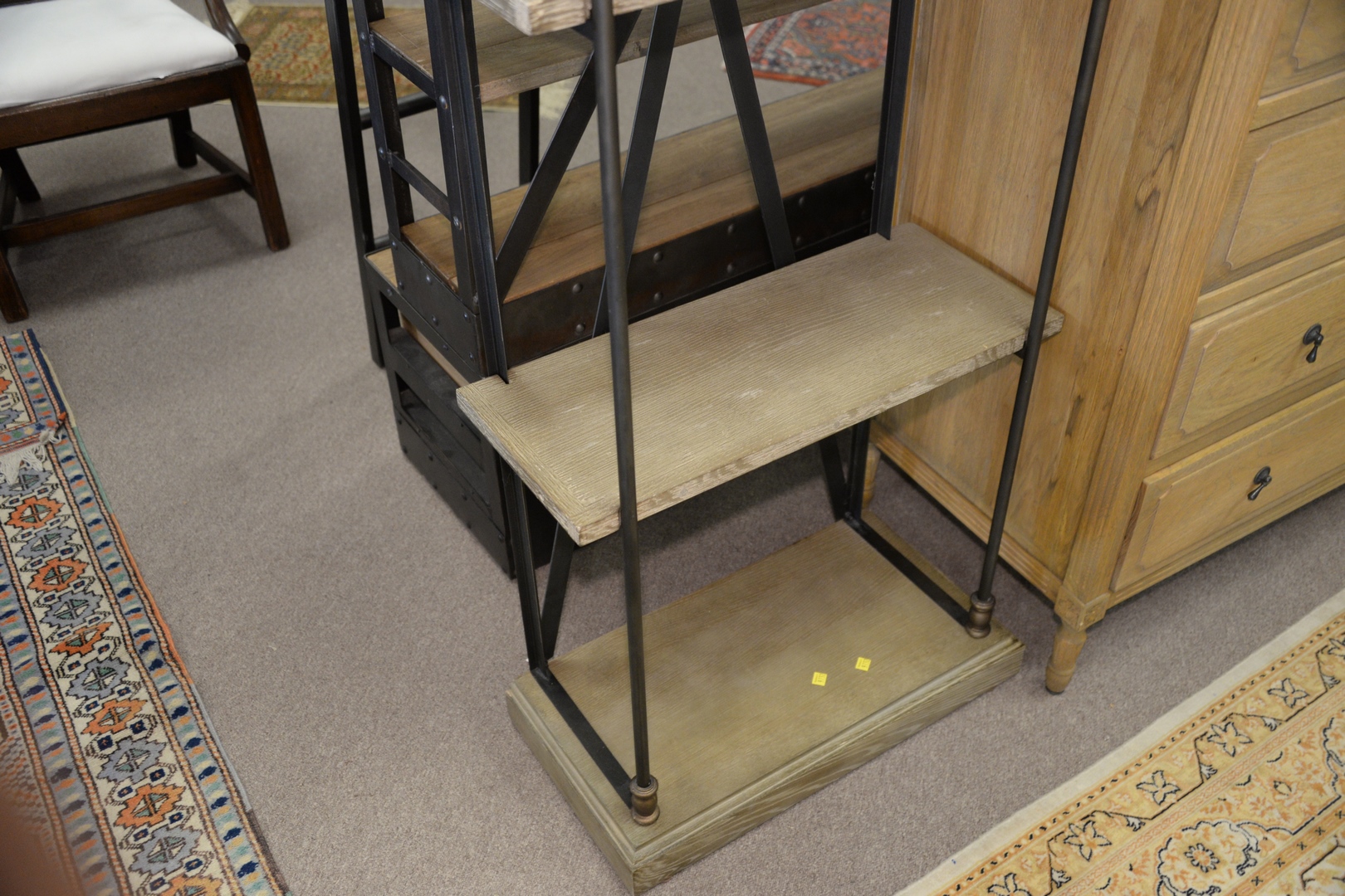 Lot 357: Pair Restoration Hardware Contemporary Iron and Oak Etageres height 84 inches, width 28 1/2 inches