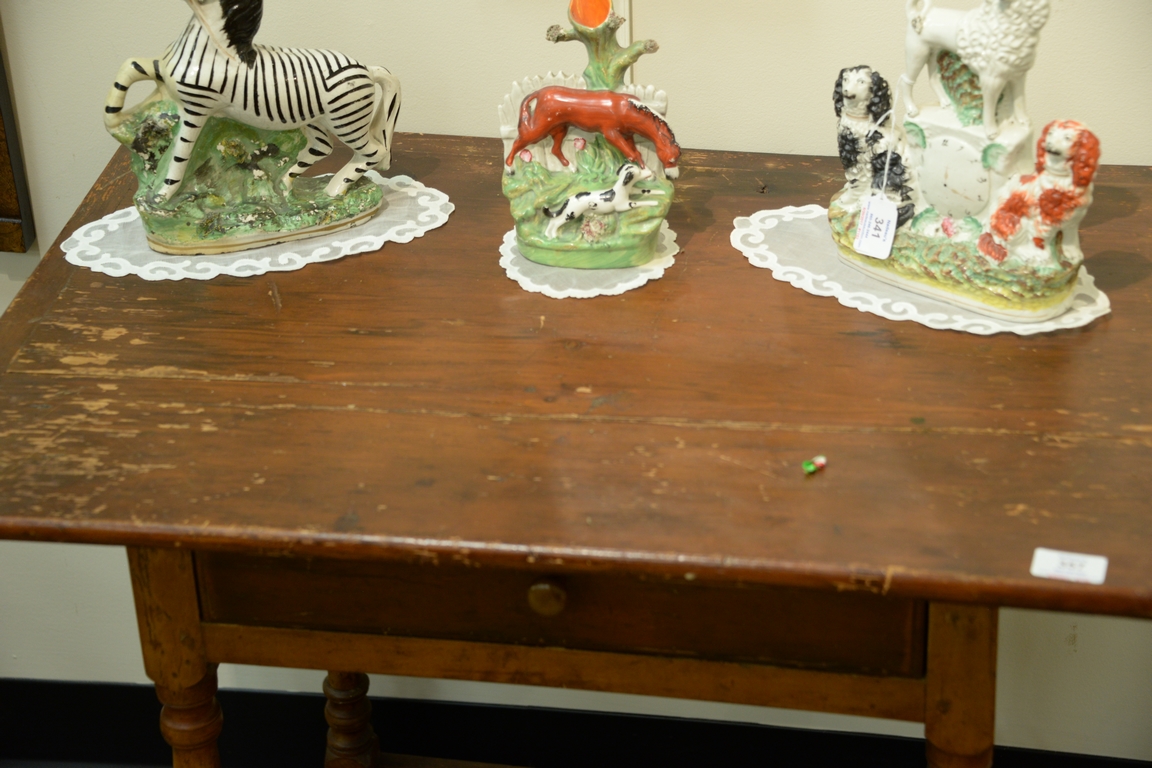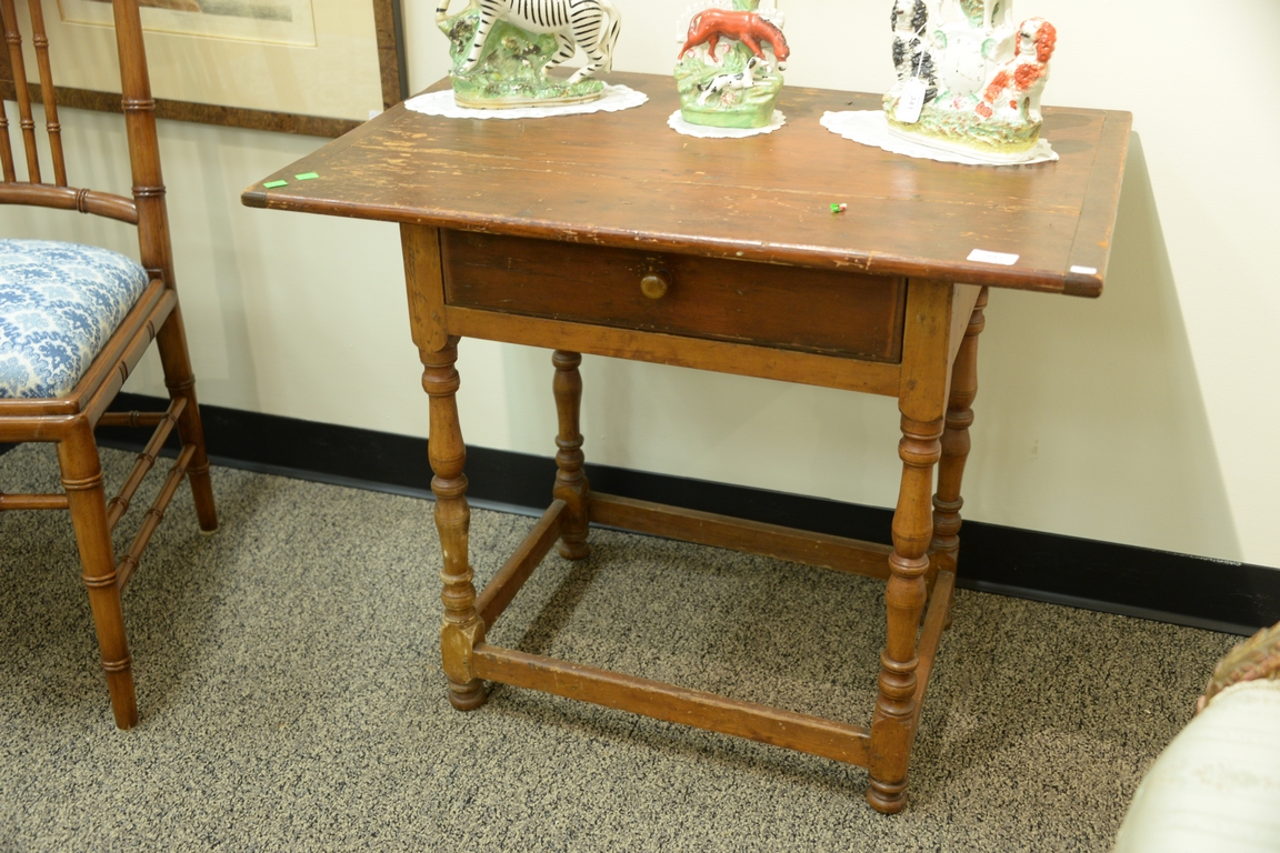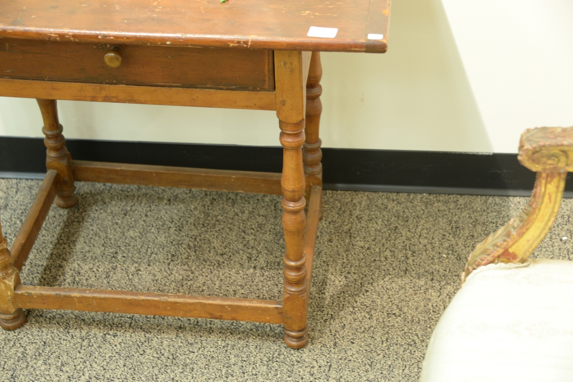 Lot 357: Primitive tavern table with breadboard top and drawer on turned legs, early 18th century feet added. ht. 26 1/2in., top: 22 x 32