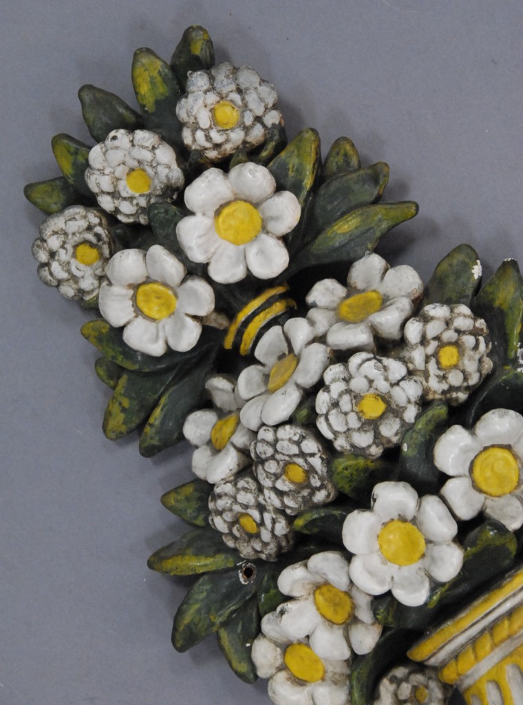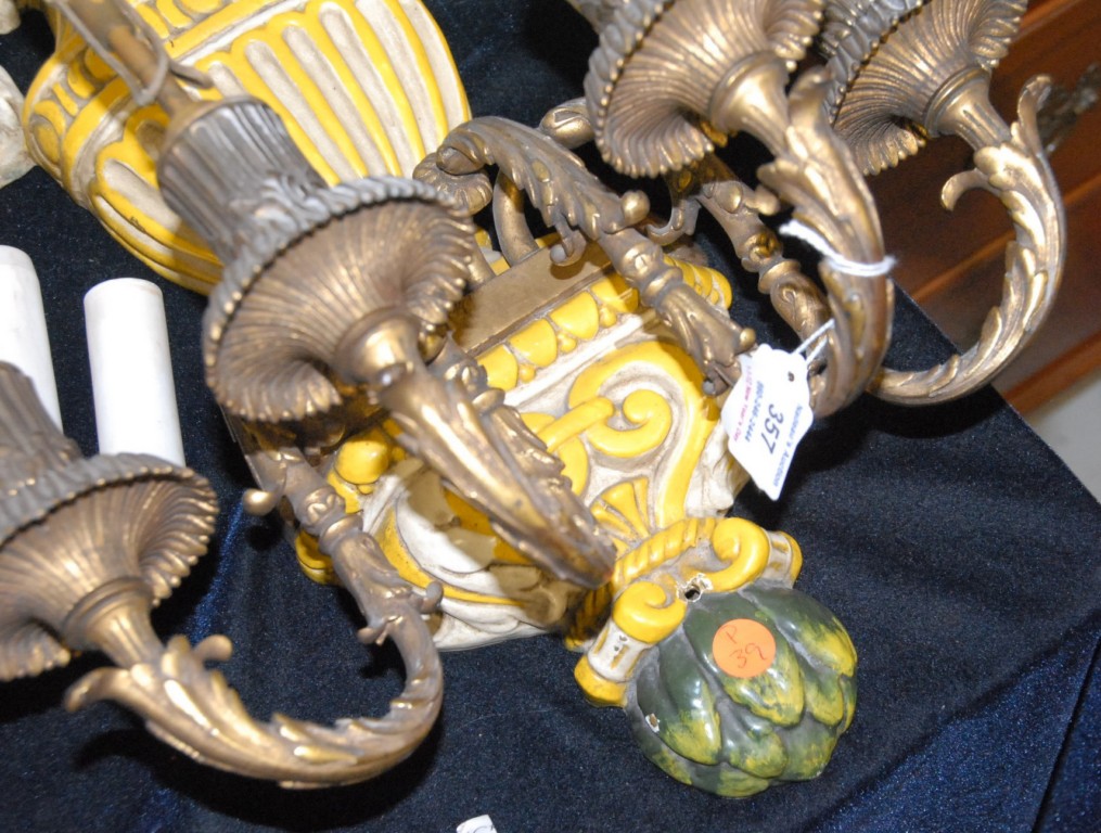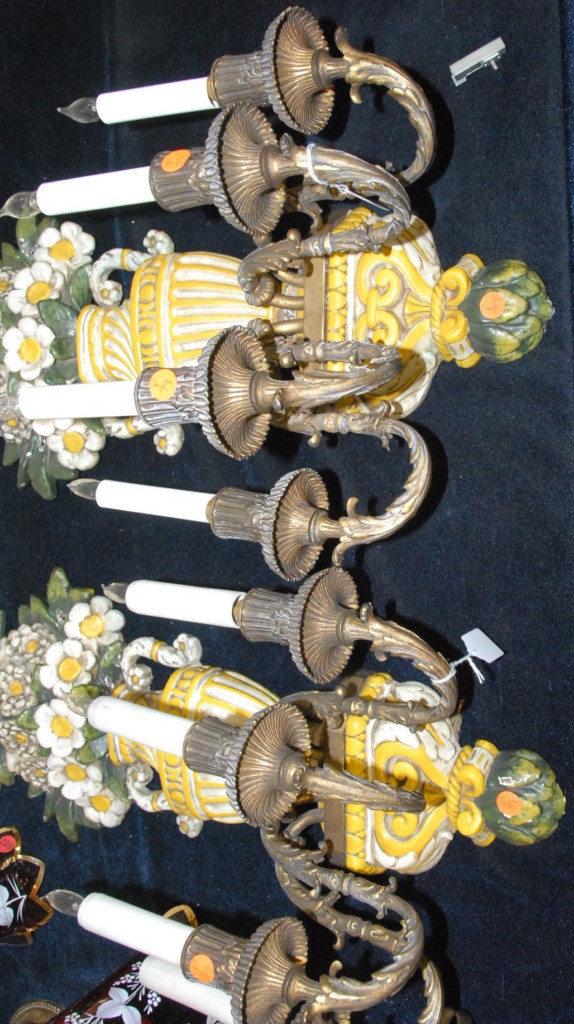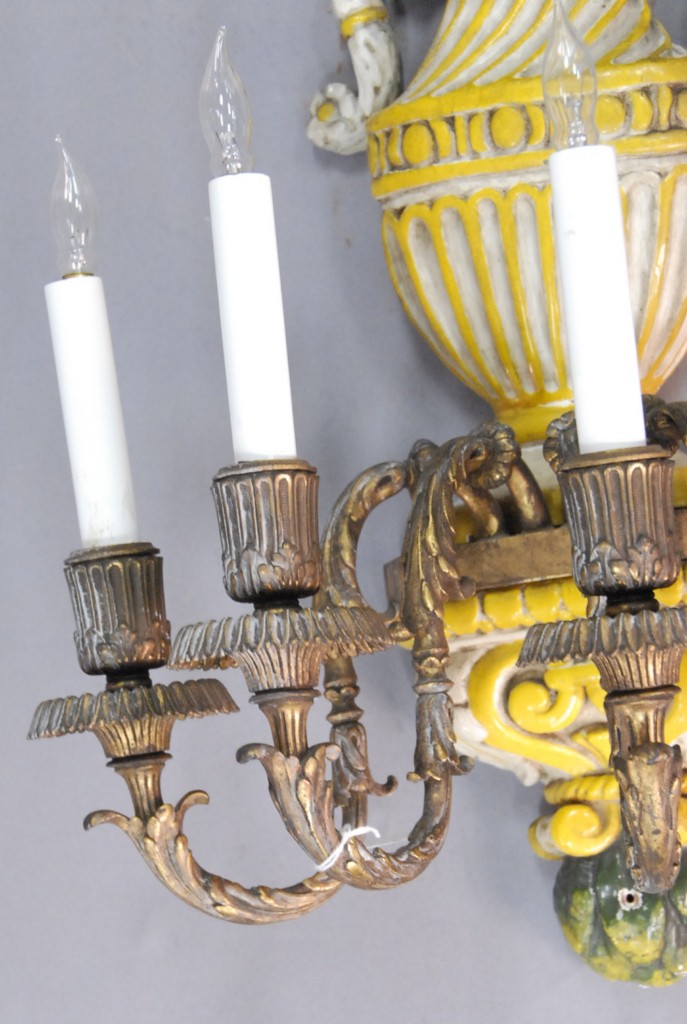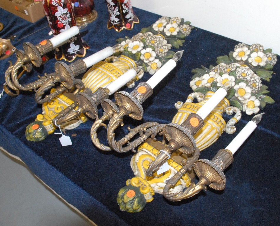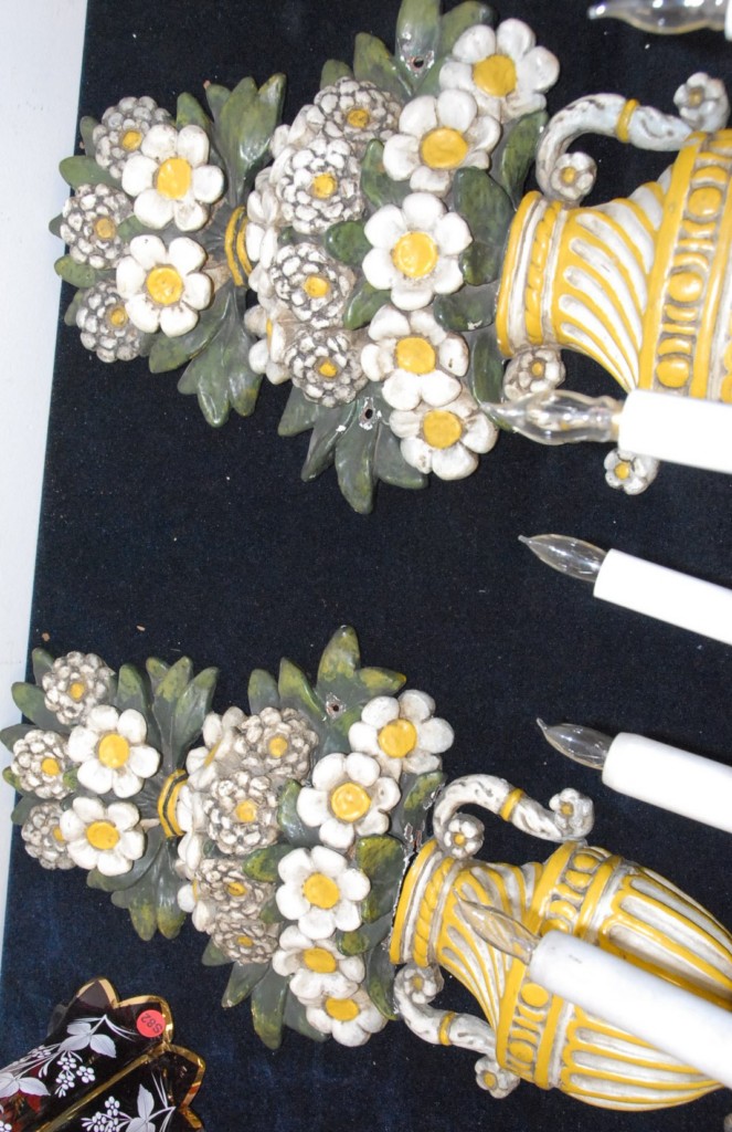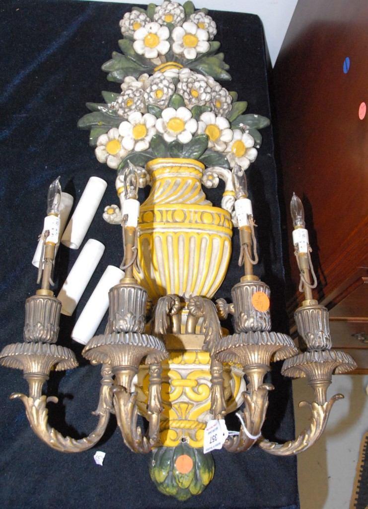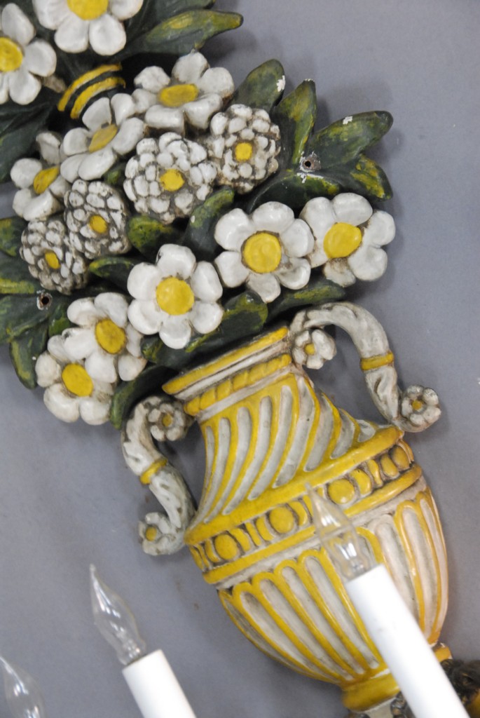 Set of four embossed Caldwell sconces, decorated in yellow, white, and green enameled flowers, each with four lights. height 30in.