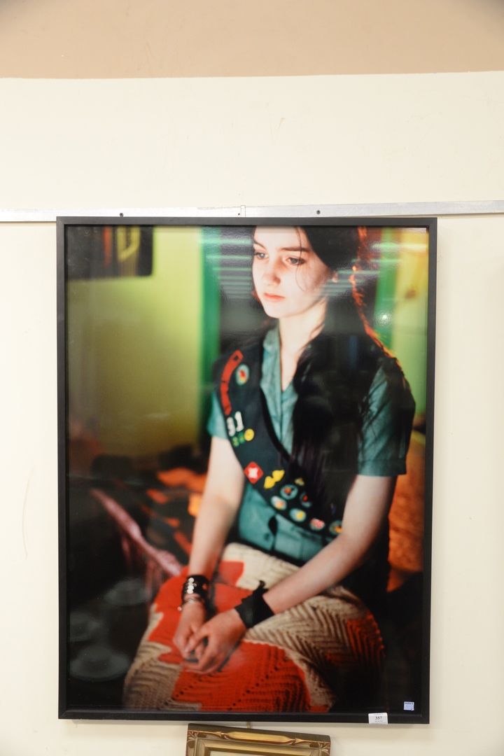 Lot 357: Sue de Beer (American, b. 1973), Still from Disappear Here (Meghan Lunch – Red Blanket), oversized dye coupler, retails for $5,500, 40″ x 60″.