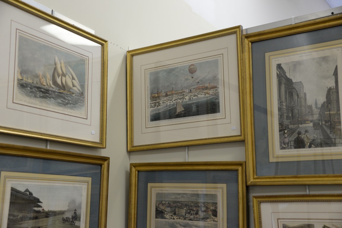 Ten piece lot to include a set of nine Harper’s Weekly hand colored lithographs along with one Frank Leslie’s Illustrated Newspaper hand colored lithograph, framed and matted by Wesley Allen Framemakers and Fred Eric’s Frame Studio, Inc.. sight size: 10 x 15 and 15 x 10. Property from Credit Suisse’s Americana Collection