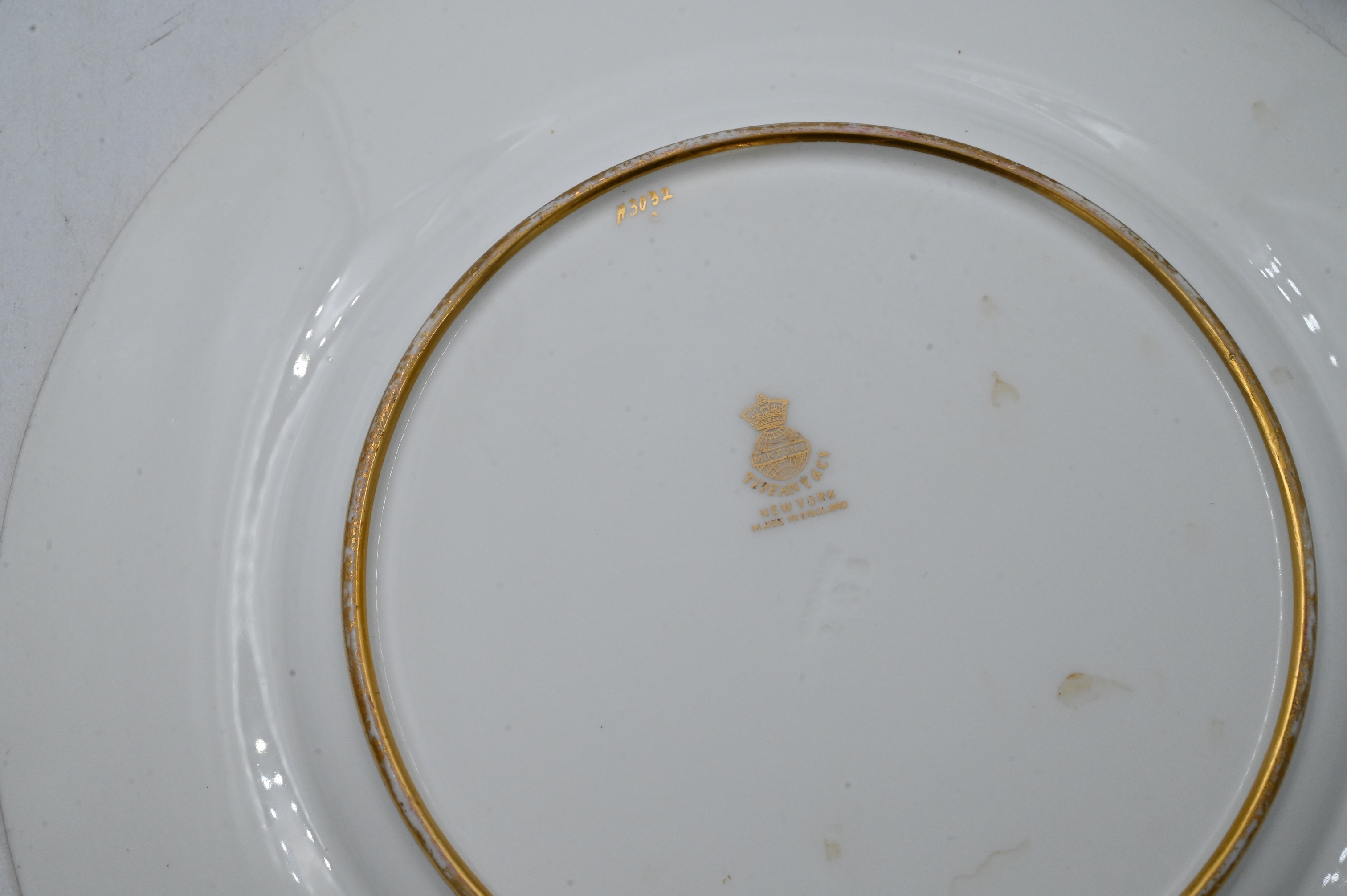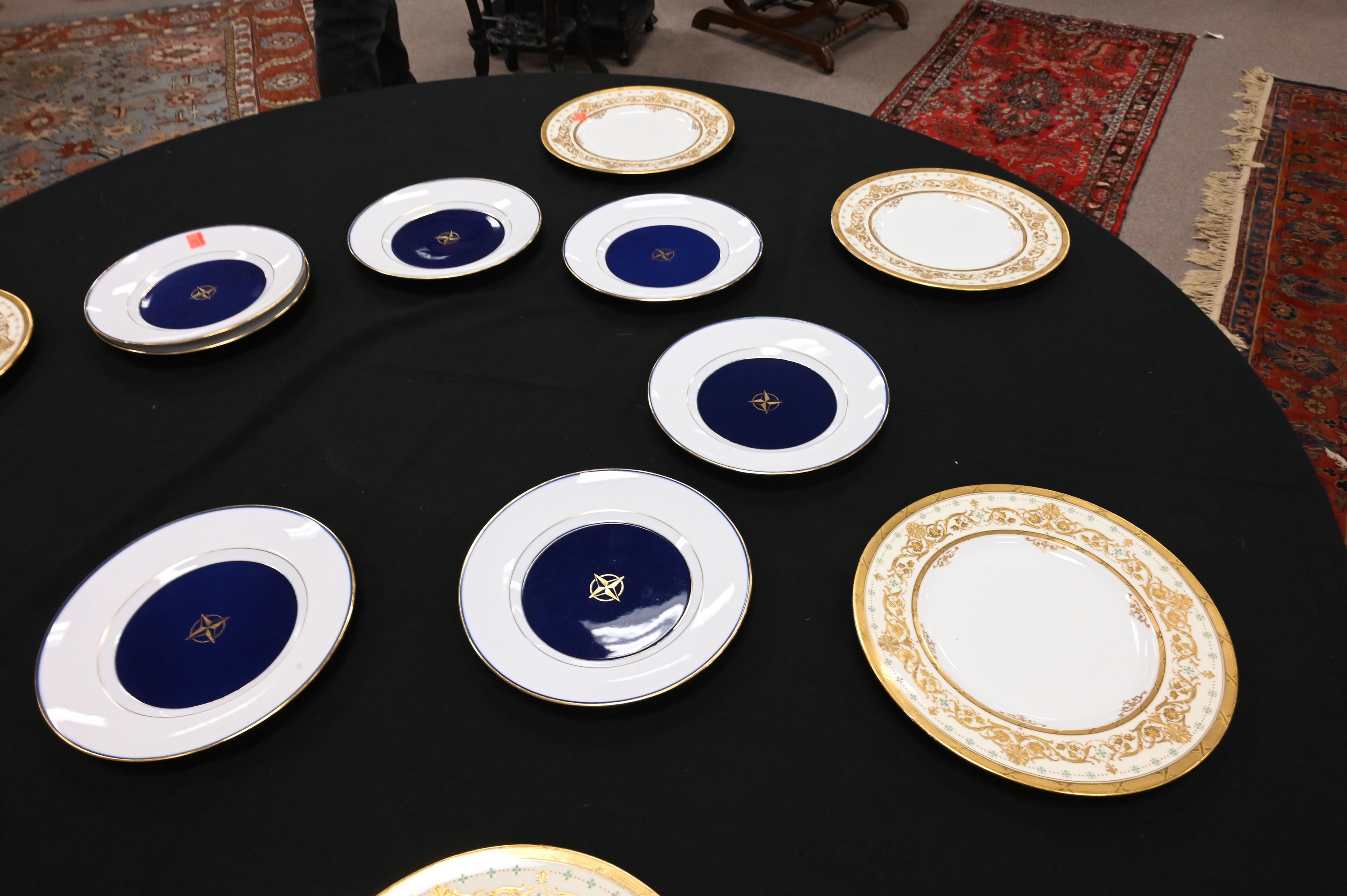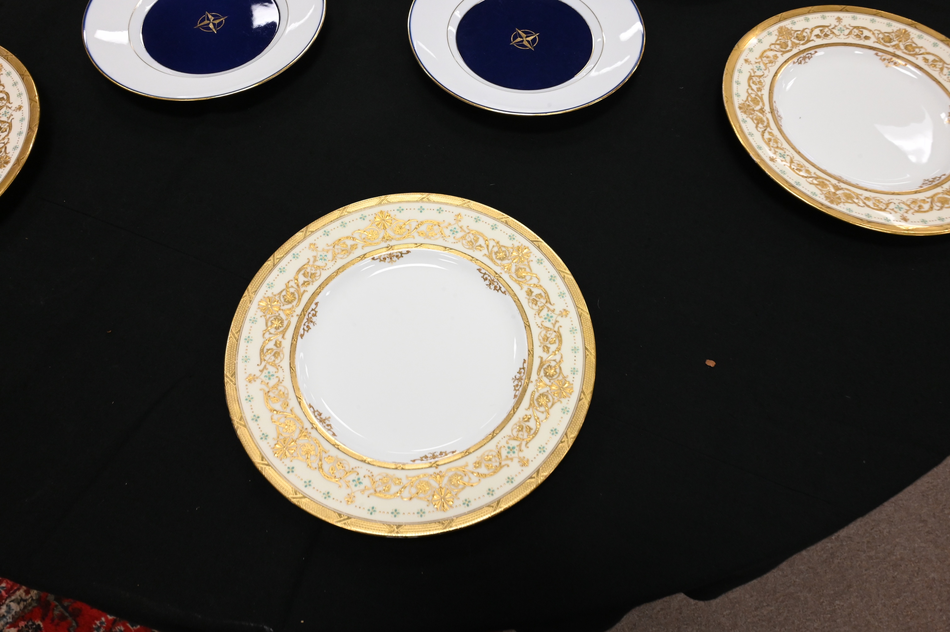 to include 24 Royal Copenhagen cobalt blue and compass motif, as well as Minton Tiffany dinner plates having high gilt relief and turquoise accents