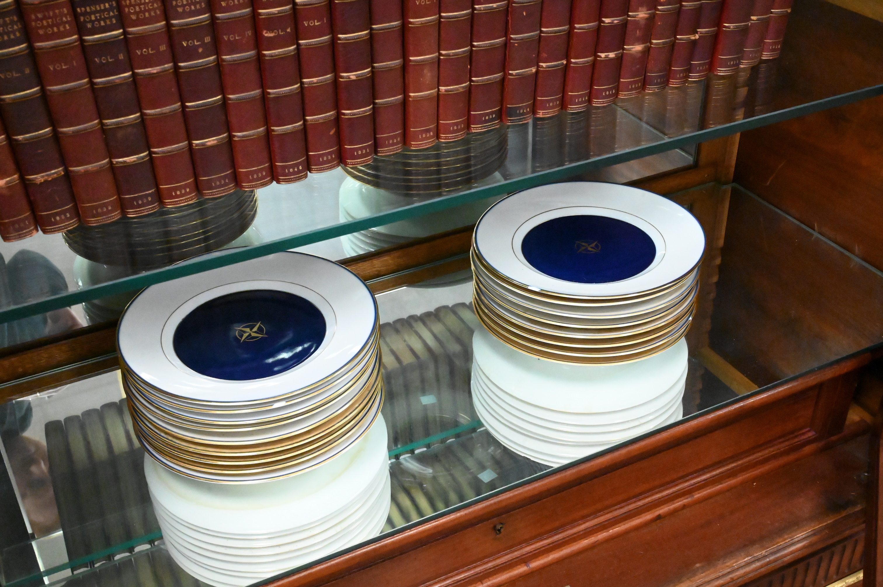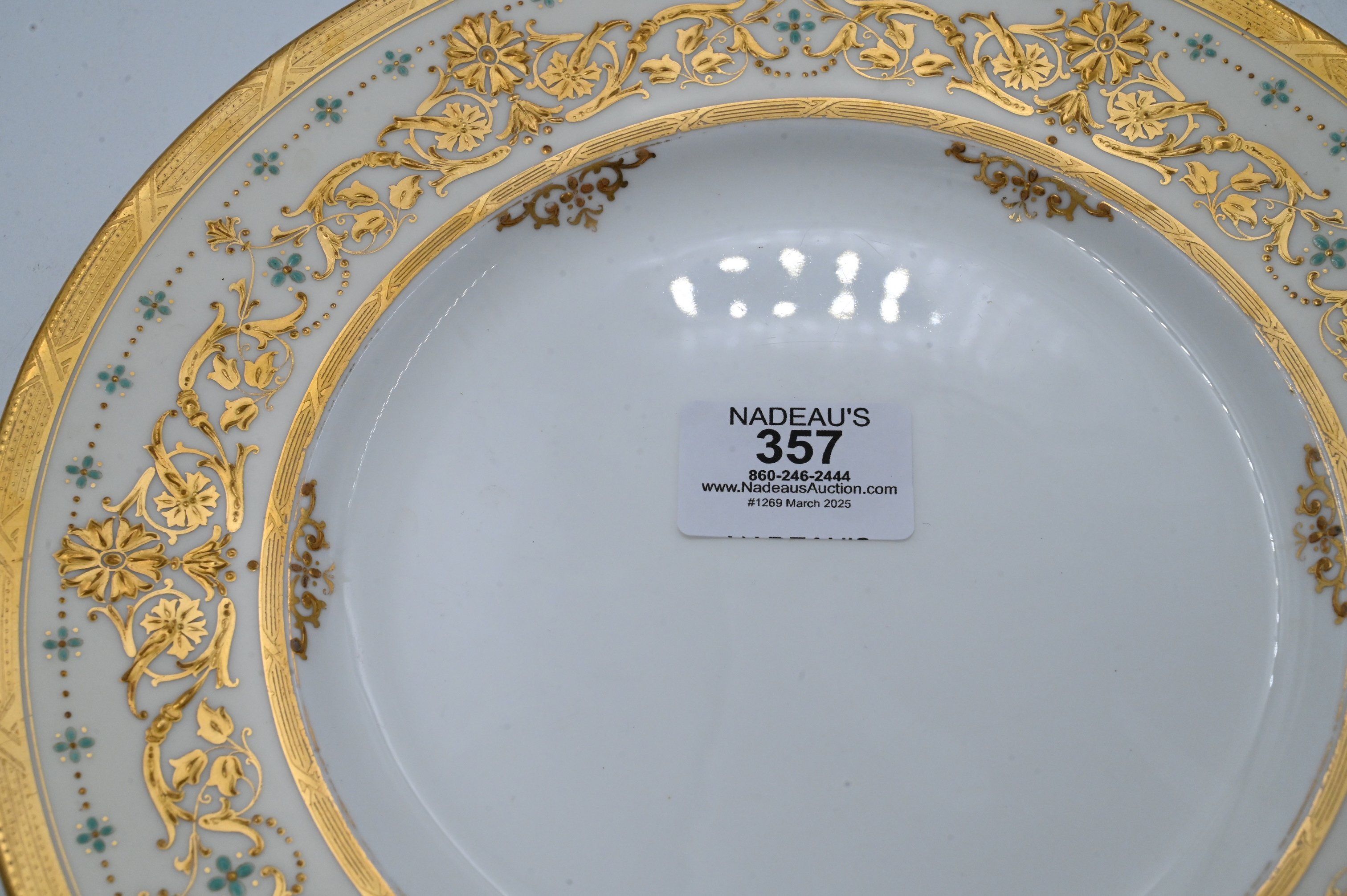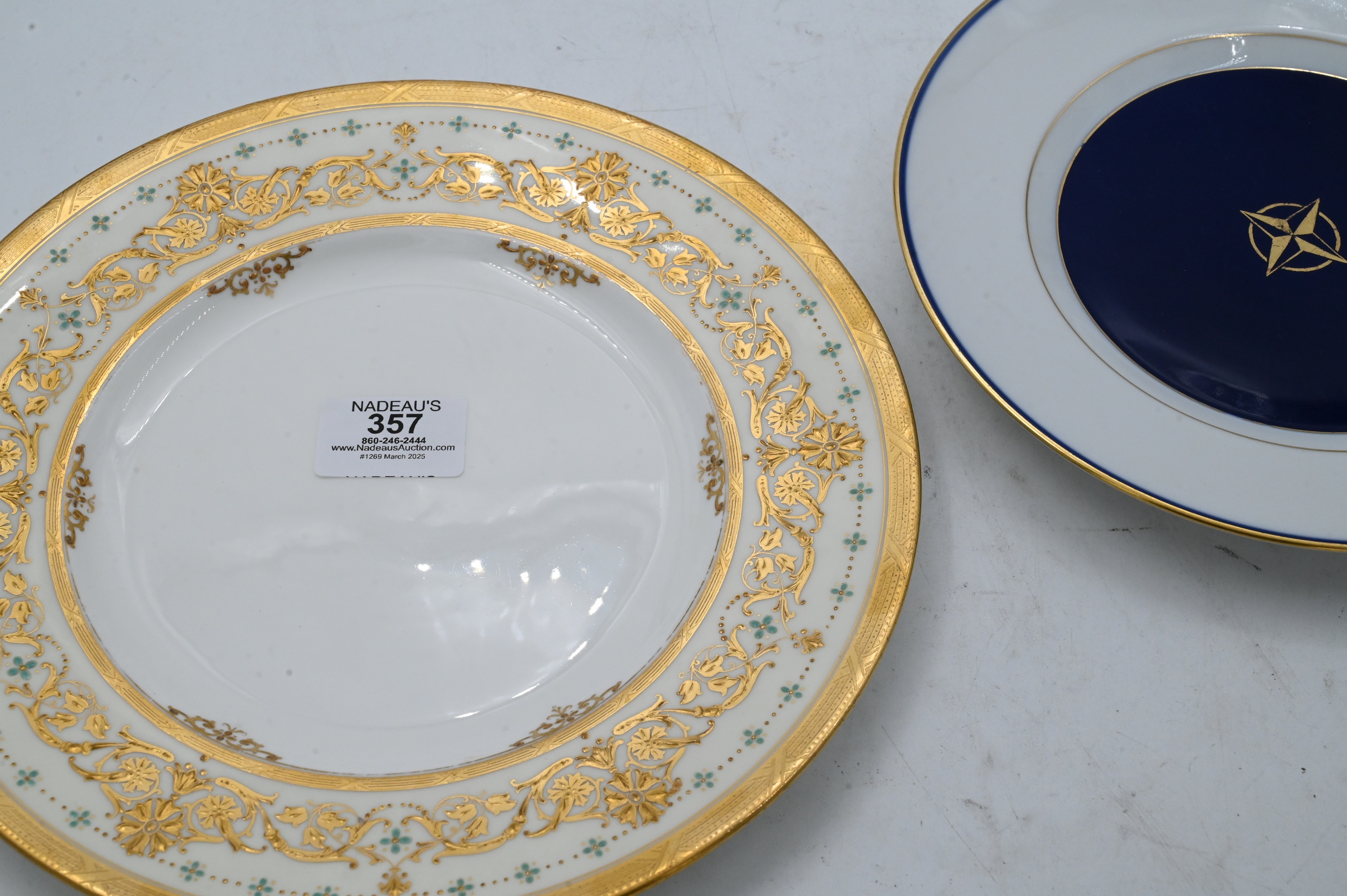 to include 24 Royal Copenhagen cobalt blue and compass motif, as well as Minton Tiffany dinner plates having high gilt relief and turquoise accents