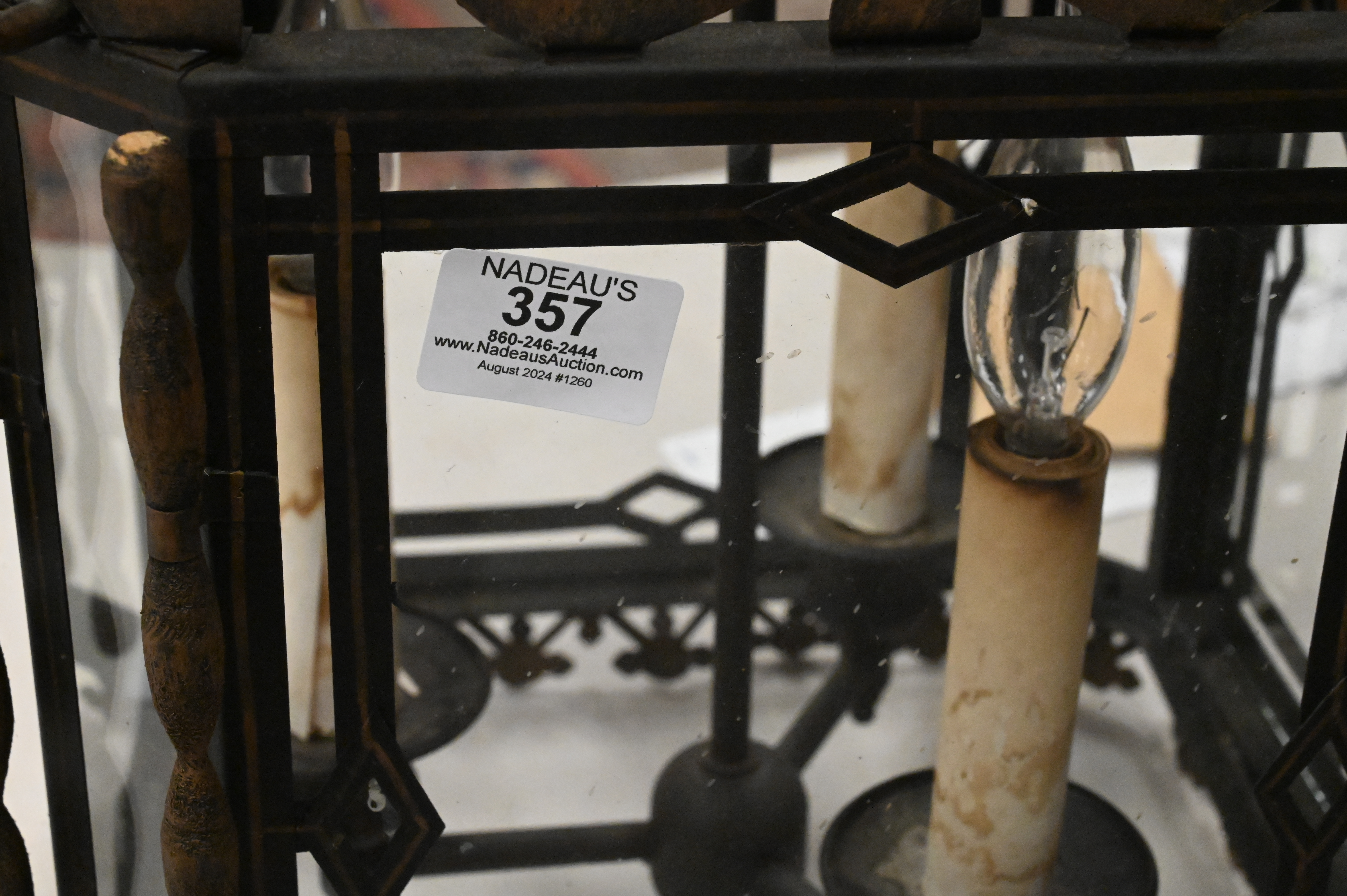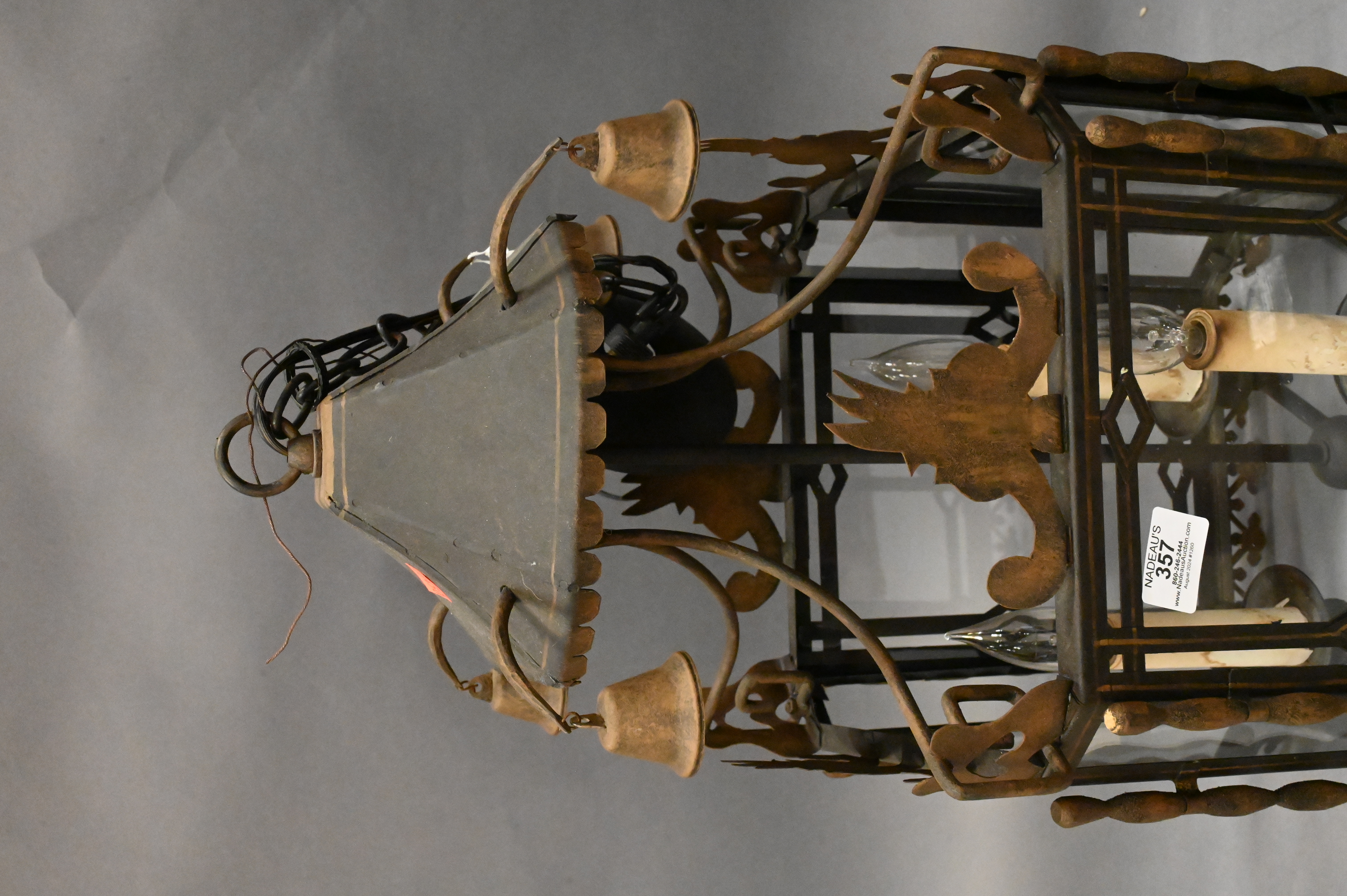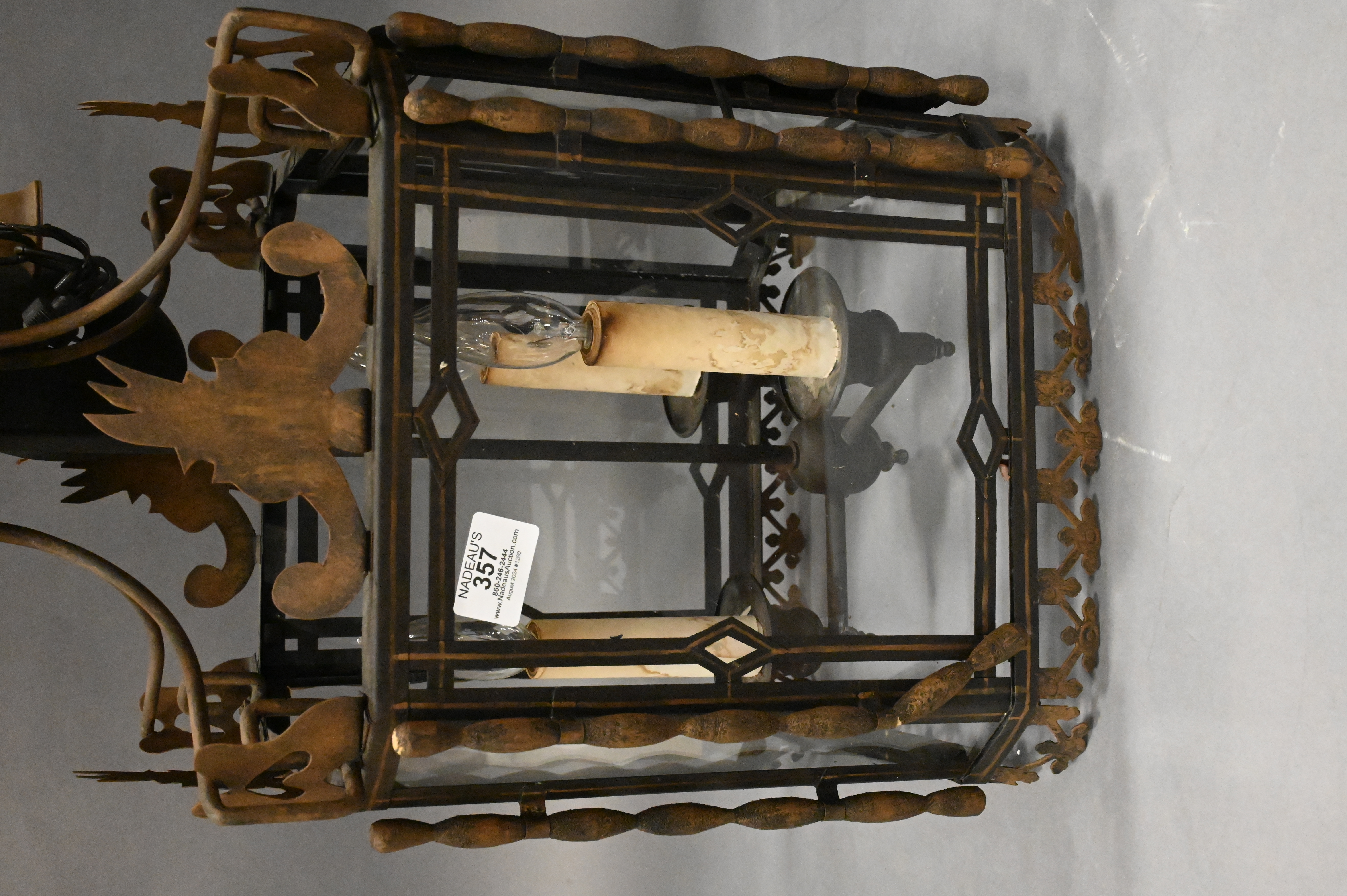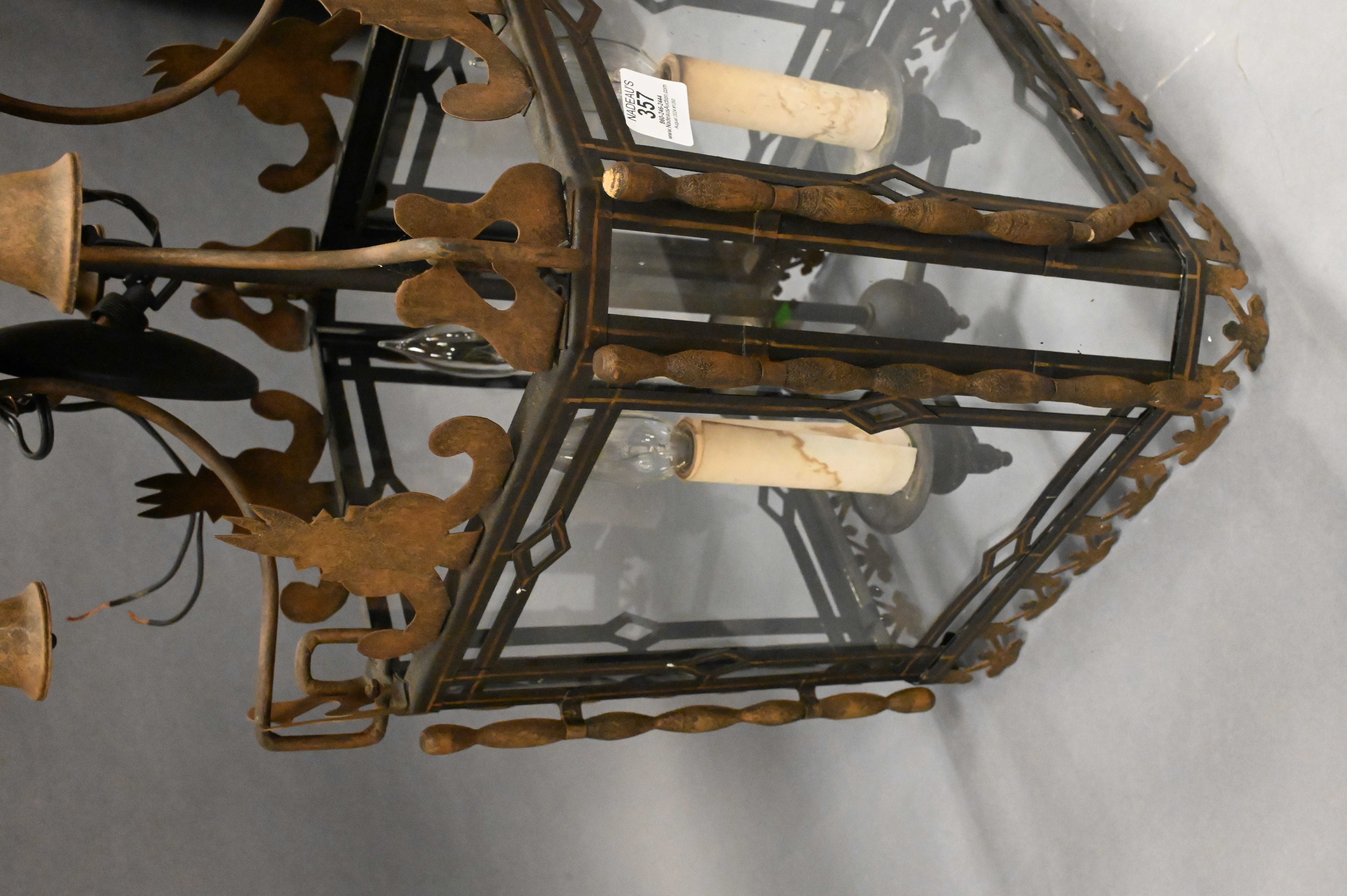 Lot 357: Wrought Iron Metal and Glass Hanging Lantern Light